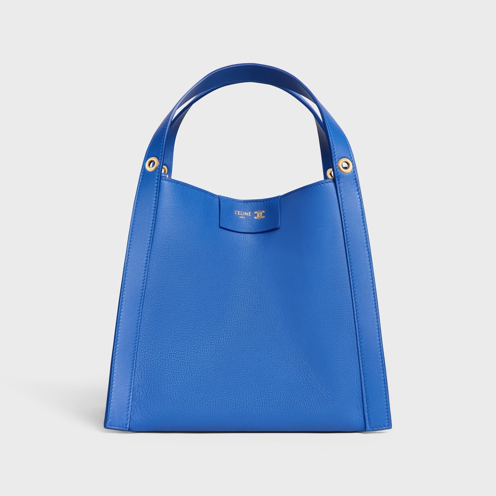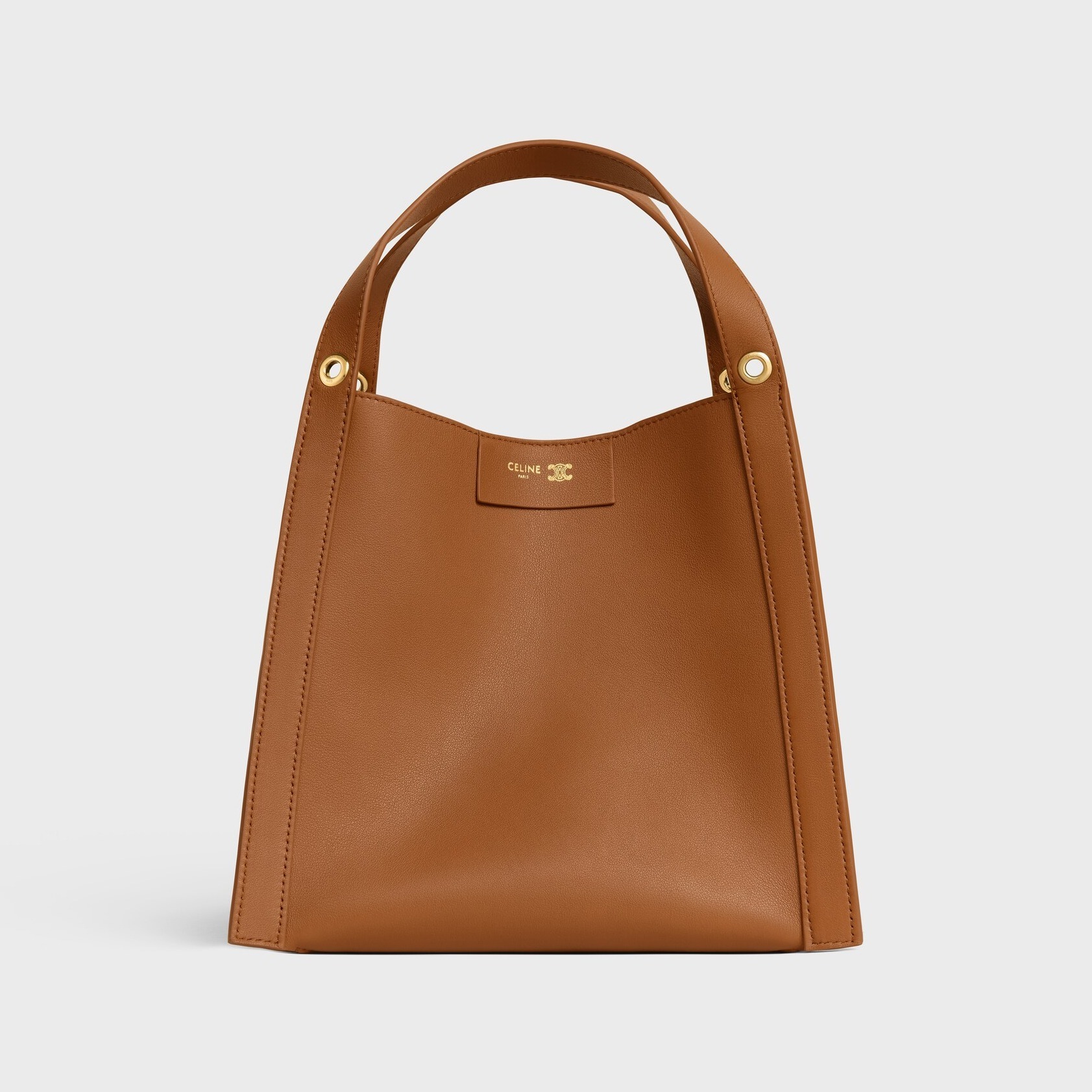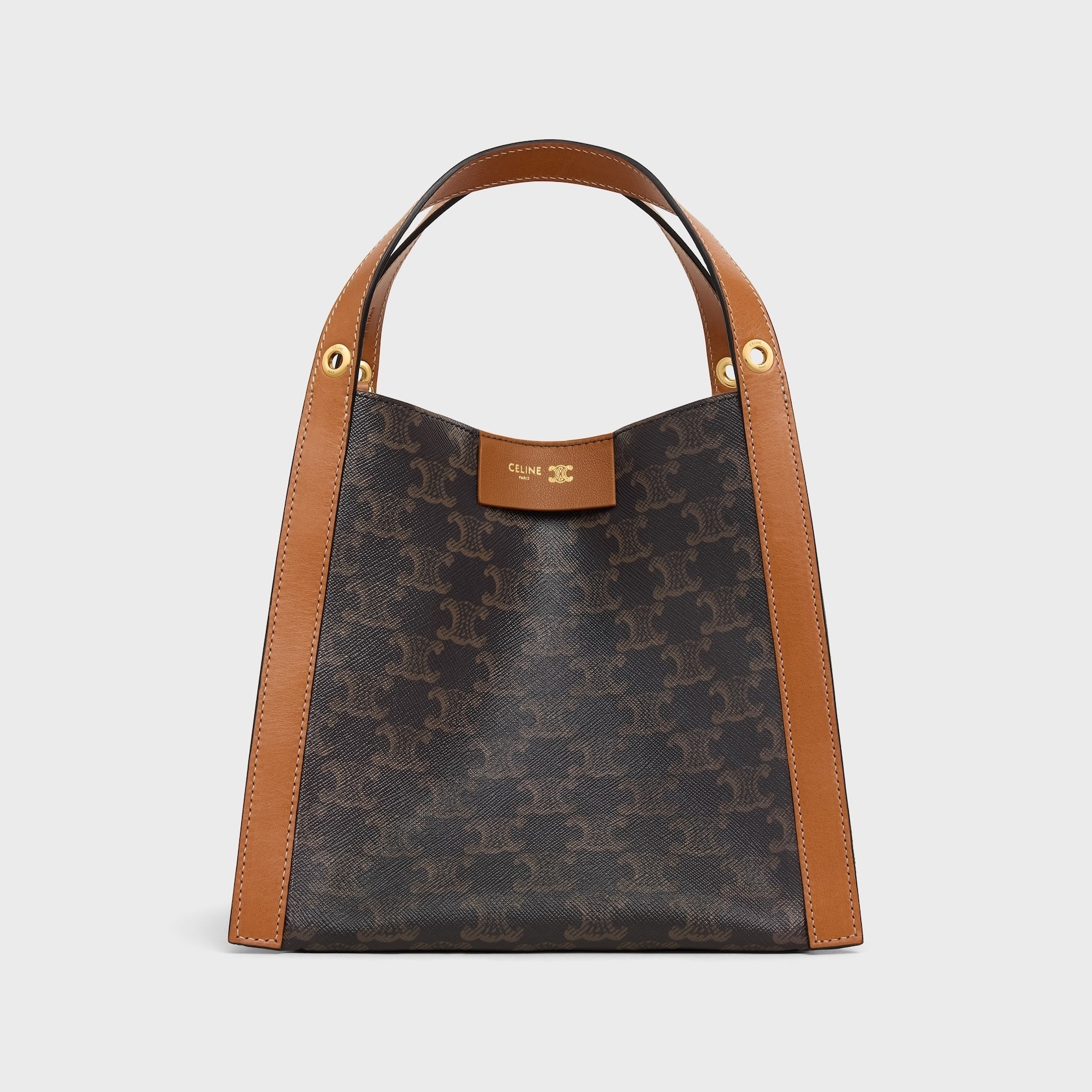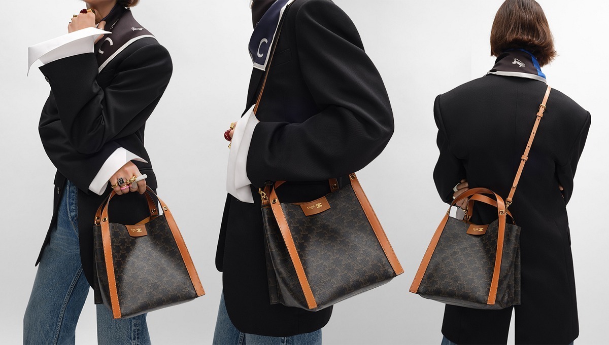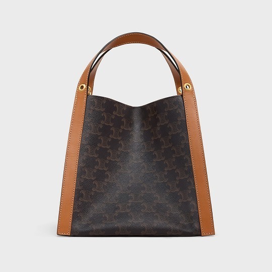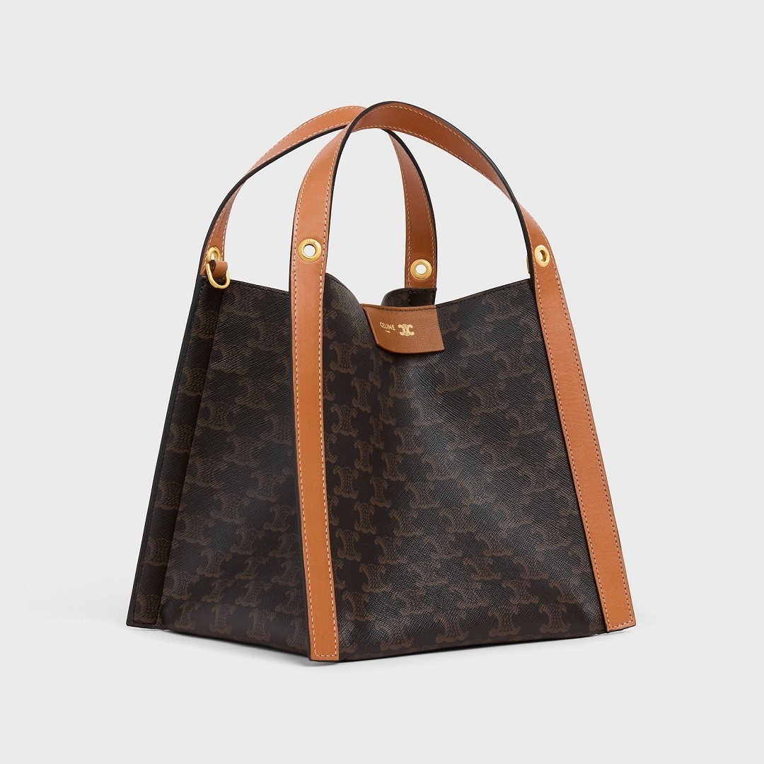 「Cubo」在法语中意为立方体,直白又生动地描述出包包的结构。小号 Cubo 手袋采用 18.5x21x17cm 的立方形水桶结构,皮革边框从底部一直延伸至手柄,勾勒出流畅的几何线条。蜂蜜色 Triomphe 标志印花款拼接棕色小牛皮边框,包口四角各设有一个金属环镂孔,用于装点个性挂饰。正面烫金皮标作为点睛,内侧暗扣提升安全系数,可拆卸肩带实现单肩和斜挎背法。