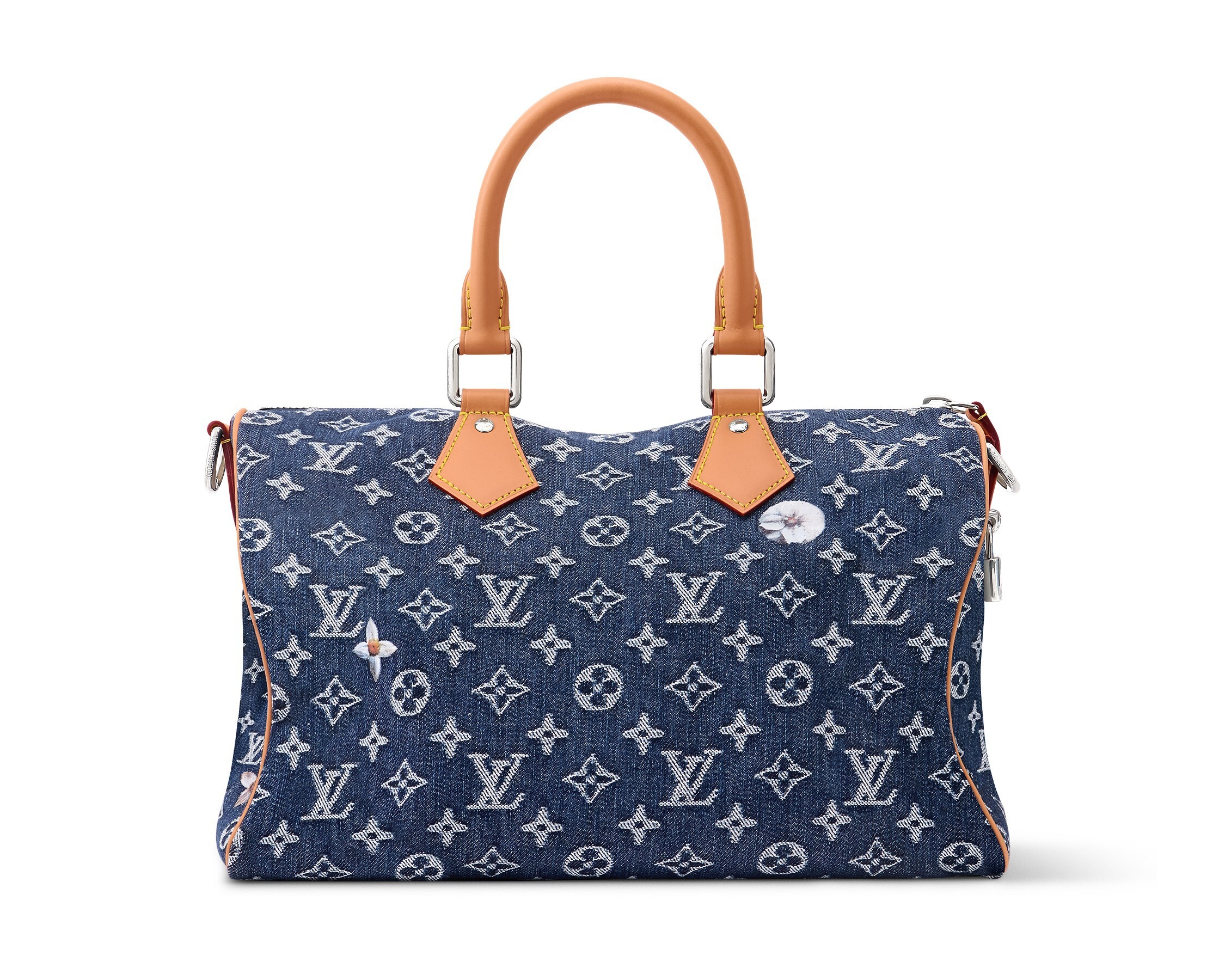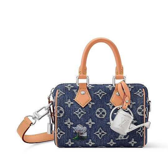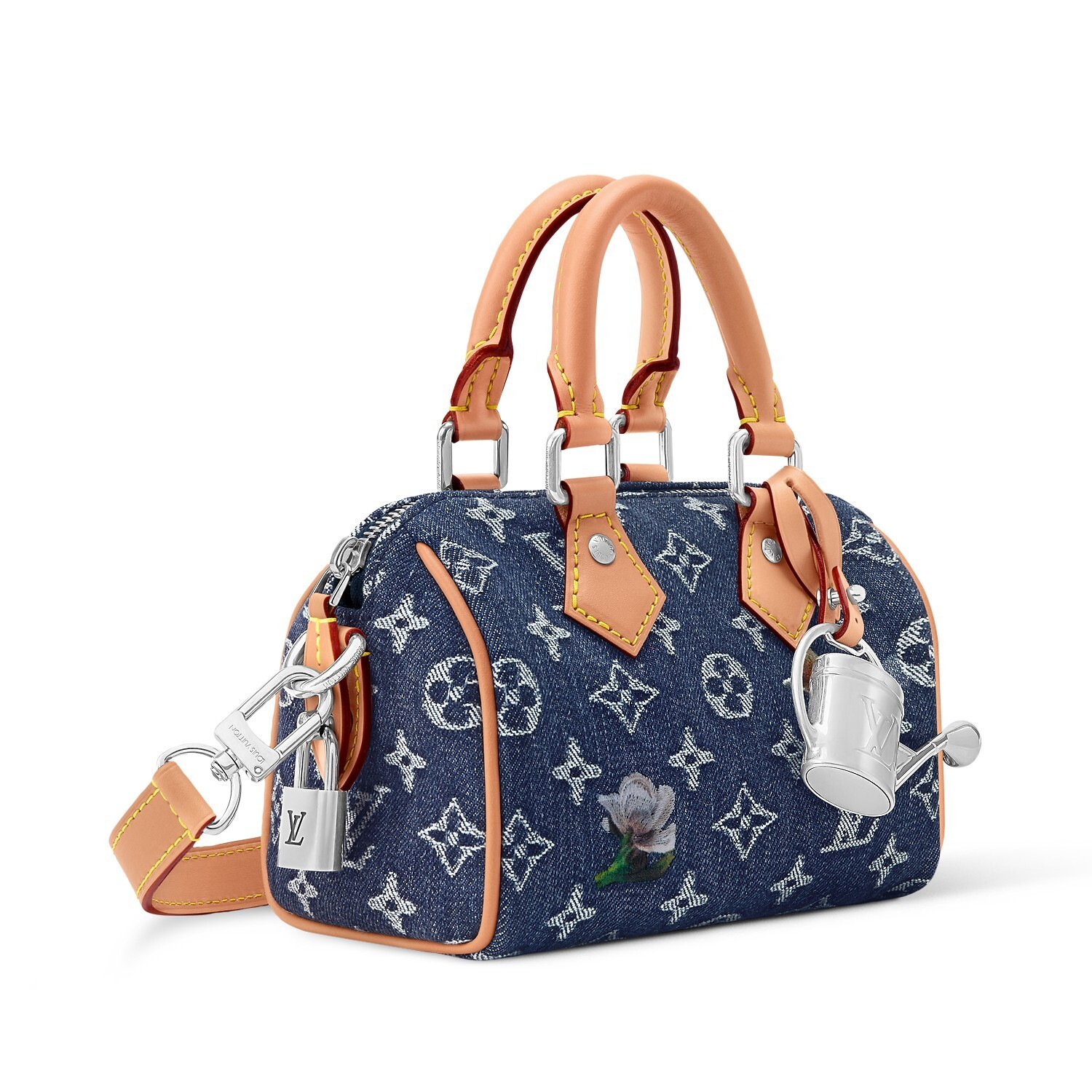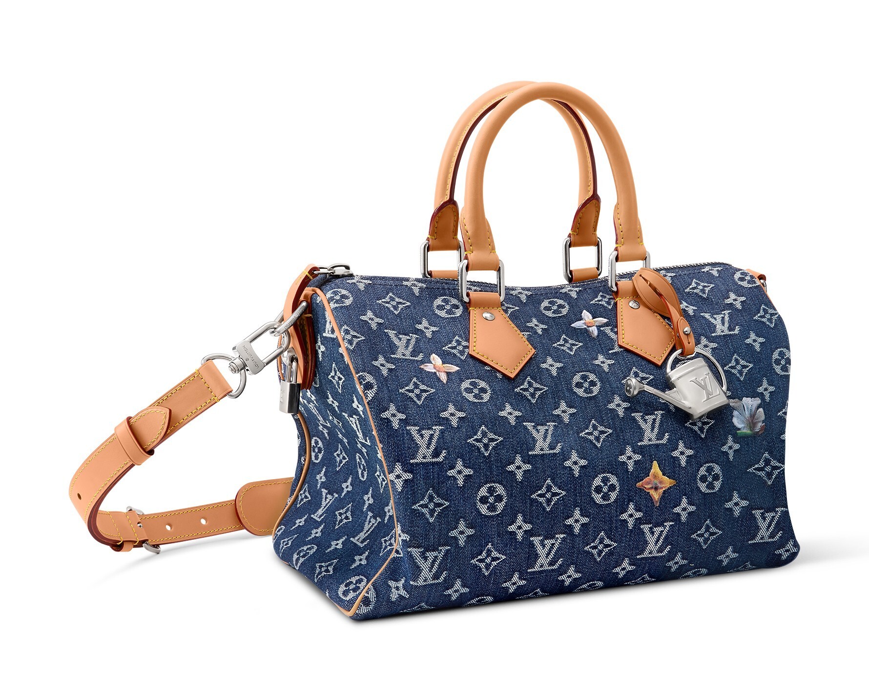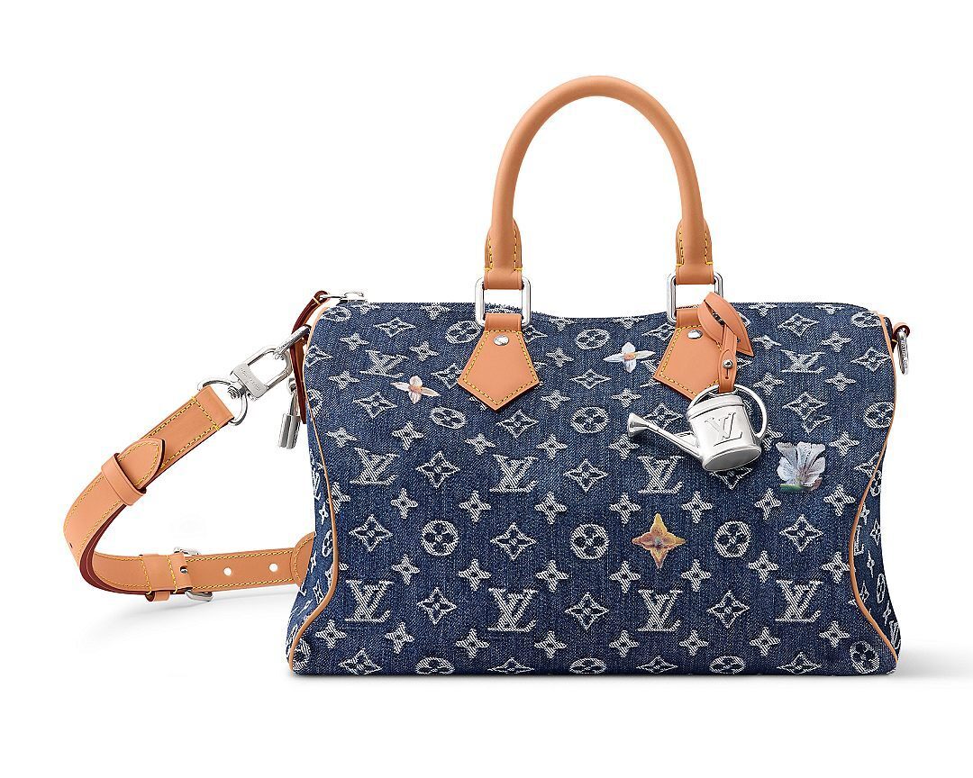 新季 Speedy 手袋推出30和18两种尺寸,采用深蓝色 Monogram 丹宁布为背景,通过刺绣工艺在 Monogram 图案中融入四照花、雏菊、龙胆等精致花卉刺绣,还有专属的浇水壶挂饰用来「浇灌」包包上的花花草草,诙谐设计展露闲逸情致。