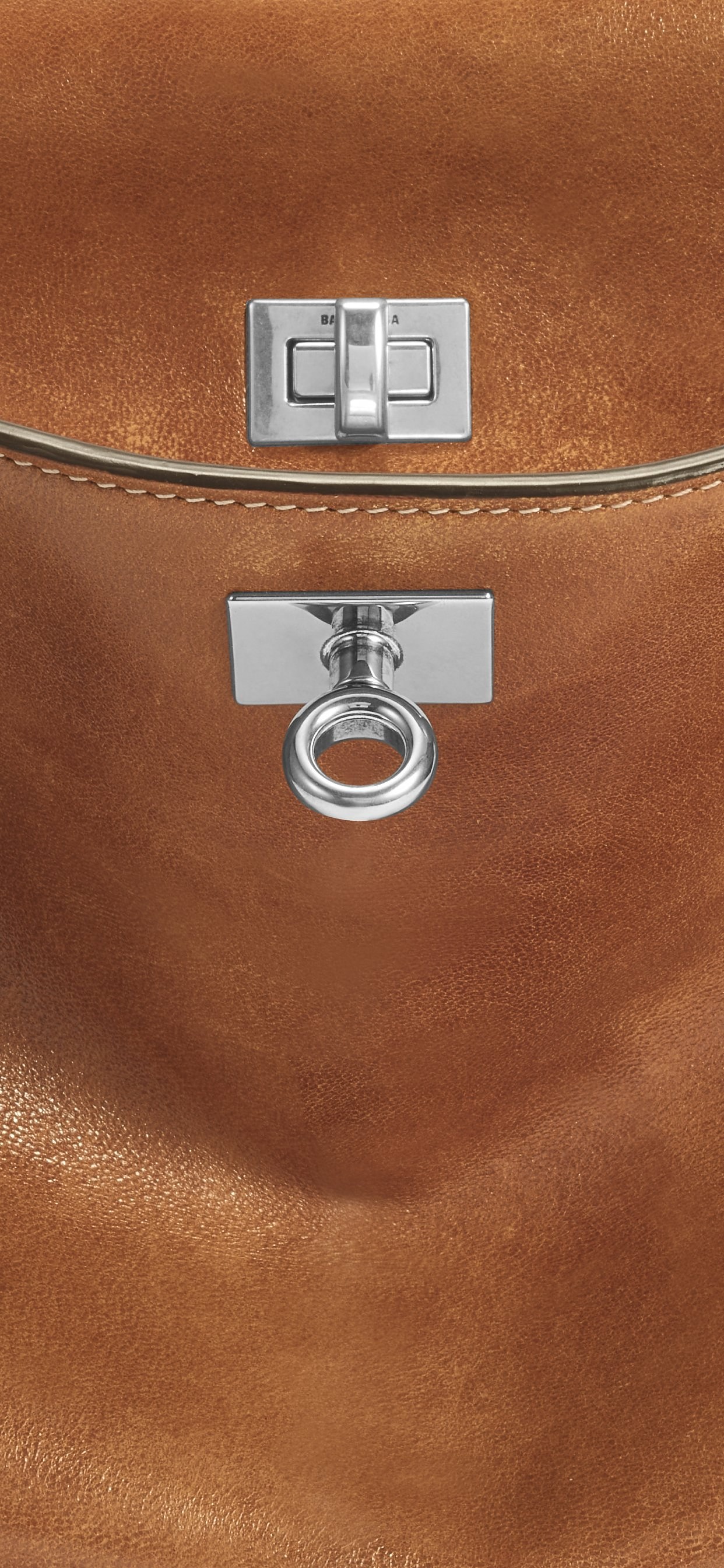 与中间隔层闭合时,包包前侧皮革自然垂耷,展现出色的包型剪裁和层次效果。