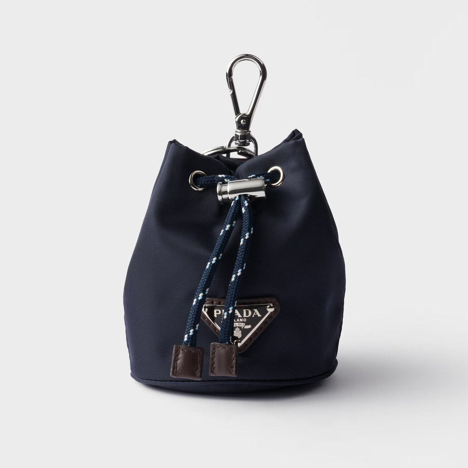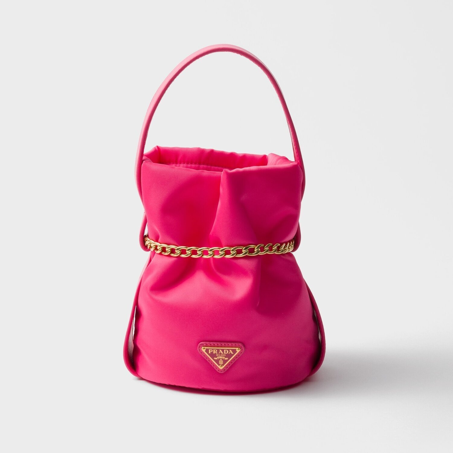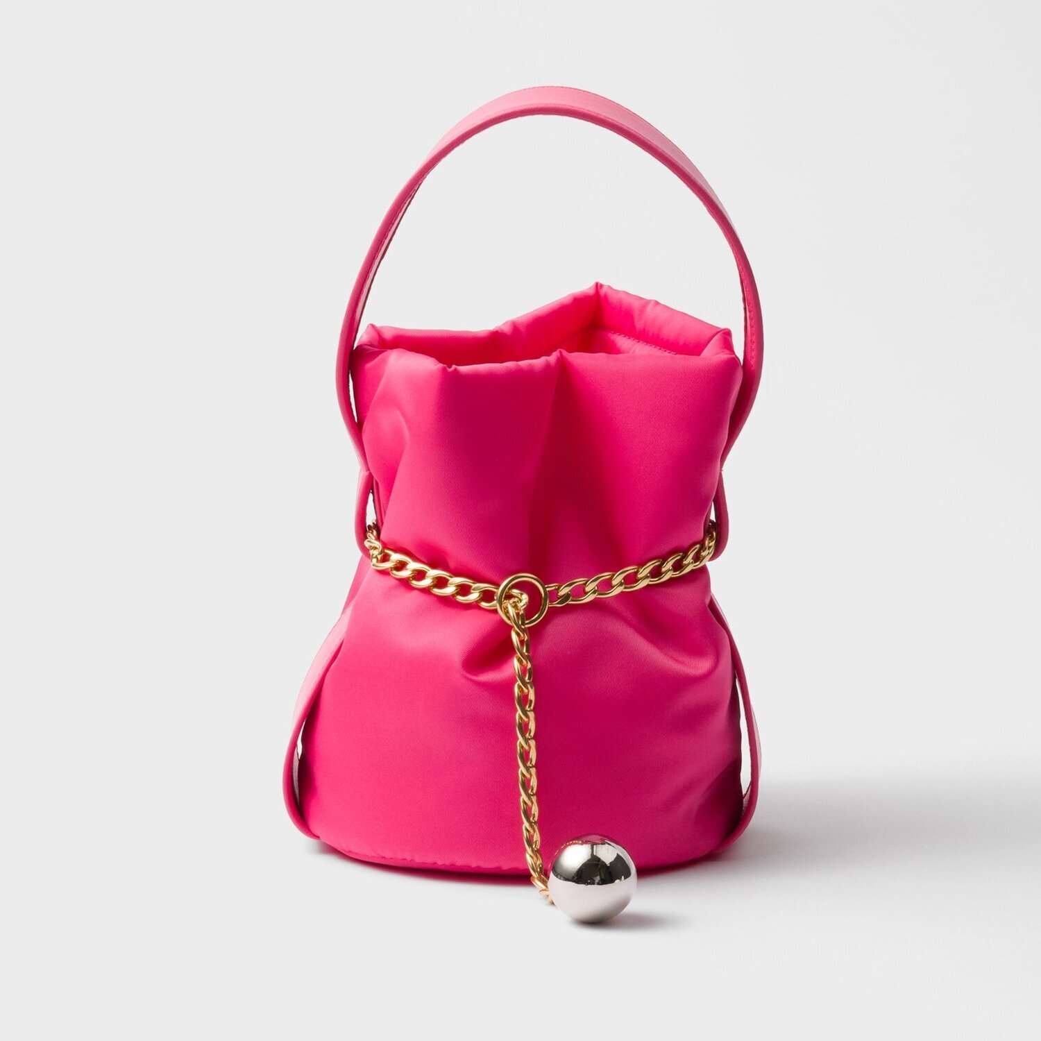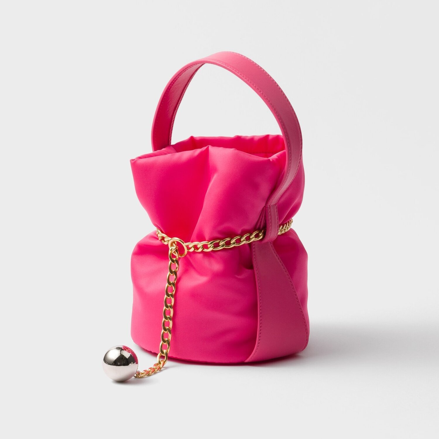 假日系列最亮眼的莫过于这只 Noir 迷你水桶包,小巧玲珑的水桶廓形搭配拱形提手,最特别之处是腰间系绑一根金属链带和球形吊坠,宛如腰带般勾勒曼妙身姿。这只采用「牡丹粉色」环保再生尼龙制作,出挑的颜色更显娇嫩俏丽。