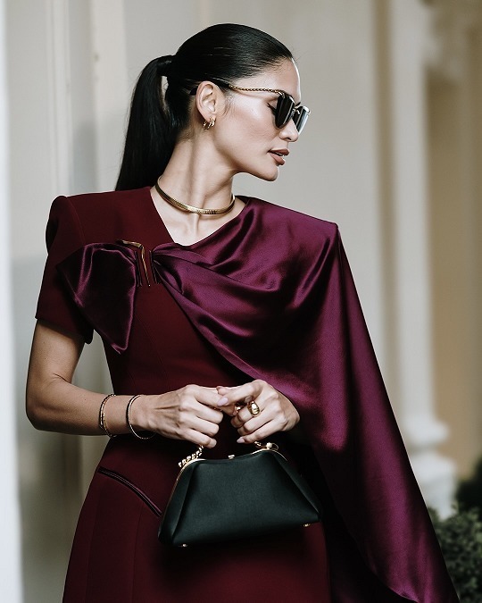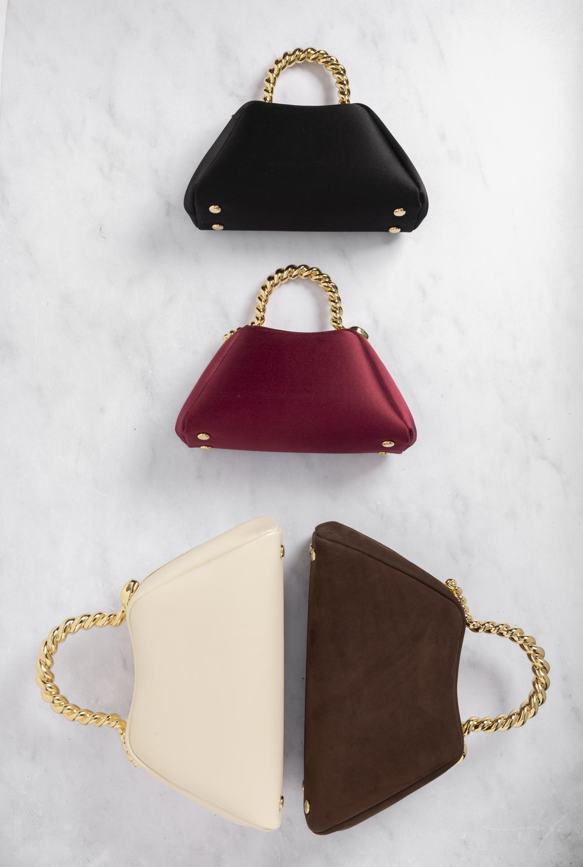 迷你尺寸可作为手提包或晚装包,推出石榴石红色丝缎和黑色丝缎2个配色,搭配一条可拆卸的皮革肩带。