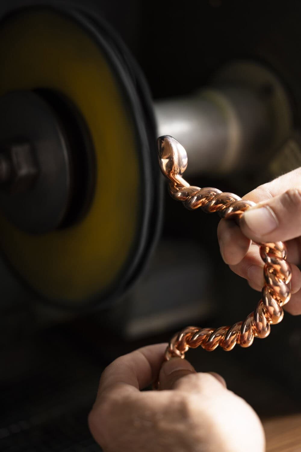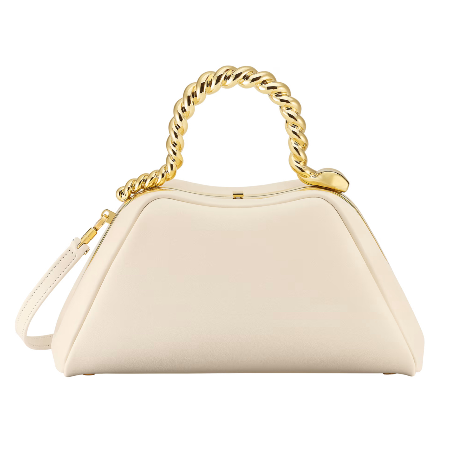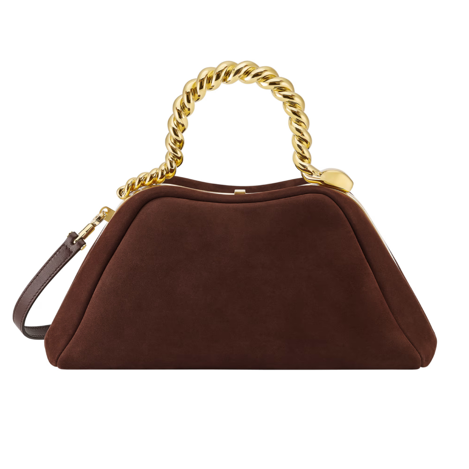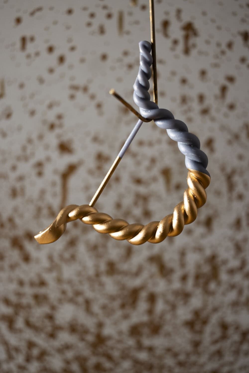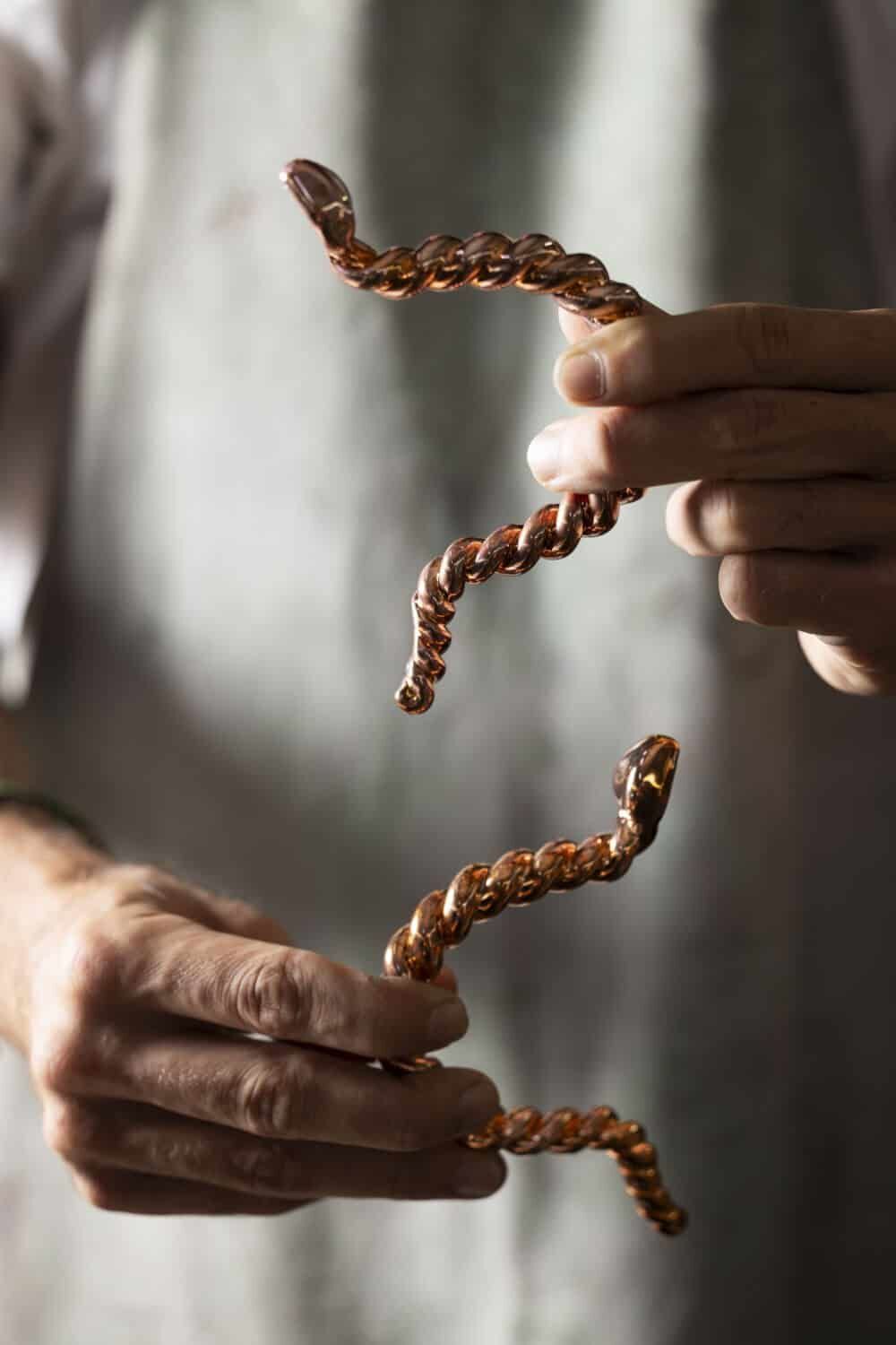 最大亮点是顶部优美的拱形手柄——采用金色黄铜通过扭索工艺制作成扭绳般的纹路,营造出灵蛇曼妙而柔软的身姿。顶部可以看到灵蛇圆润的头部设计,经过镜面抛光润饰营造出闪耀流动的金色鎏光。