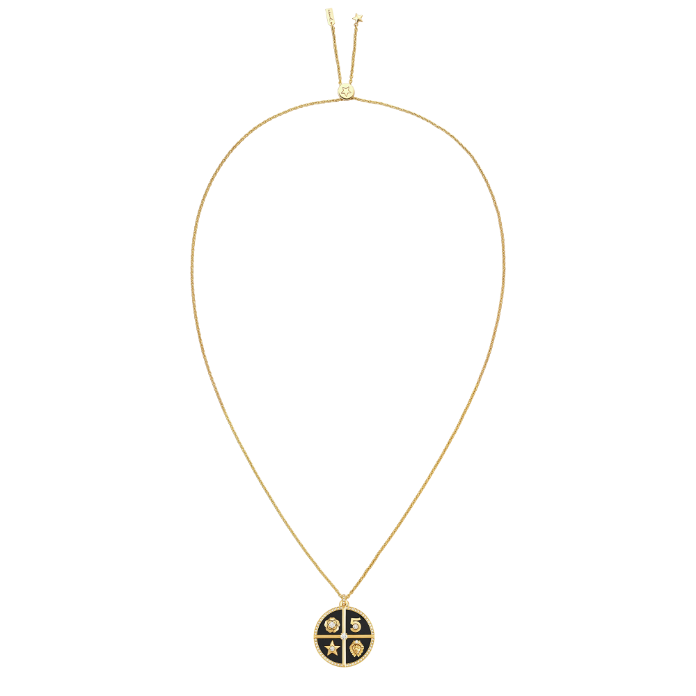 Symbloes 项链挂坠的一面以黄金线条勾勒四宫格图案,宫格内分别点缀山茶花、数字5、彗星和狮子图腾,图案中央各镶嵌一颗圆钻营造出璀璨光芒,搭配黑色软玉衬底更显明亮闪耀;挂坠另一面以激光雕刻技术呈现徽标字母,如浮雕般营造出立体光影。