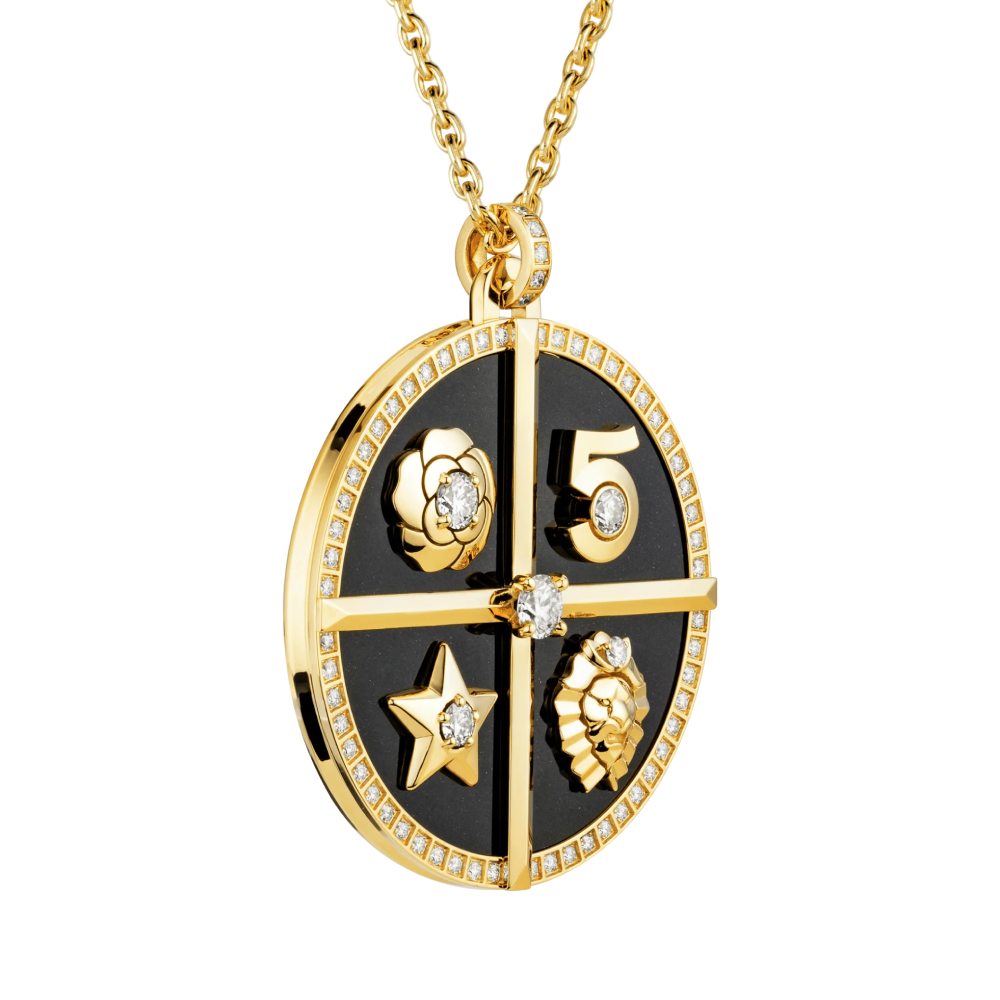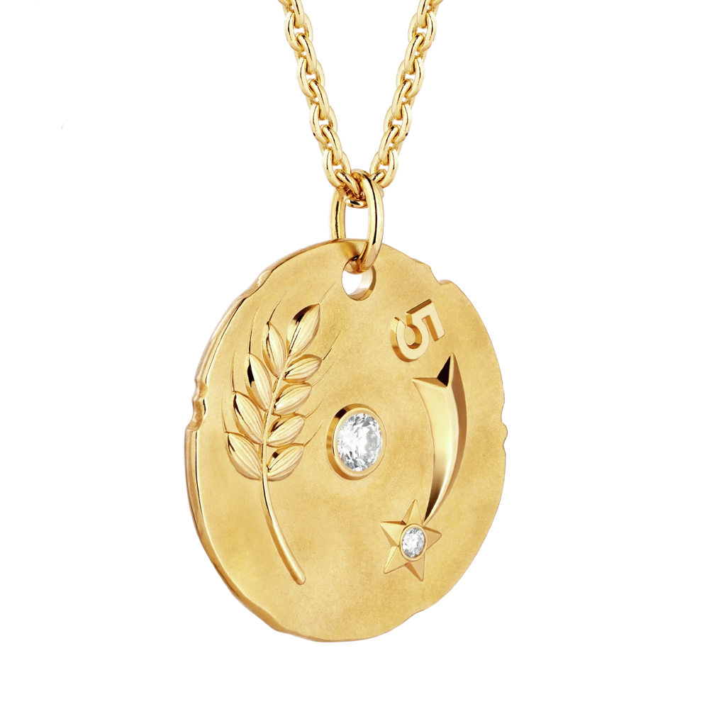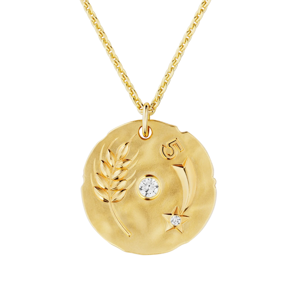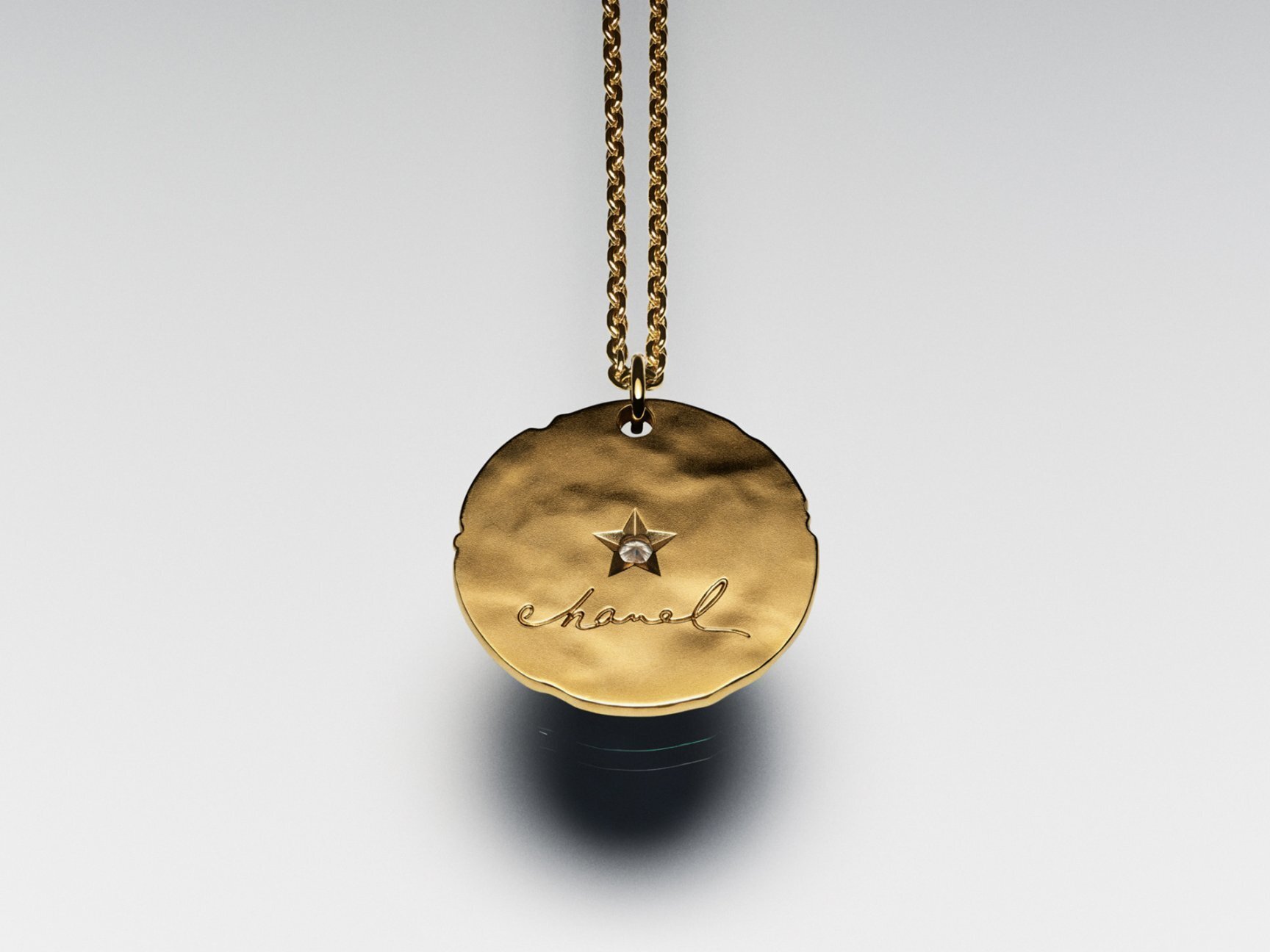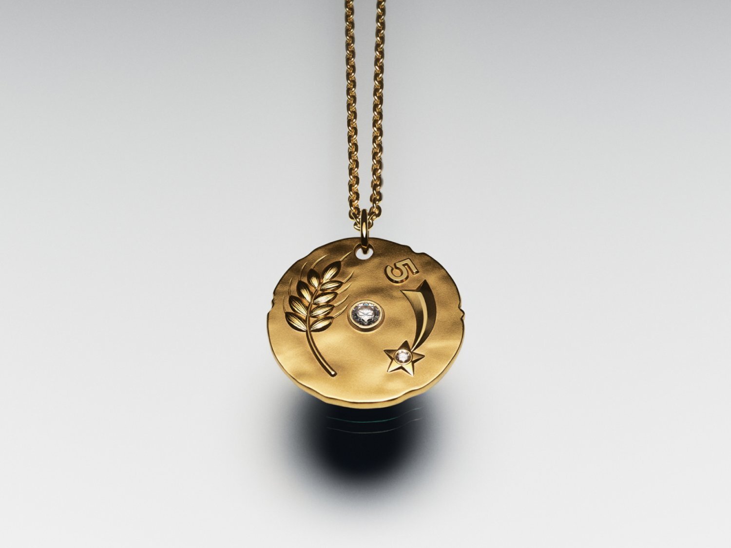 Talismans 项链挂坠以黄金锻造工艺呈现立体起伏的原始质感,金质挂坠一面雕刻麦穗、数字5和彗星图腾,中央镶点一颗灵动圆钻;翻转至另一面,星星下方镌刻 Chanel 女士的手写签名。
