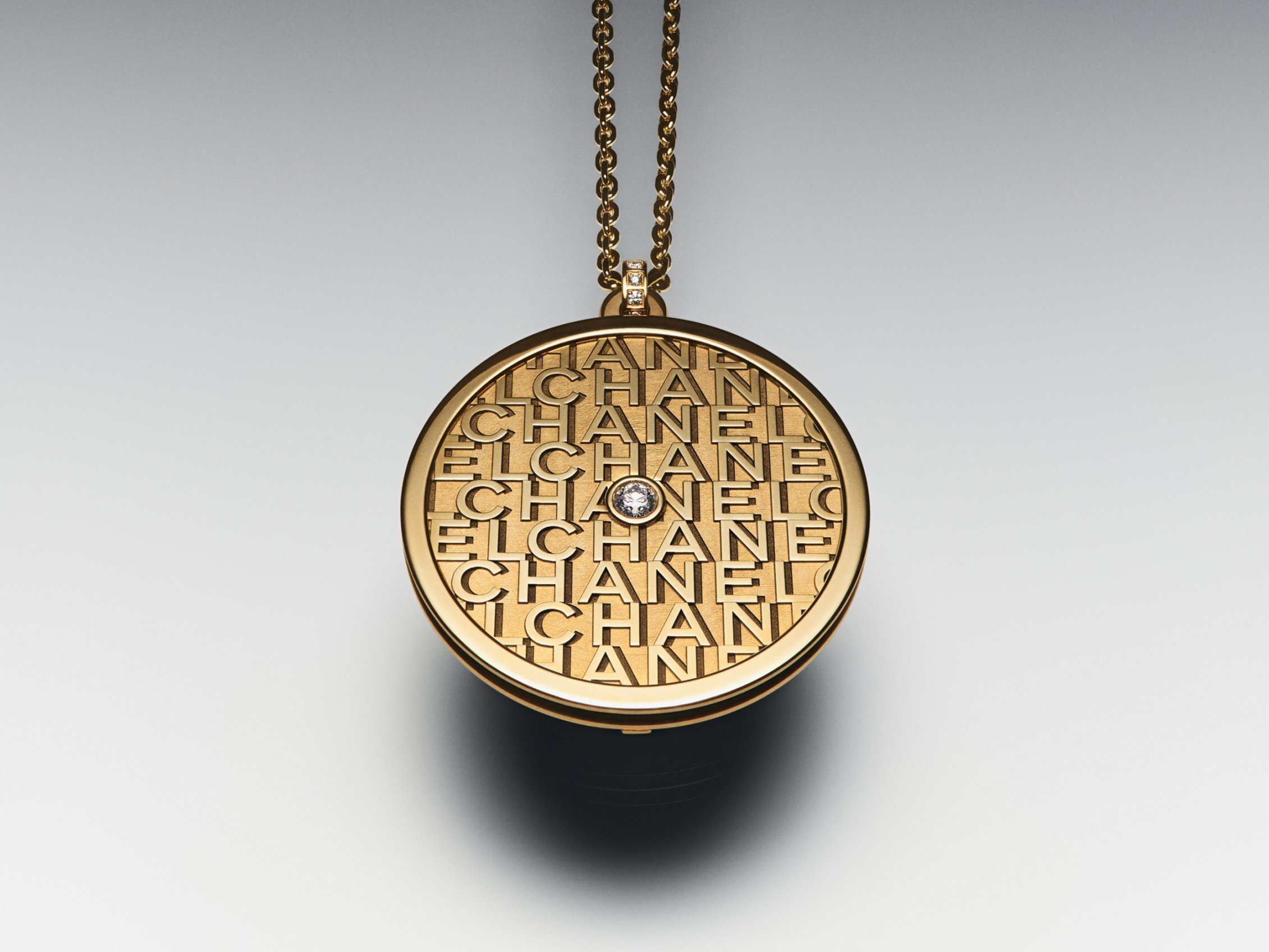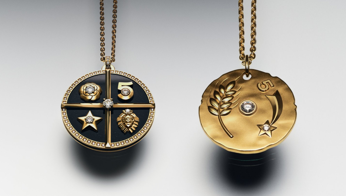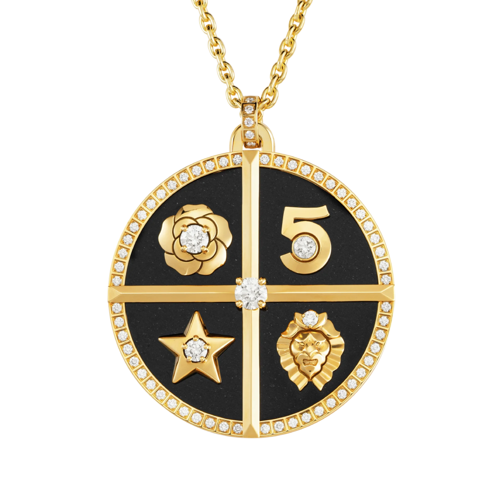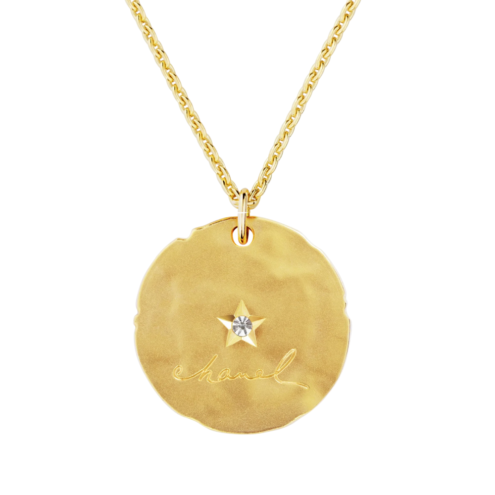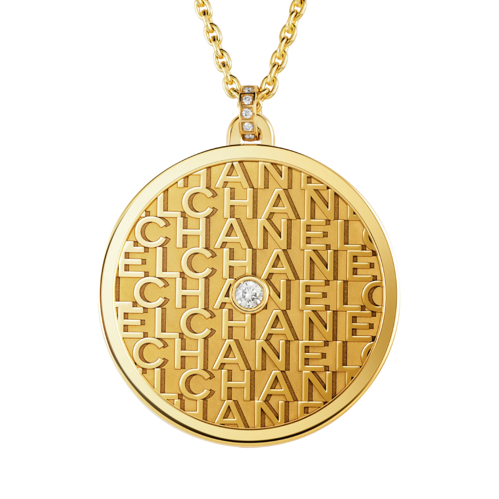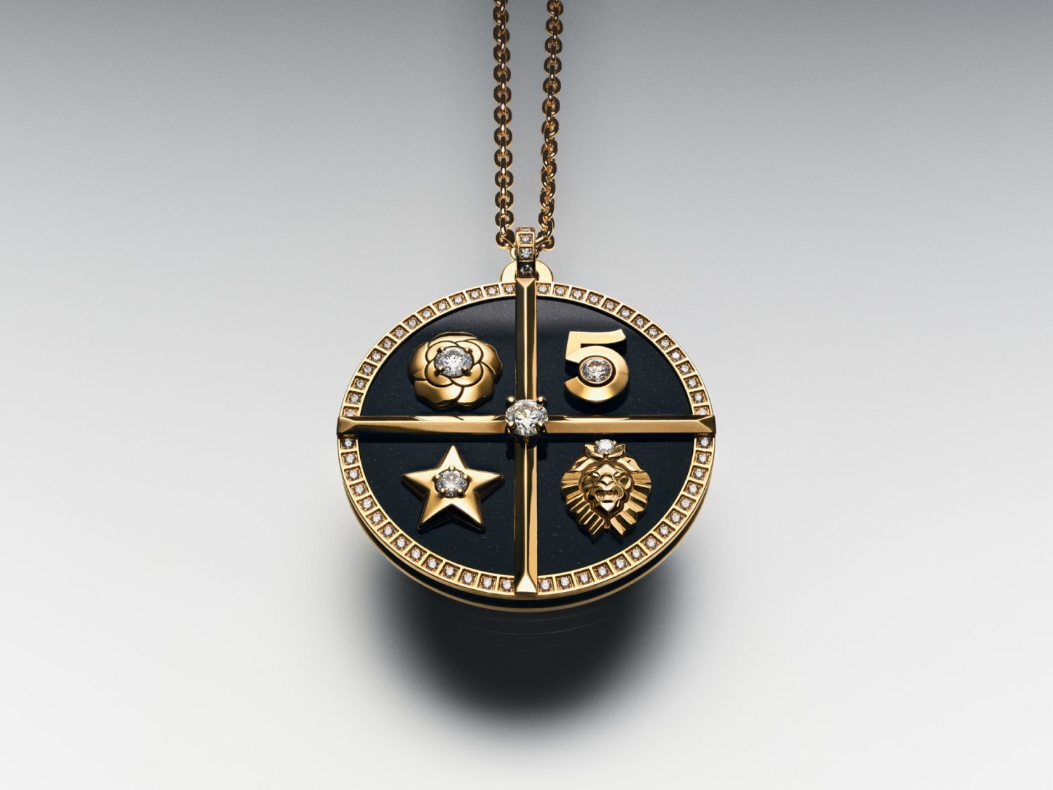 Talismans 项链挂坠以黄金锻造工艺呈现立体起伏的原始质感,金质挂坠一面雕刻麦穗、数字5和彗星图腾,中央镶点一颗灵动圆钻;翻转至另一面,星星下方镌刻 Chanel 女士的手写签名。