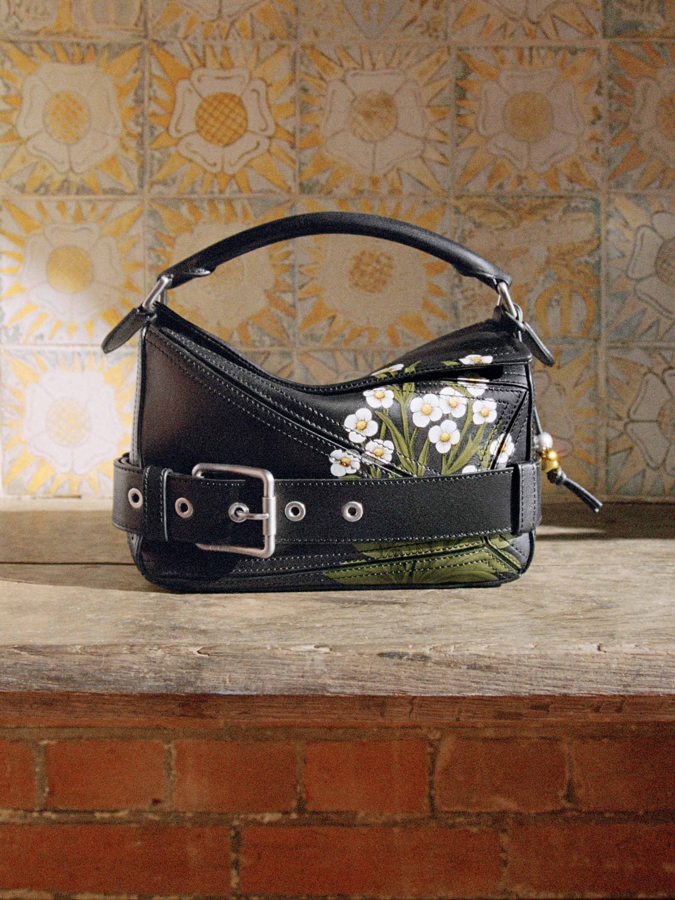 这款手袋的设计灵感来自2018早春 LOEWE × William Morris 系列典藏版 Puzzle 手袋,借鉴了传统机车夹克的金属穿孔皮带、铆钉肩章等标志性设计,同时点缀草莓花与野兔的柔美图案,将朋克精神与工艺美术运动这两种看似迥异的风格进行融合,诠释出两者共有的前卫革新理念。
