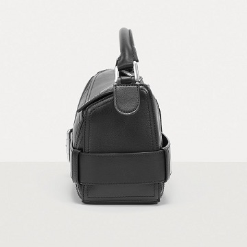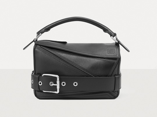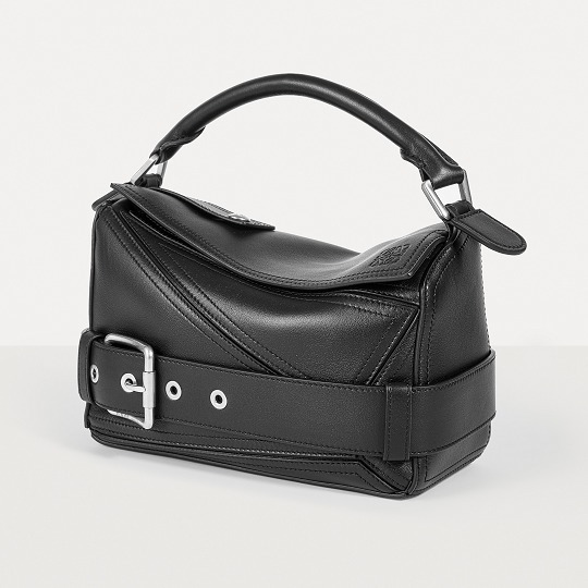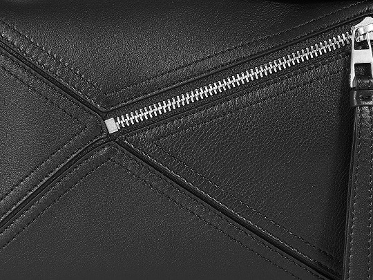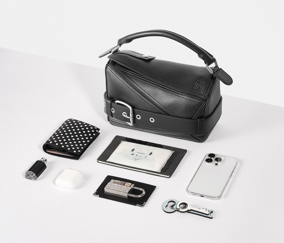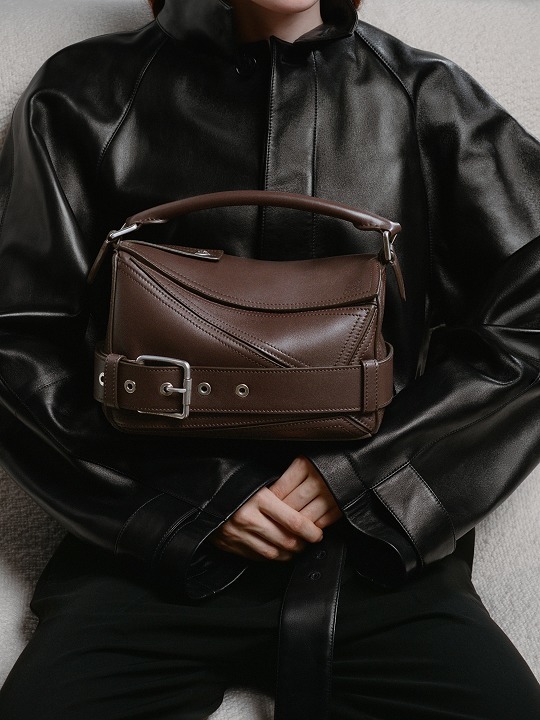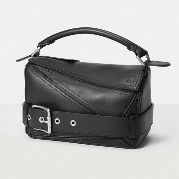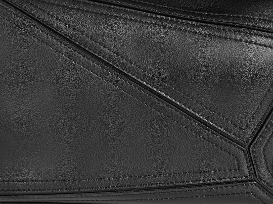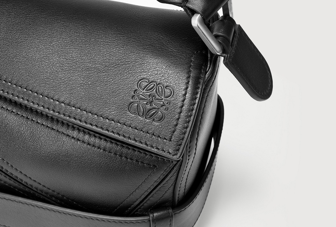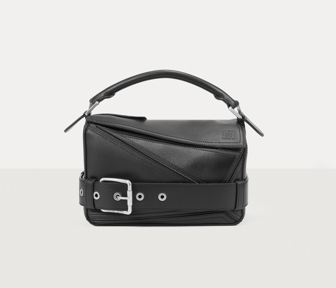 包包延续经典 Puzzle 手袋的几何构型,采用黑色亮面牛皮革制作而成,通过精湛制皮工艺将平面几何皮料拼合成立体手袋造型,既保留了 LOEWE 的工艺传承精神,又注入前卫美学概念,在趣味性和功能性上达成平衡。