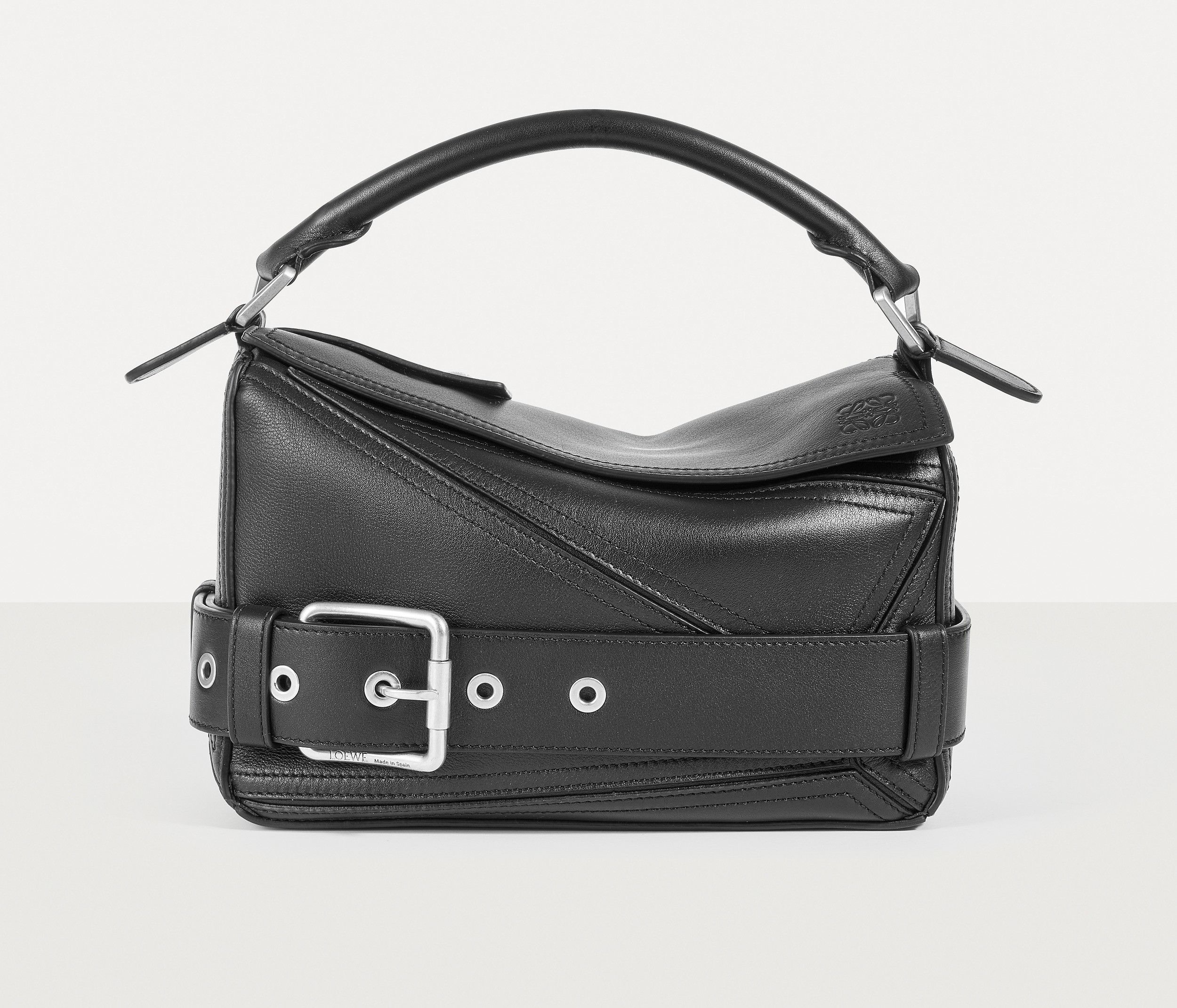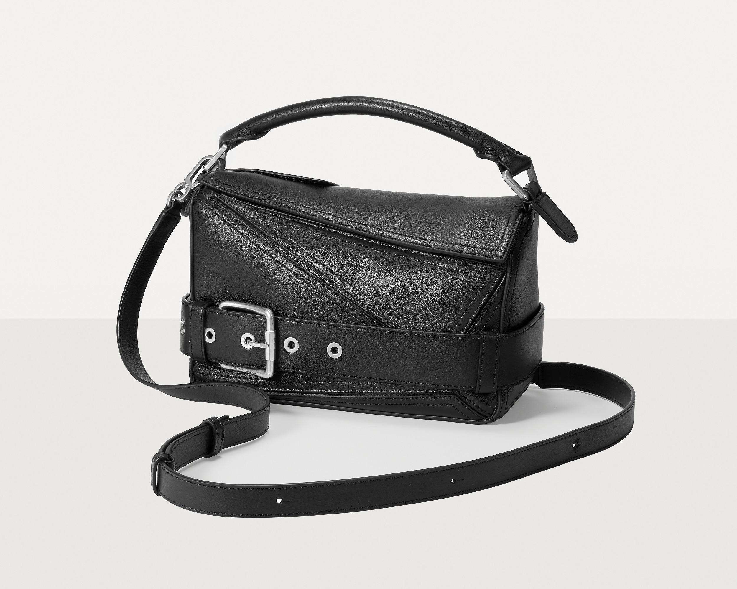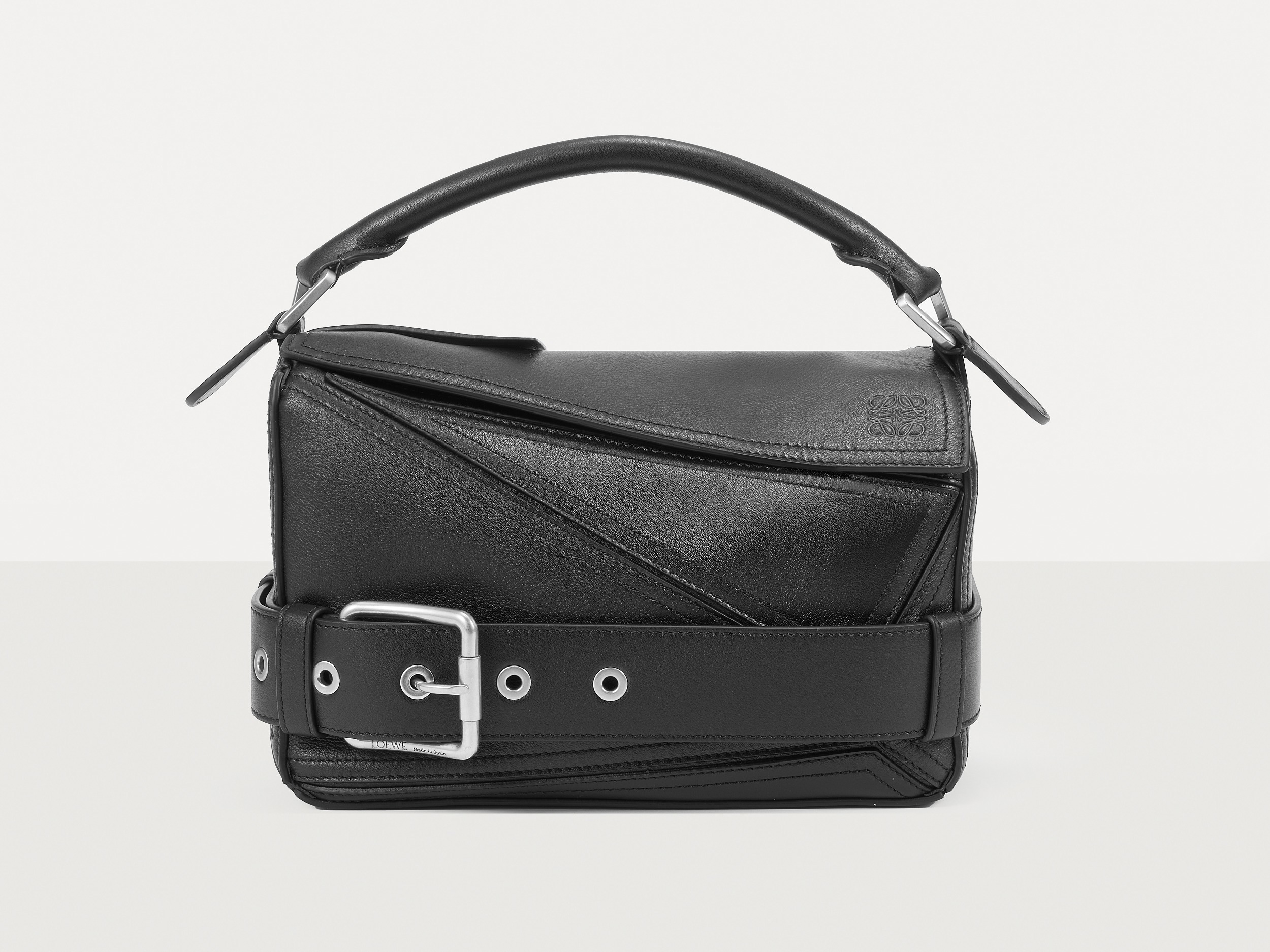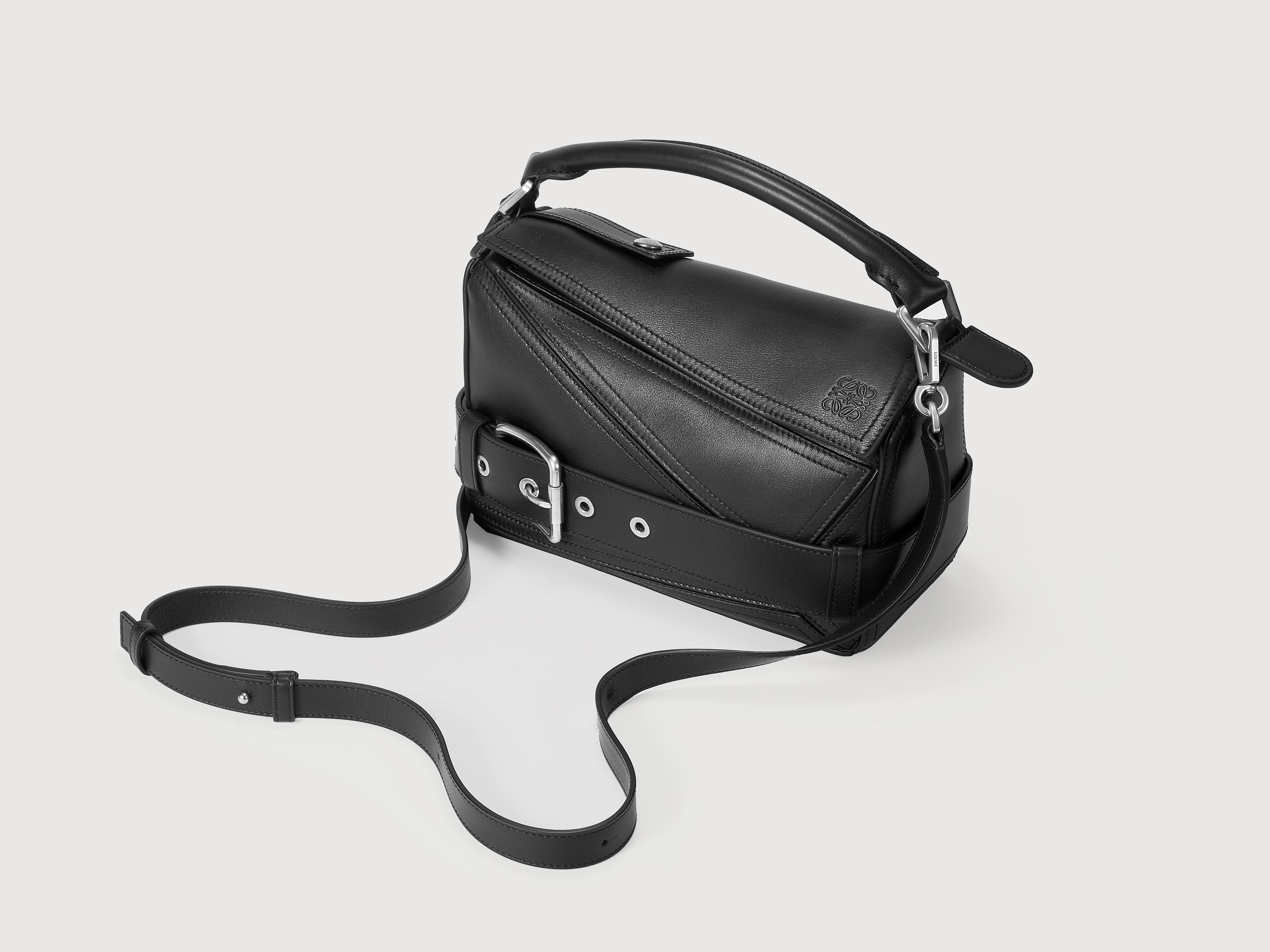 包包延续经典 Puzzle 手袋的几何构型,采用黑色亮面牛皮革制作而成,通过精湛制皮工艺将平面几何皮料拼合成立体手袋造型,既保留了 LOEWE 的工艺传承精神,又注入前卫美学概念,在趣味性和功能性上达成平衡。