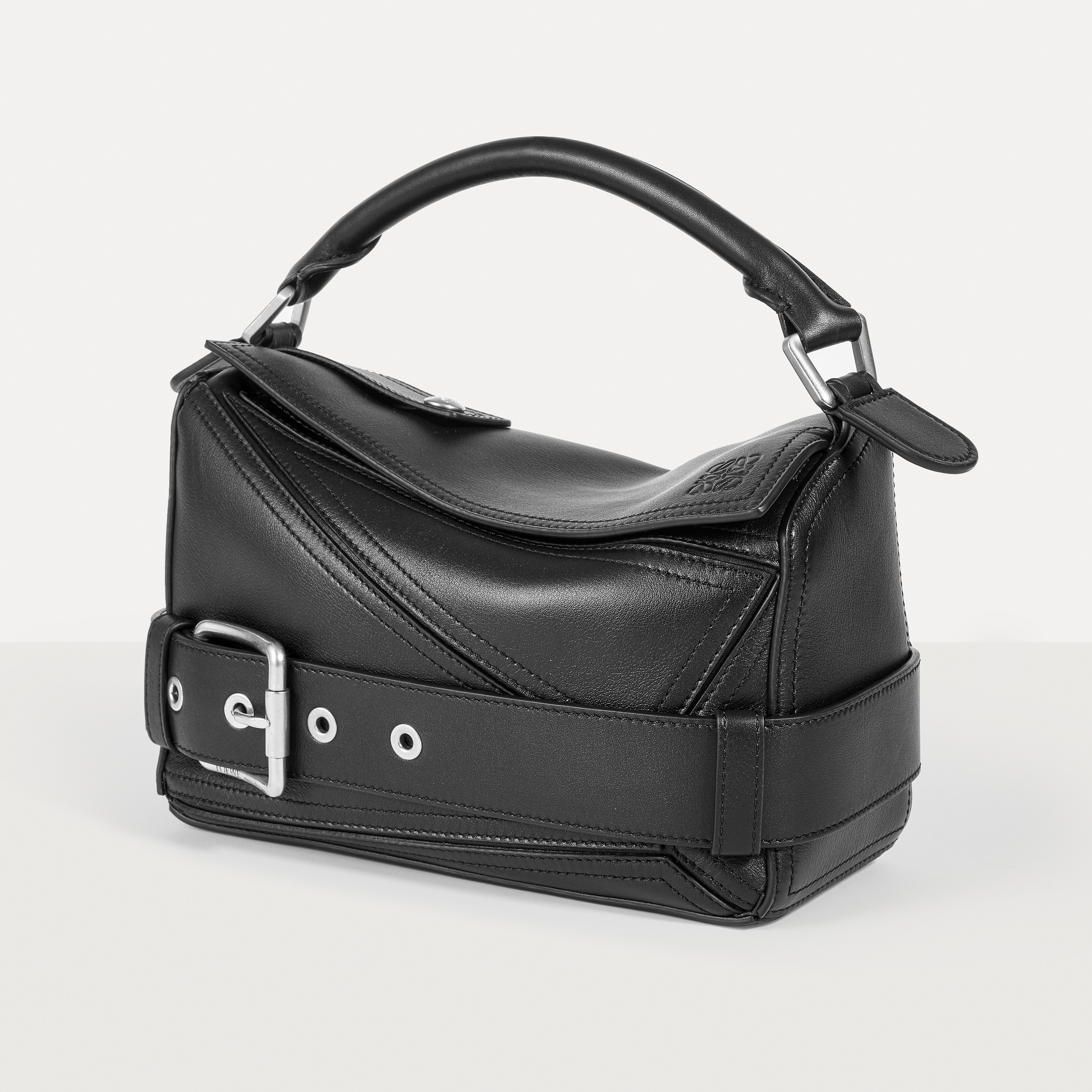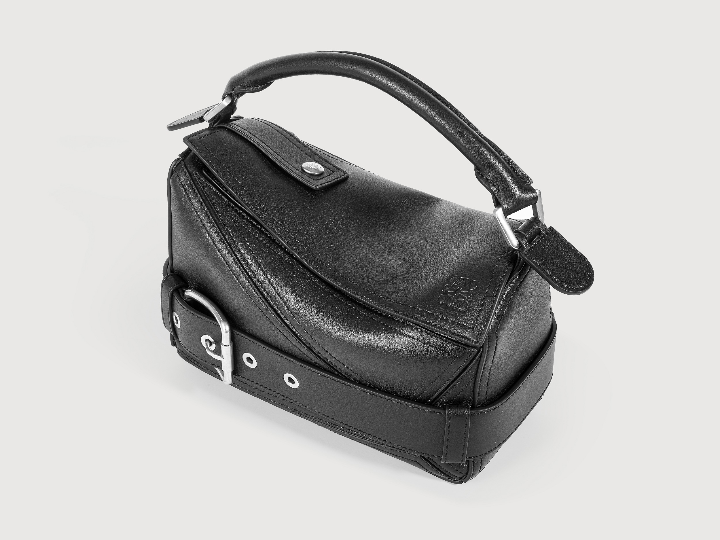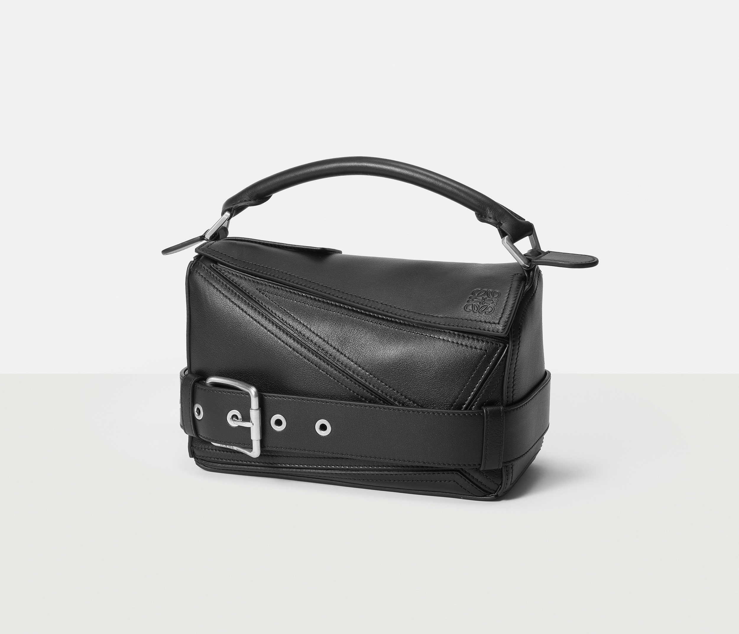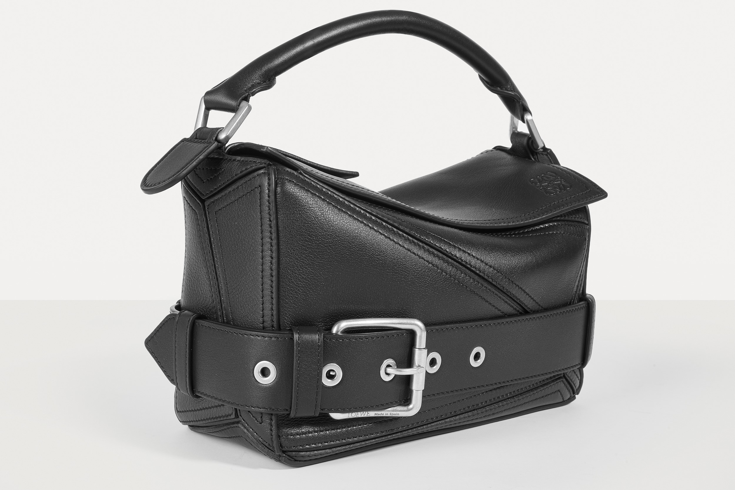 包包延续经典 Puzzle 手袋的几何构型,采用黑色亮面牛皮革制作而成,通过精湛制皮工艺将平面几何皮料拼合成立体手袋造型,既保留了 LOEWE 的工艺传承精神,又注入前卫美学概念,在趣味性和功能性上达成平衡。