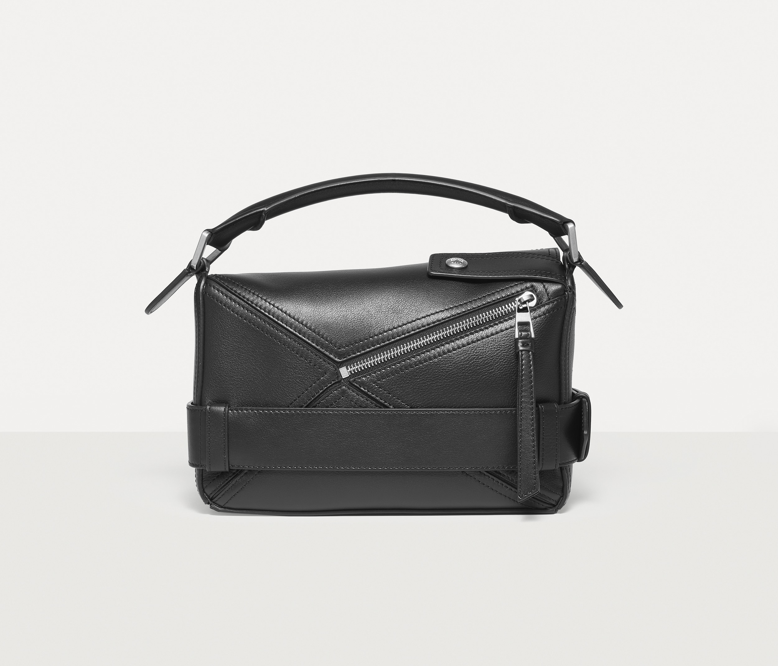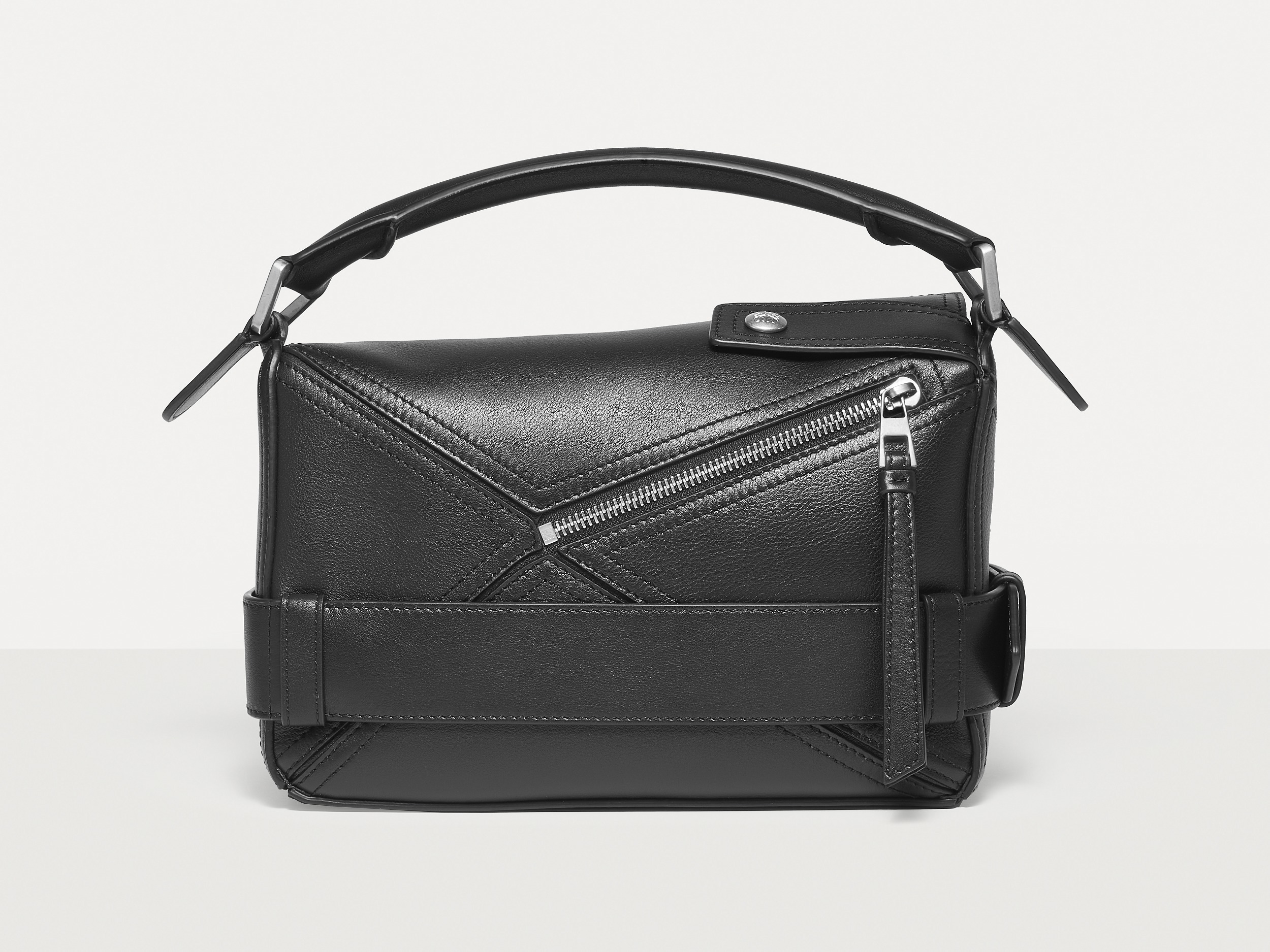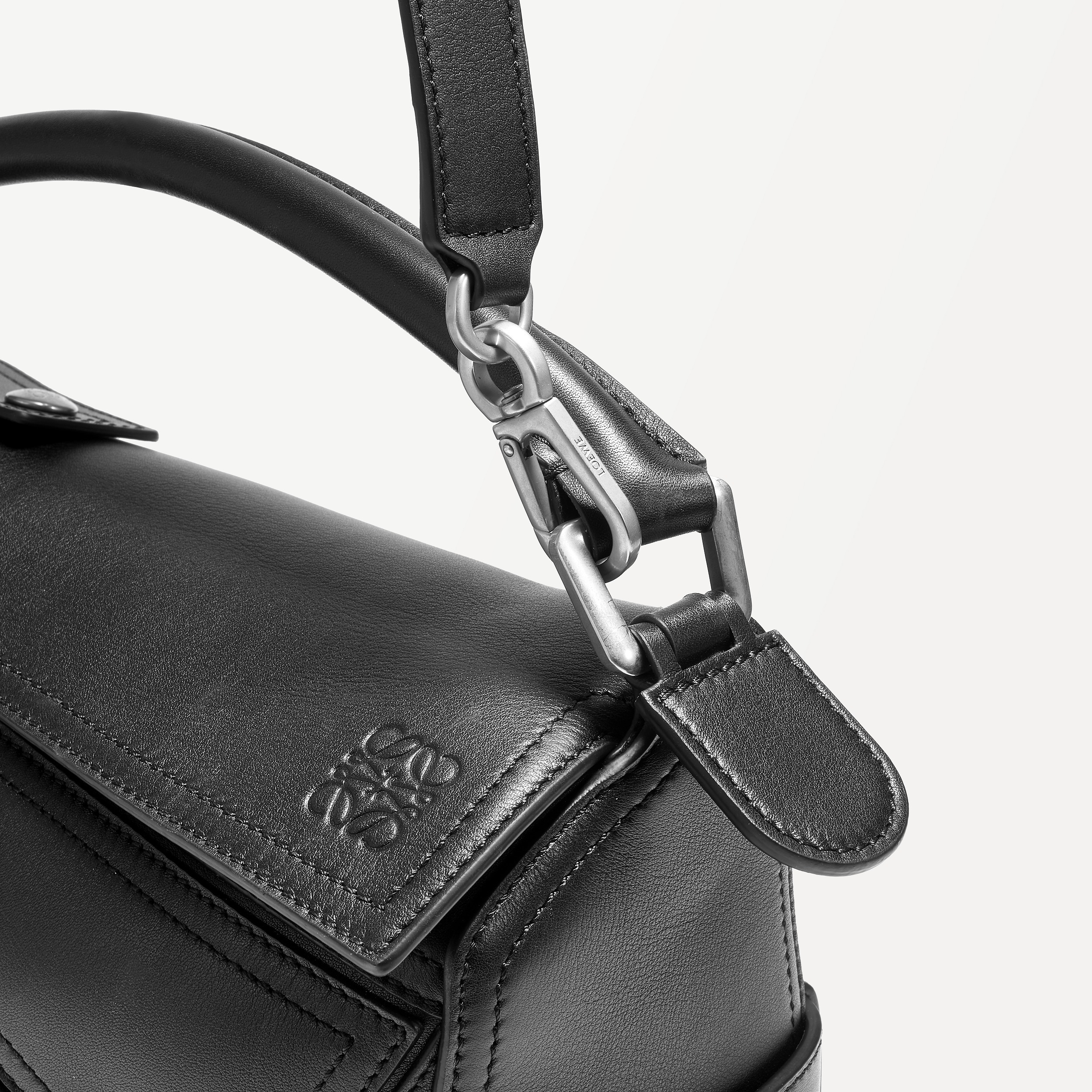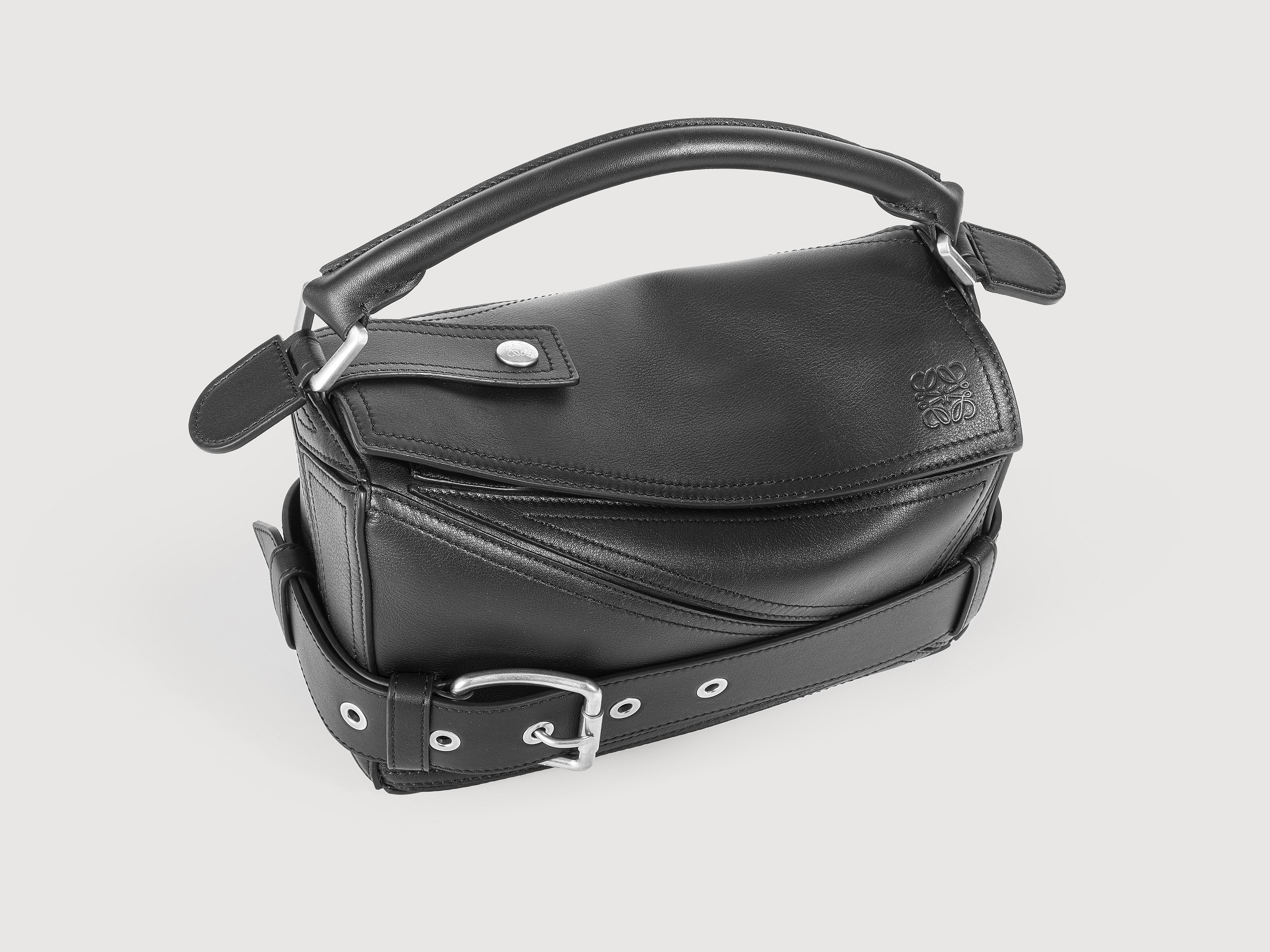 包包延续经典 Puzzle 手袋的几何构型,采用黑色亮面牛皮革制作而成,通过精湛制皮工艺将平面几何皮料拼合成立体手袋造型,既保留了 LOEWE 的工艺传承精神,又注入前卫美学概念,在趣味性和功能性上达成平衡。