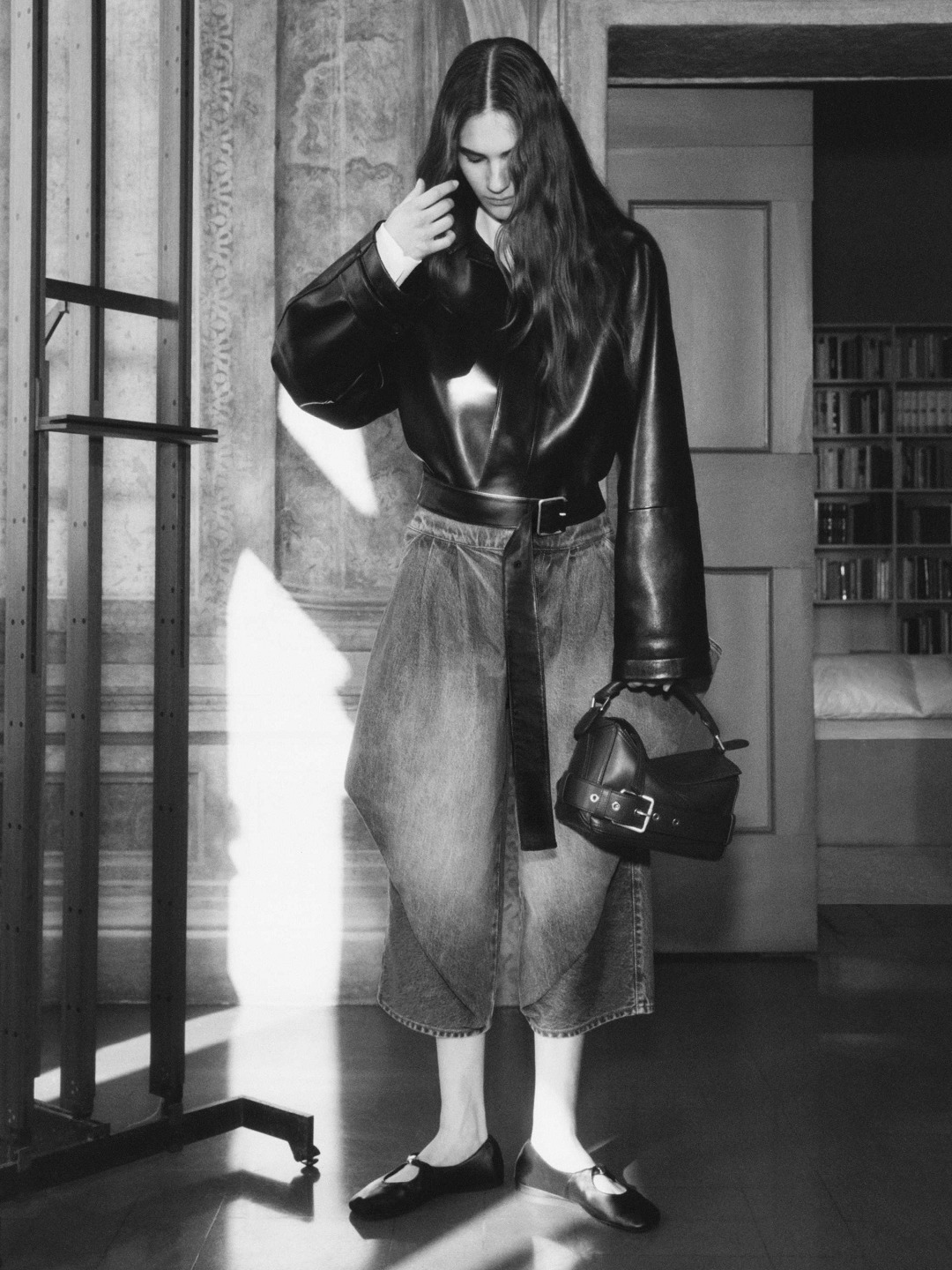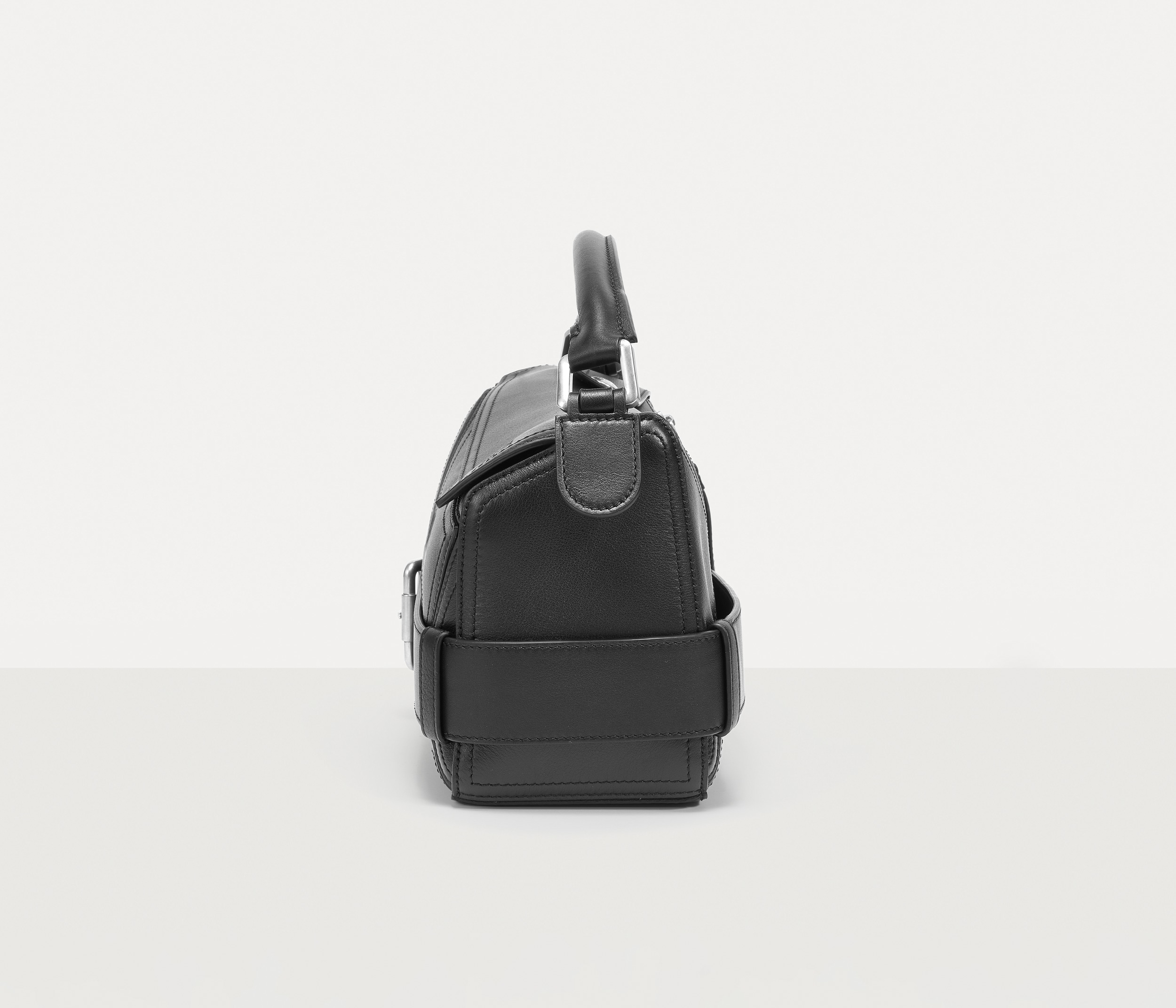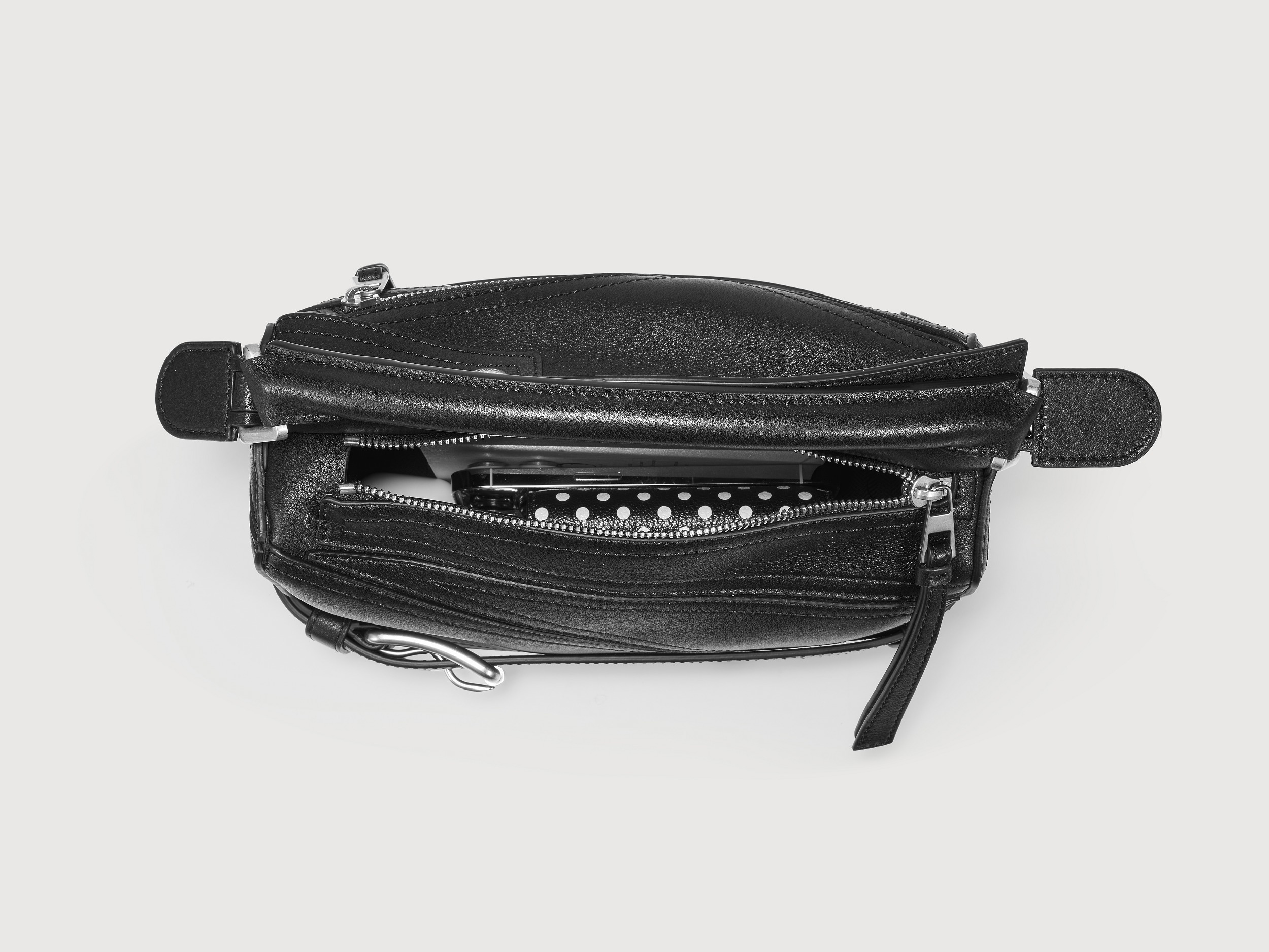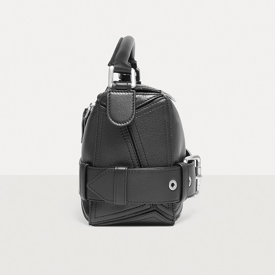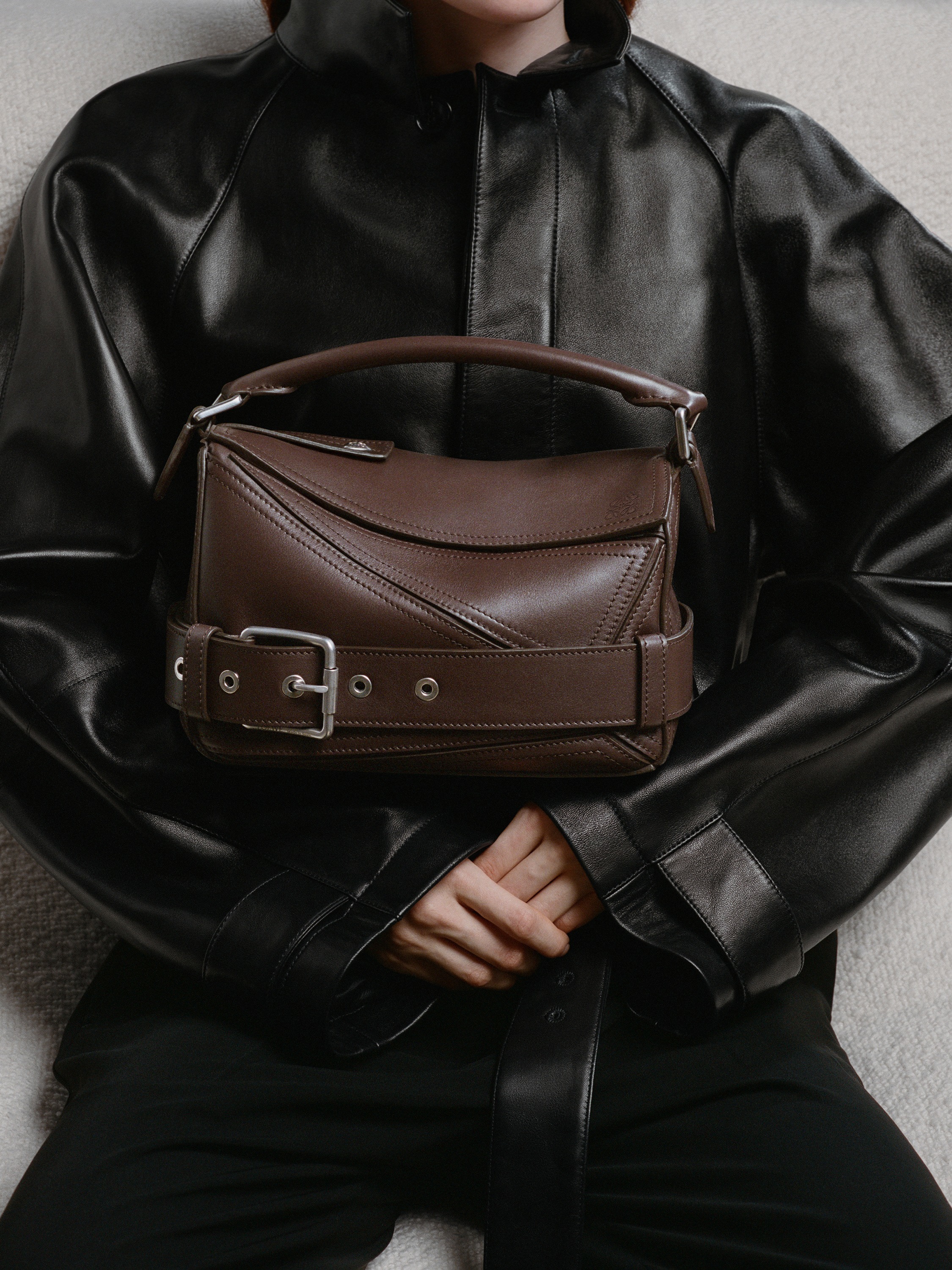 新版 Puzzle Biker 手袋在原作基础上进行简化,仅保留来自机车夹克的腰带和肩章元素,酷黑色包身与钯金色金属配件的组合洗练而克制,也更易于搭配和融入日常。