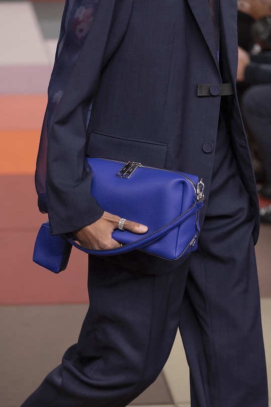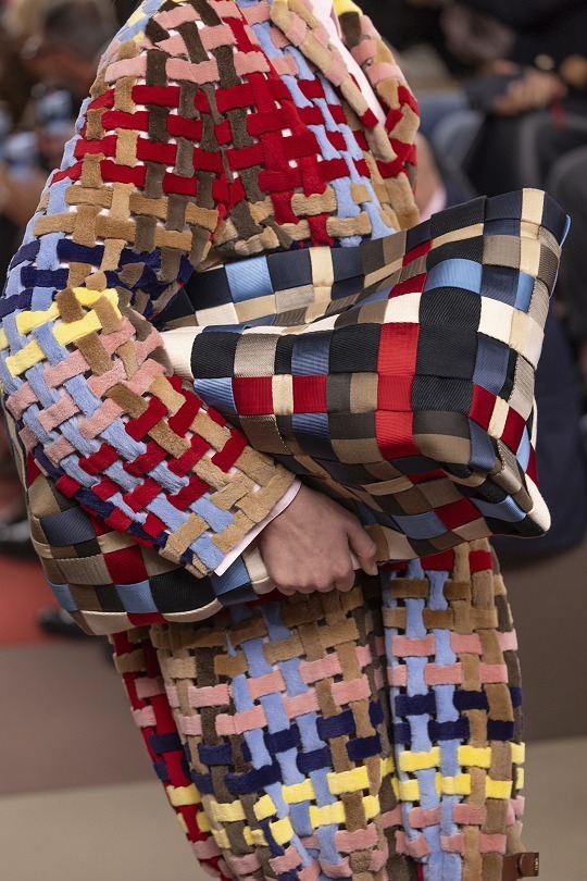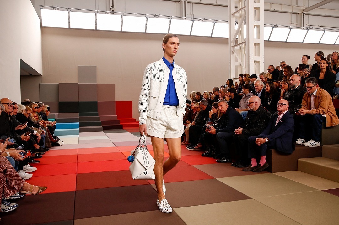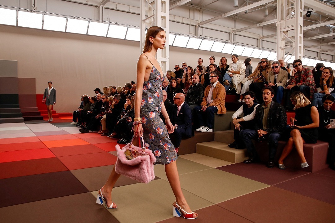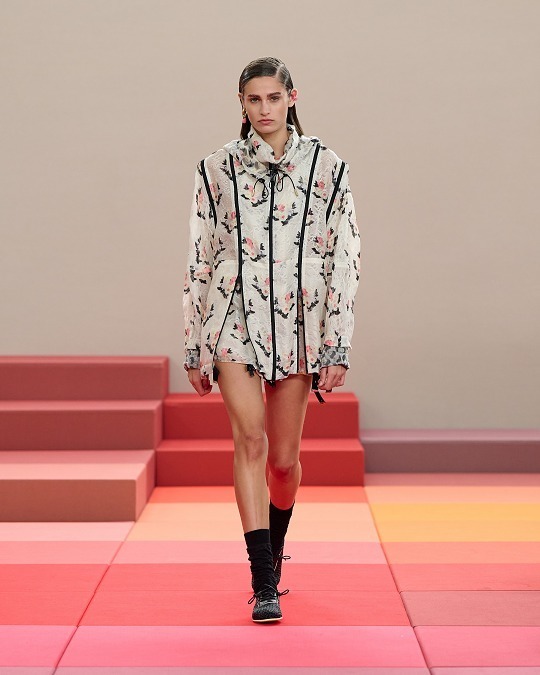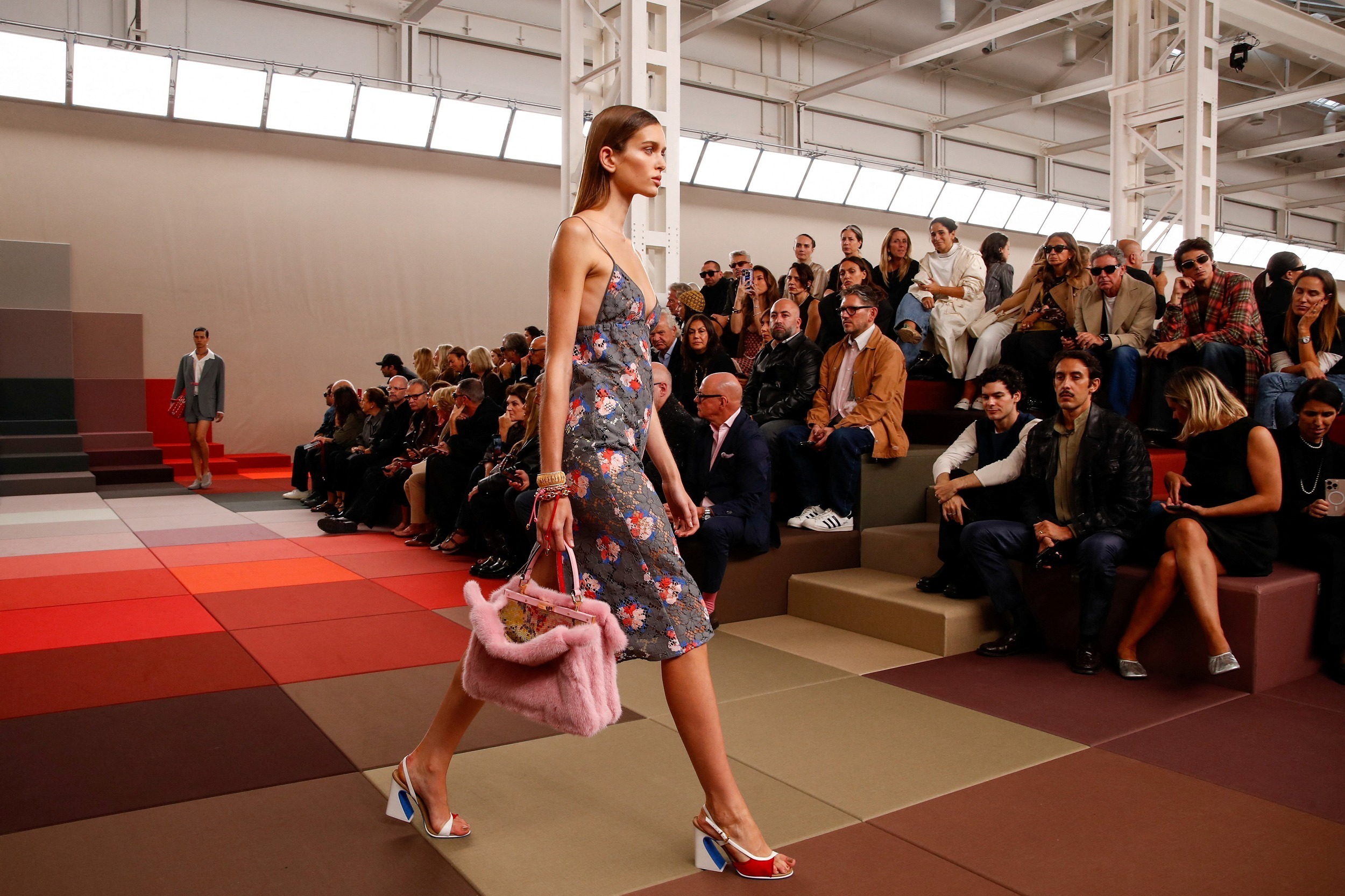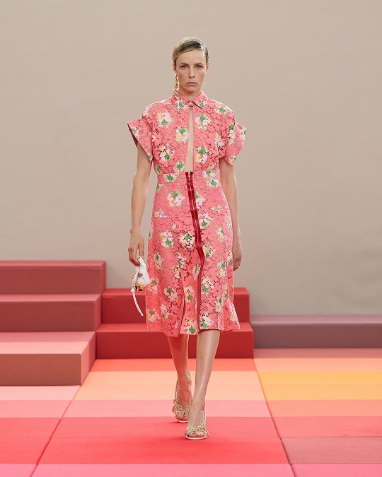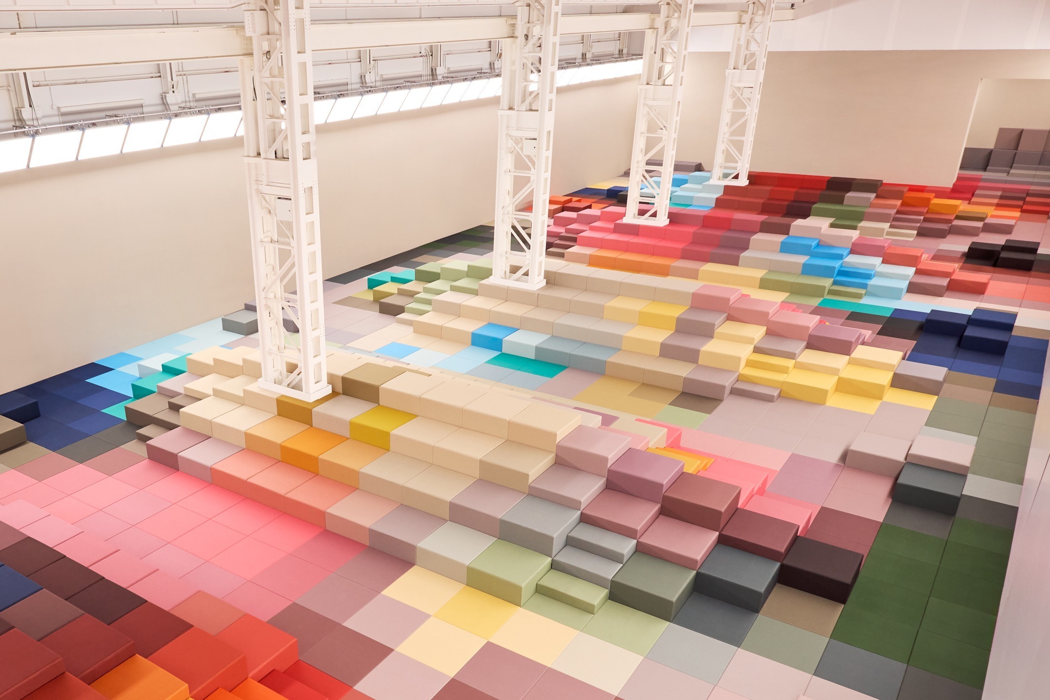 秀场布景由澳大利亚工业设计师 Marc Newson 构想,充满未来感的像素化色域空间与明快的时装色彩体系彼此呼应。从纯白、混凝土灰、柔和的日光黄,到青绿、朱红、泡泡糖粉、珊瑚粉及各式糖果色组合,原色、粉彩色与大地中性色的色调转换共同构成多元色谱系统。
