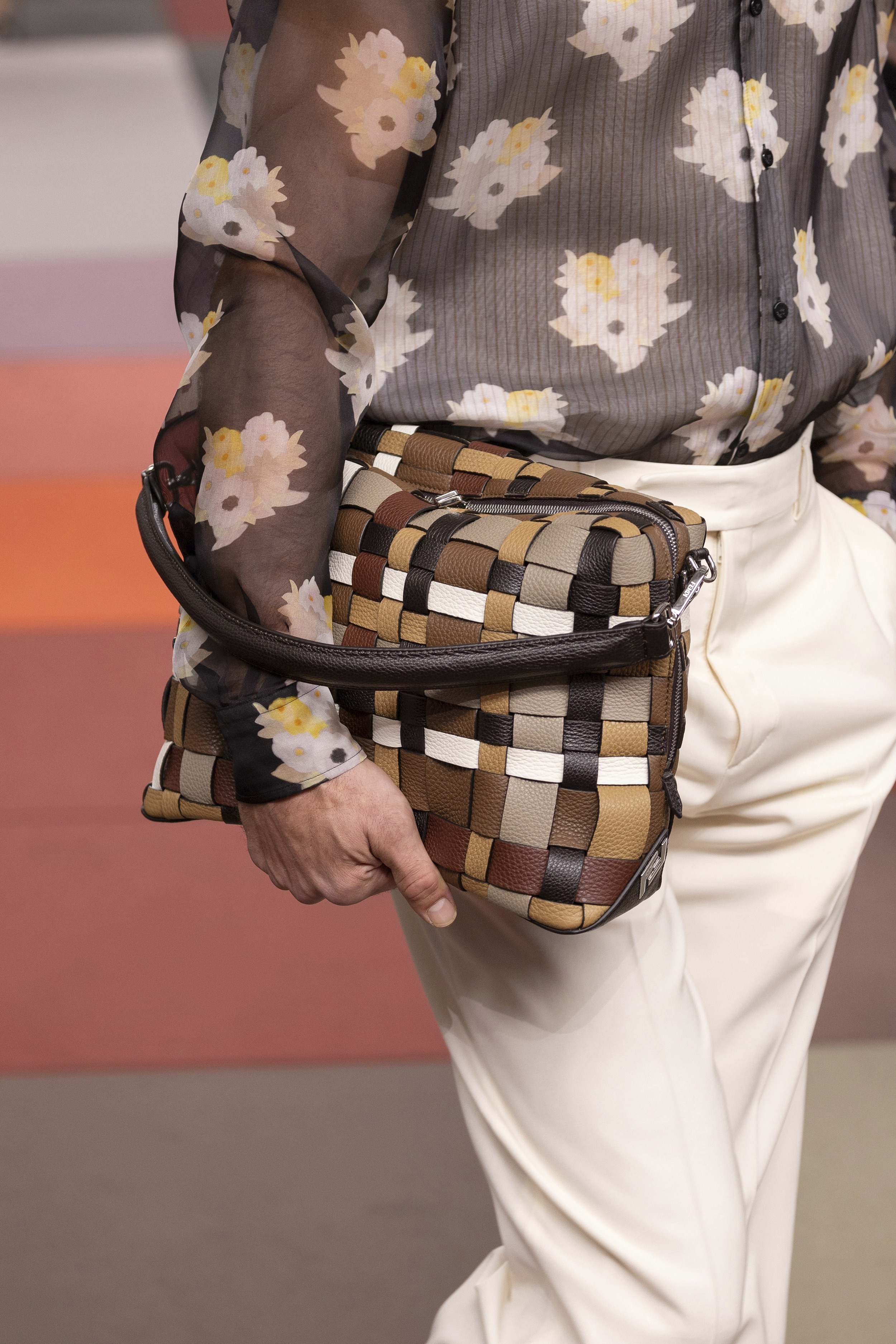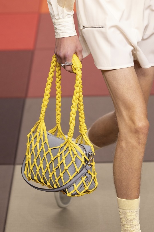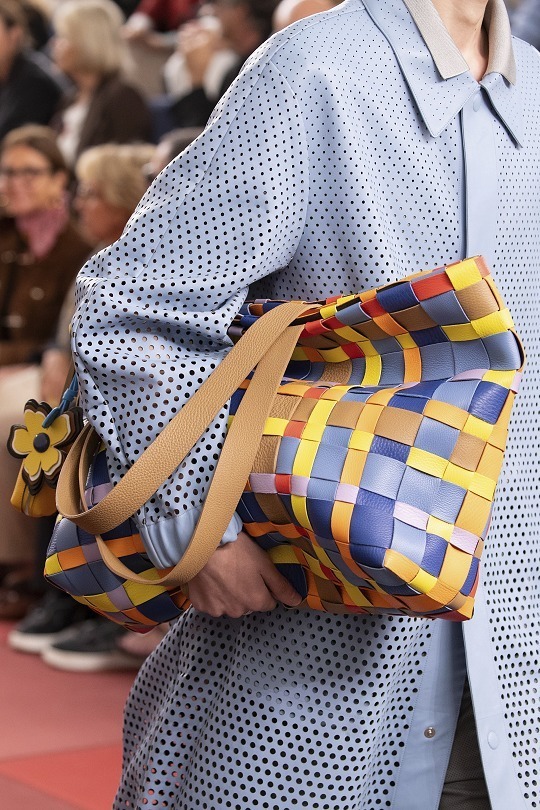 皮革编织工艺在包身交织出疏密有致的网格纹理,镂空设计营造出轻盈夏日氛围。或采用色彩斑斓的皮革余料、尼龙织带编织成像素化的网格图案,呈现万花筒般的视觉效果。