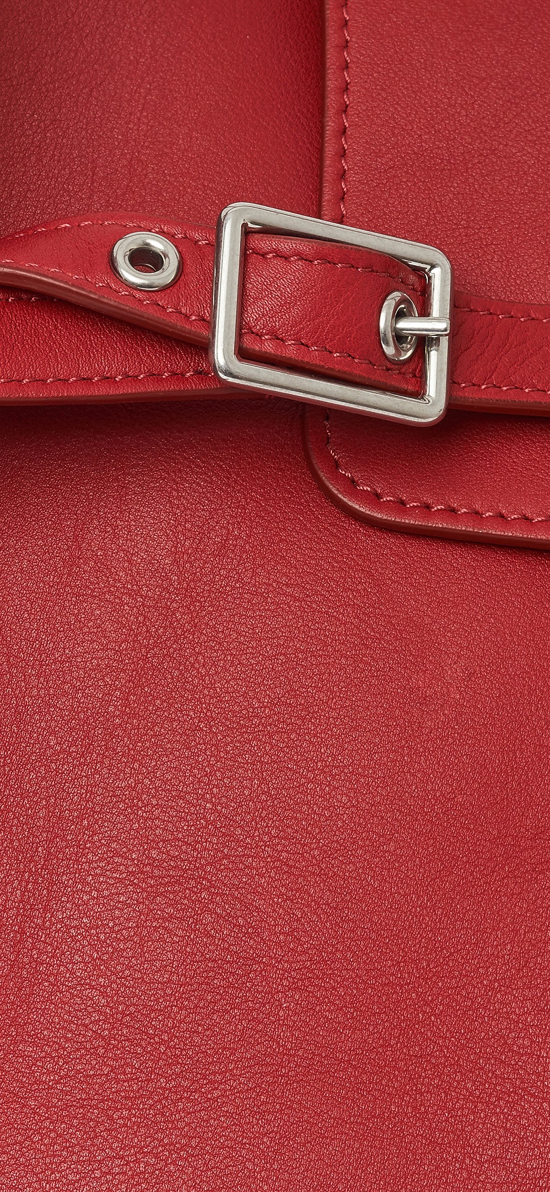 包扣采用孔眼皮带设计,将皮带穿过翻盖处的皮扣,缀挂在包身的皮带可以用金属扣固定并调节长度,或随性垂下,营造不经意的美感。