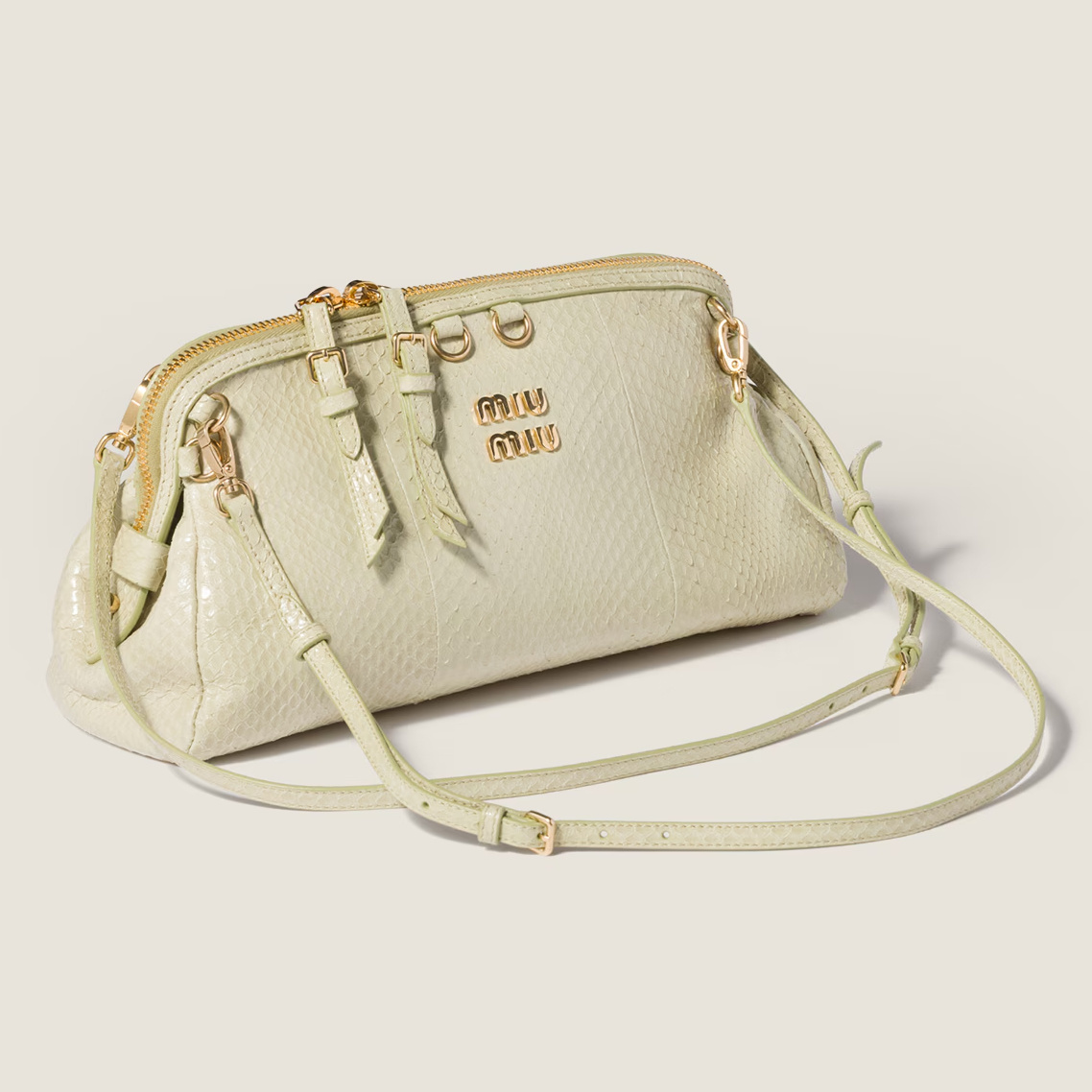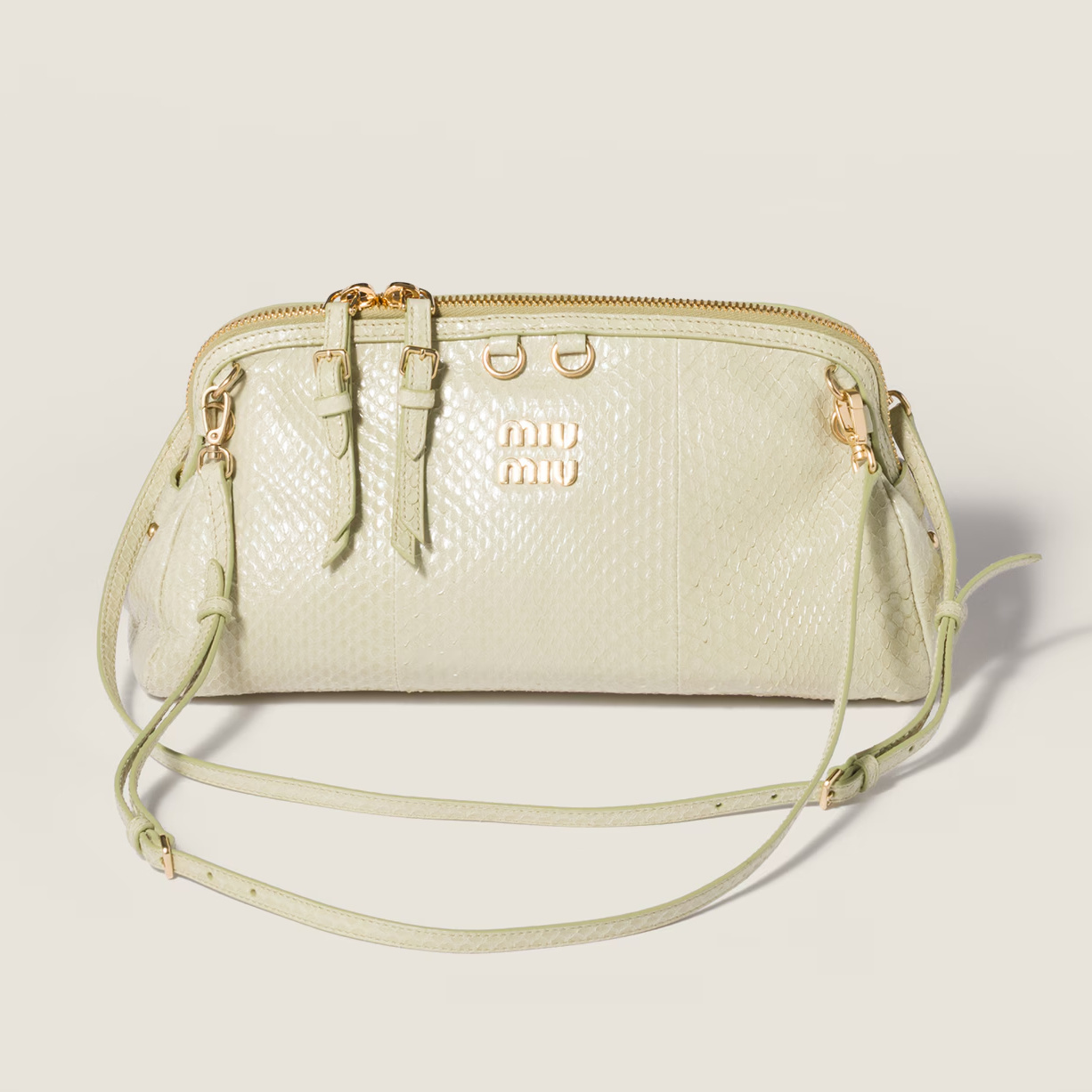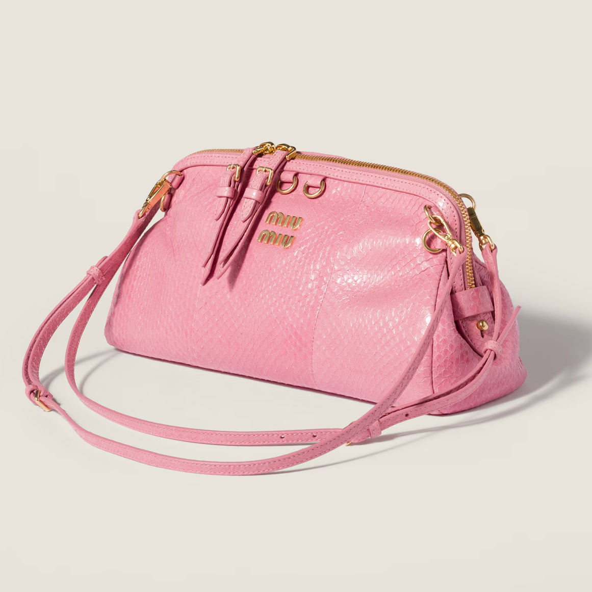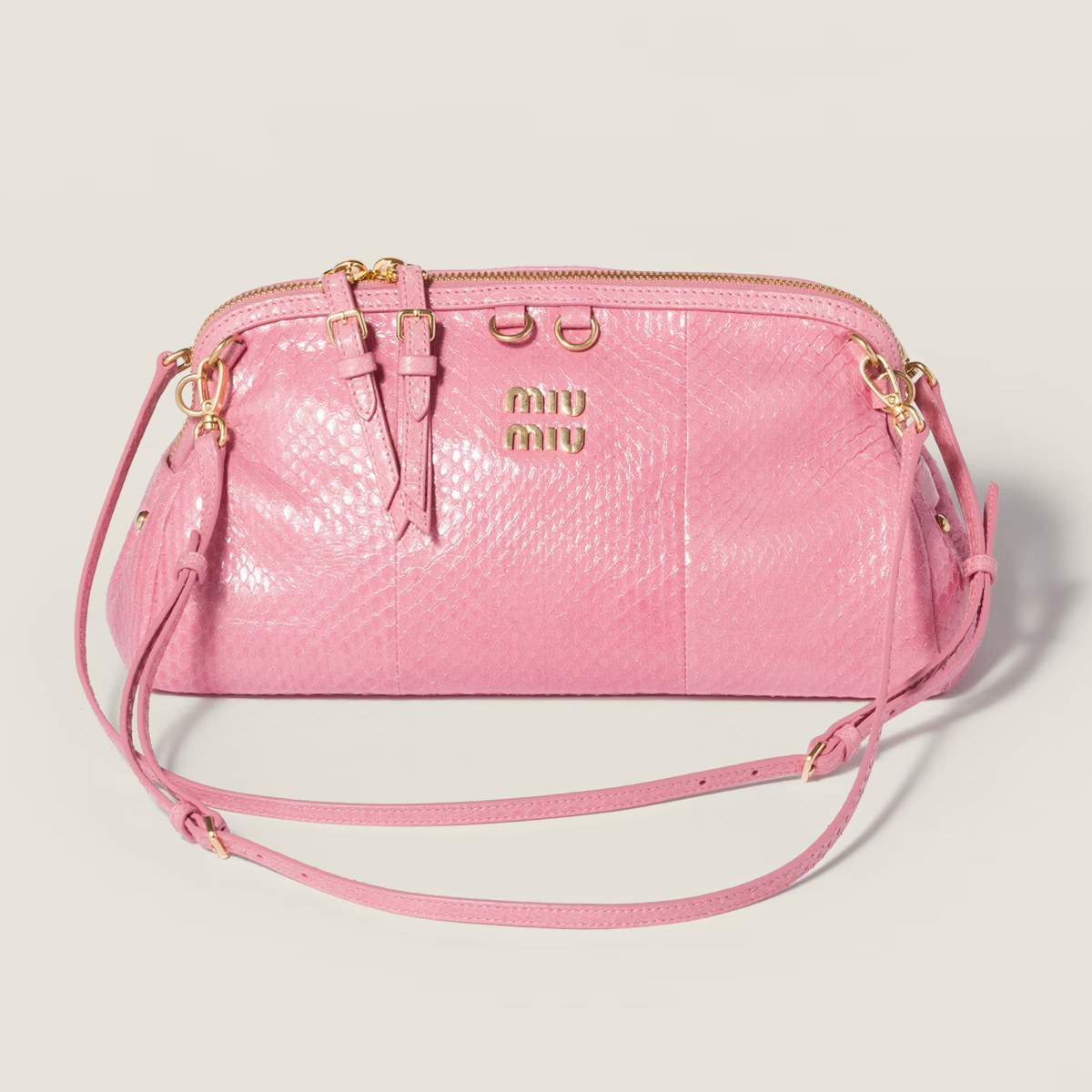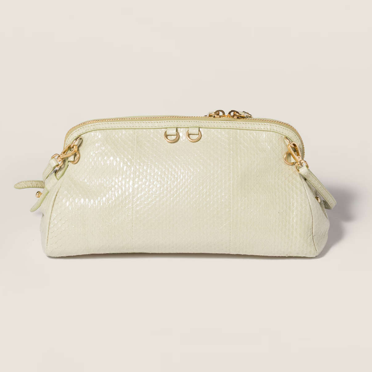 这款这款手拿包发布于 Miu Miu 2025秋冬秀场,采用修长圆润的钱袋形外观,搭配可拆卸的双提手设计,适应手捧、单肩和手提背法。亮点是采用 Ayers 水蛇皮制作通身,细密的天然网状鳞片更显精致。清新柔和的「开心果绿」让人联想到枝头萌发的嫩叶;「花瓣粉红」则衬托甜美可爱的气质。官价 ¥36,700