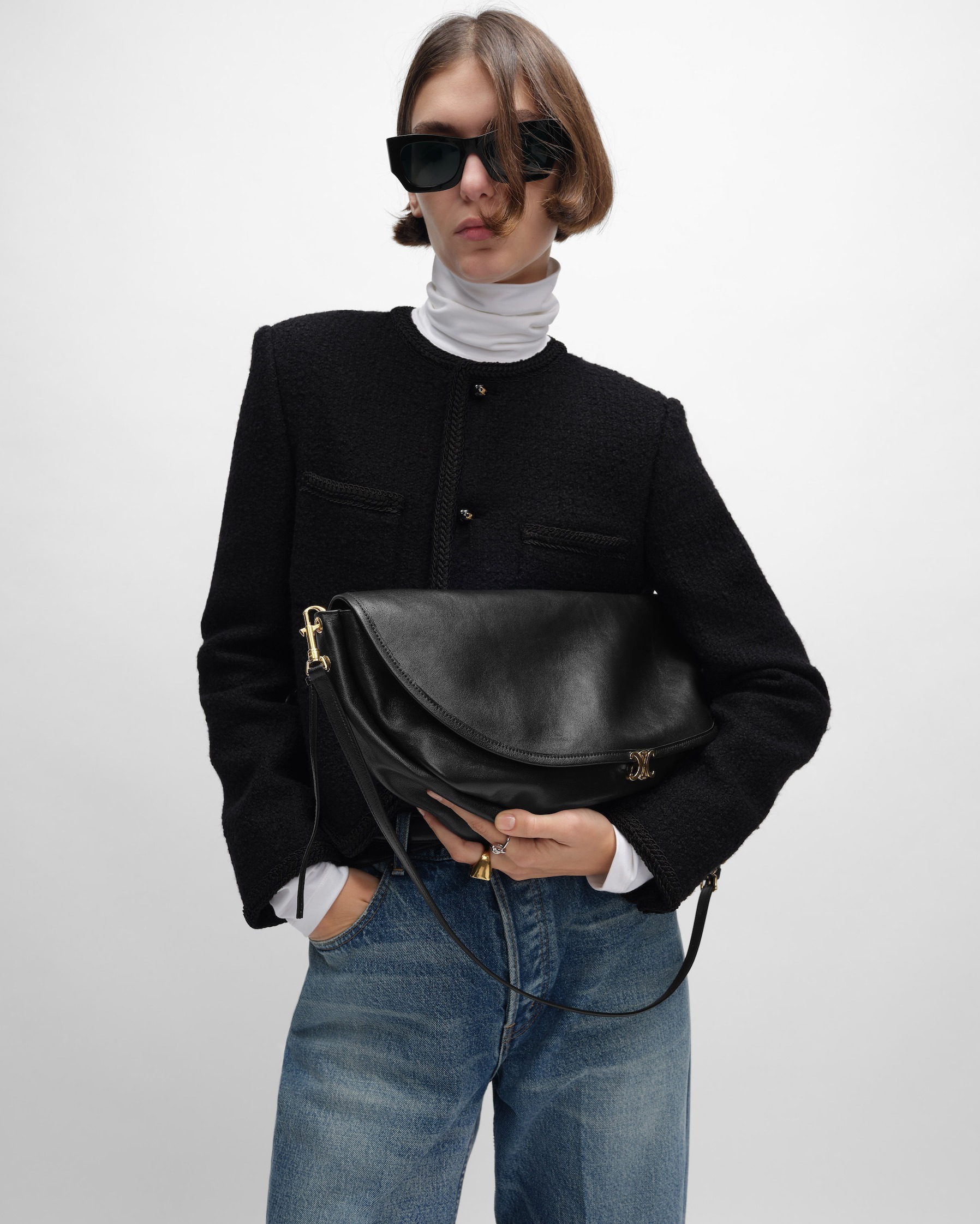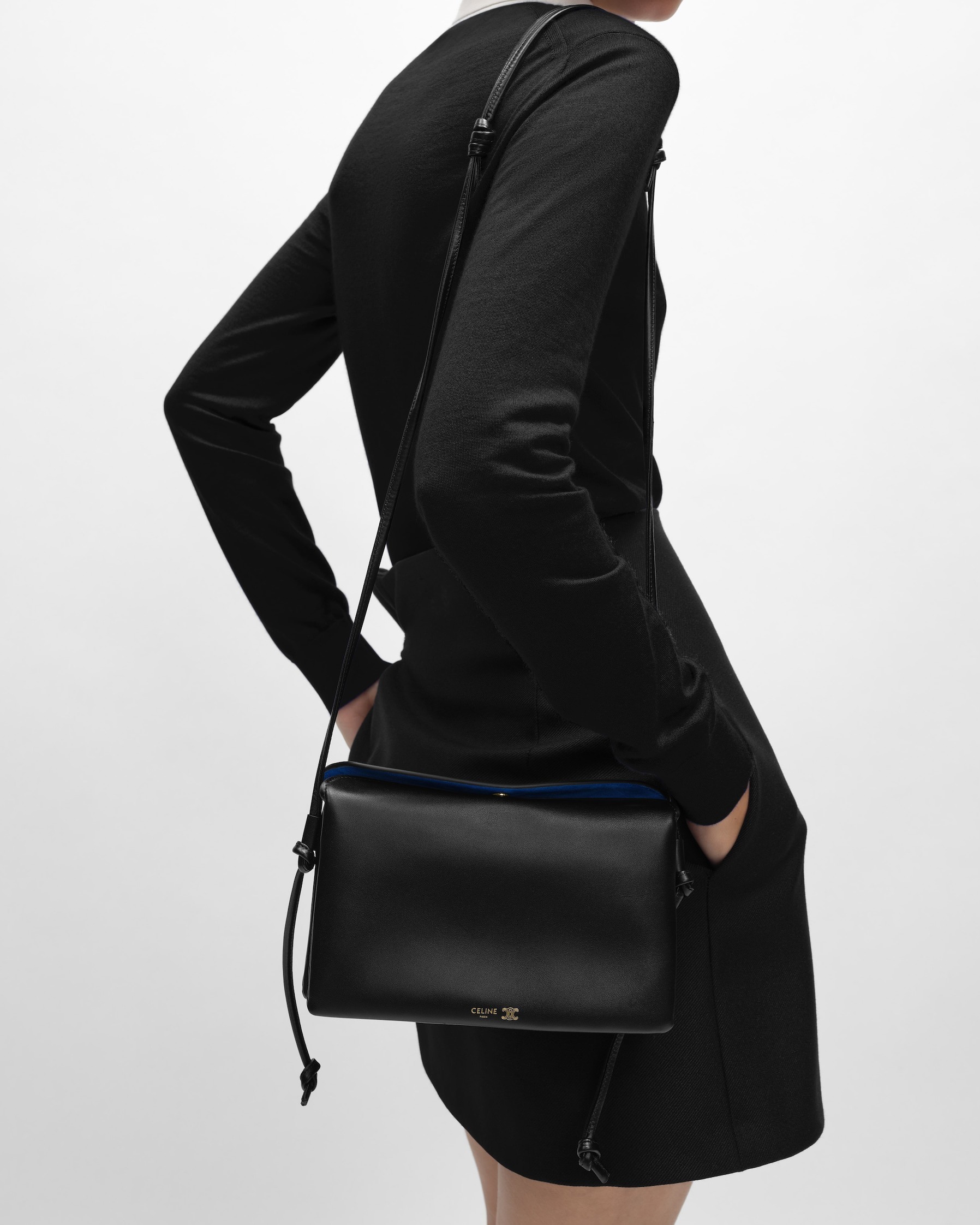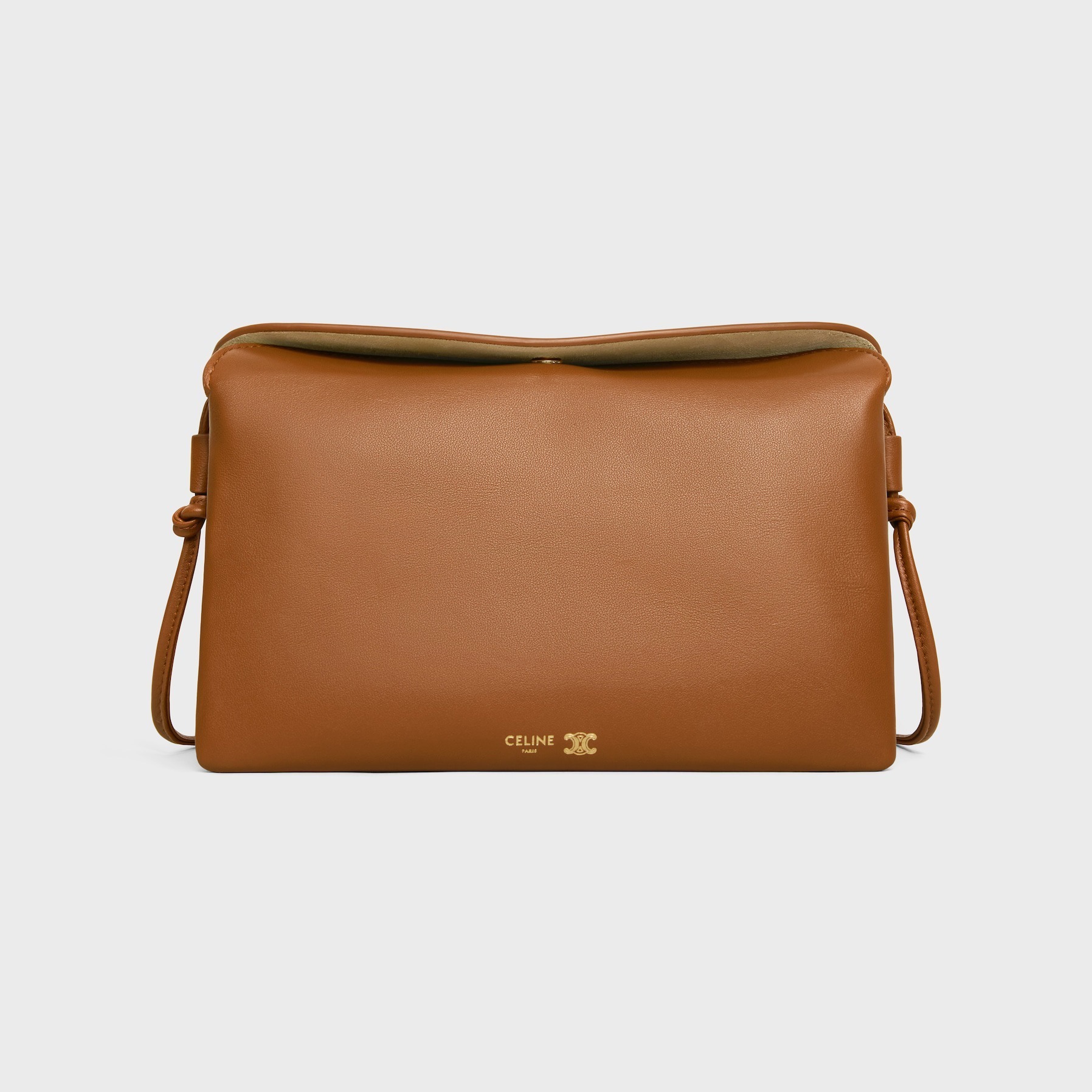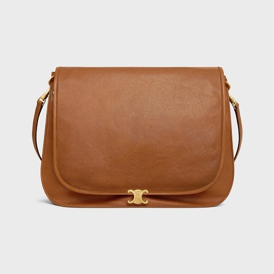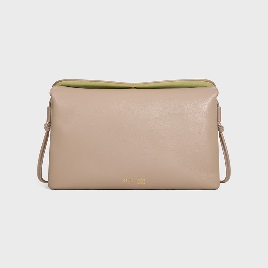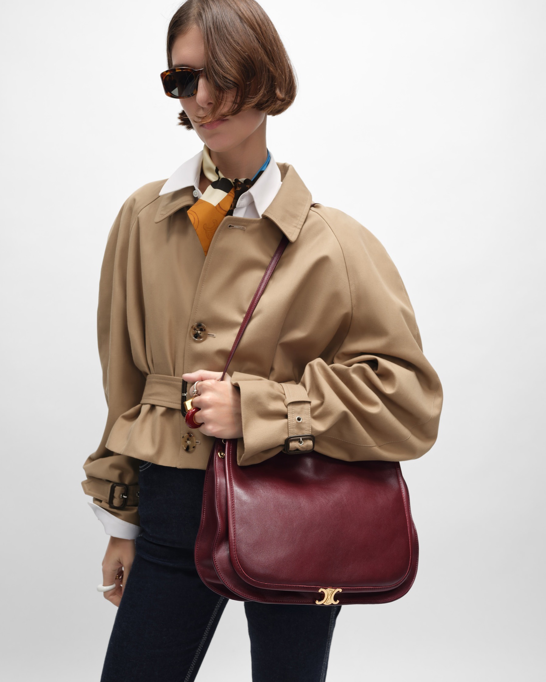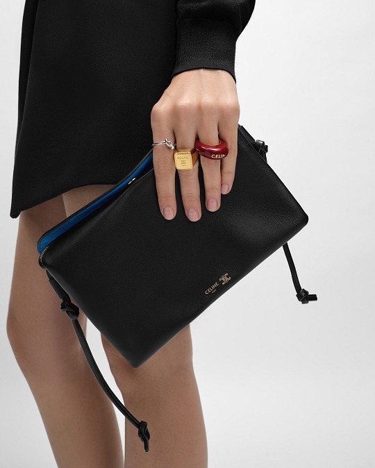 Trio Flap 手袋回溯 Old Céline 时期的 Trio 三合一手袋,包包采用柔软羊皮革塑造三层式风琴包结构,搭配对比鲜明的绒面牛皮革衬里,顶部 Triomphe 钉扣开合简洁而便利,中央拉链口袋提升安全指数,滑动式绳结肩带可实现多种背法。推出紫红色、浅棕褐色、风衣色、柑橘黄和黑色5种颜色选择,正面烫金徽标精巧点缀。