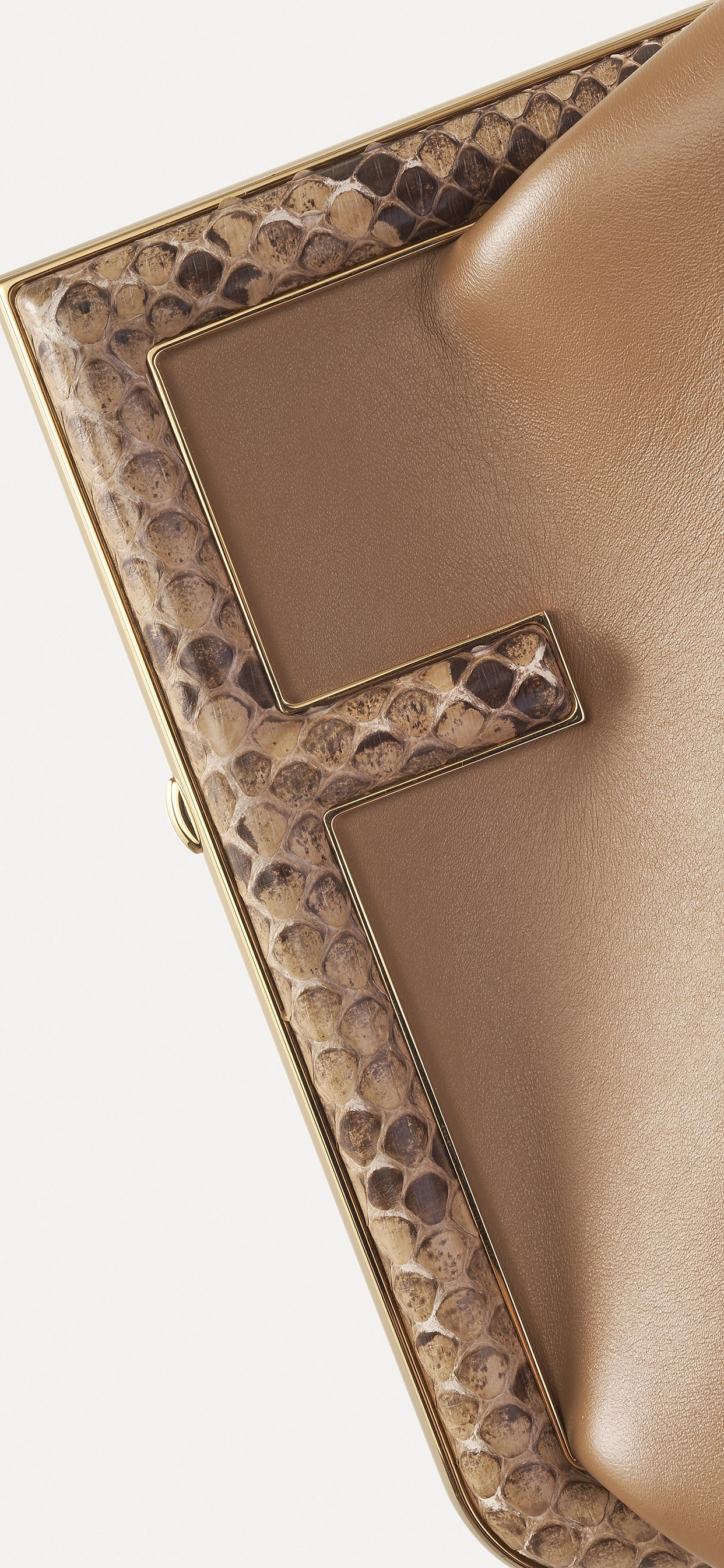 这个超大 F 字母采用抛光金色金属打造,矜贵的蟒蛇皮包裹立体 F 细节,外侧金属边缘勾勒凸显框架细节,硬朗线条为包包注入建筑般的廓形。值得一提的是,包包的框架外缘为曲面结构,保证了安全性和舒适度。