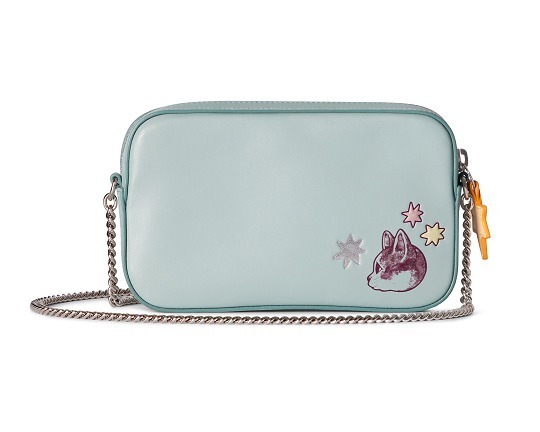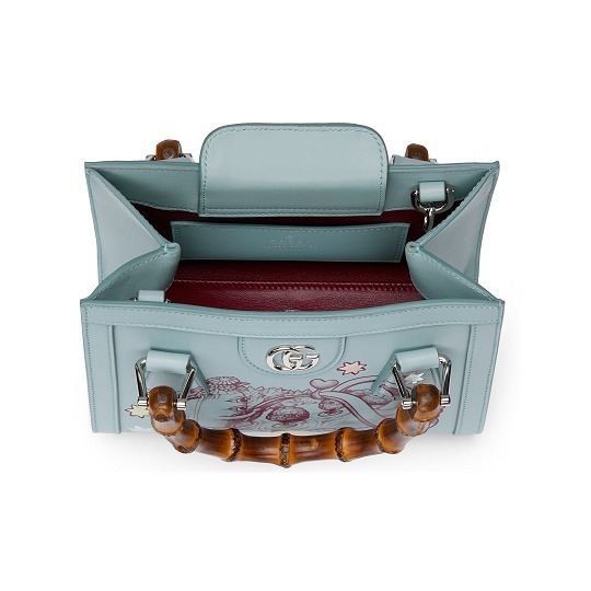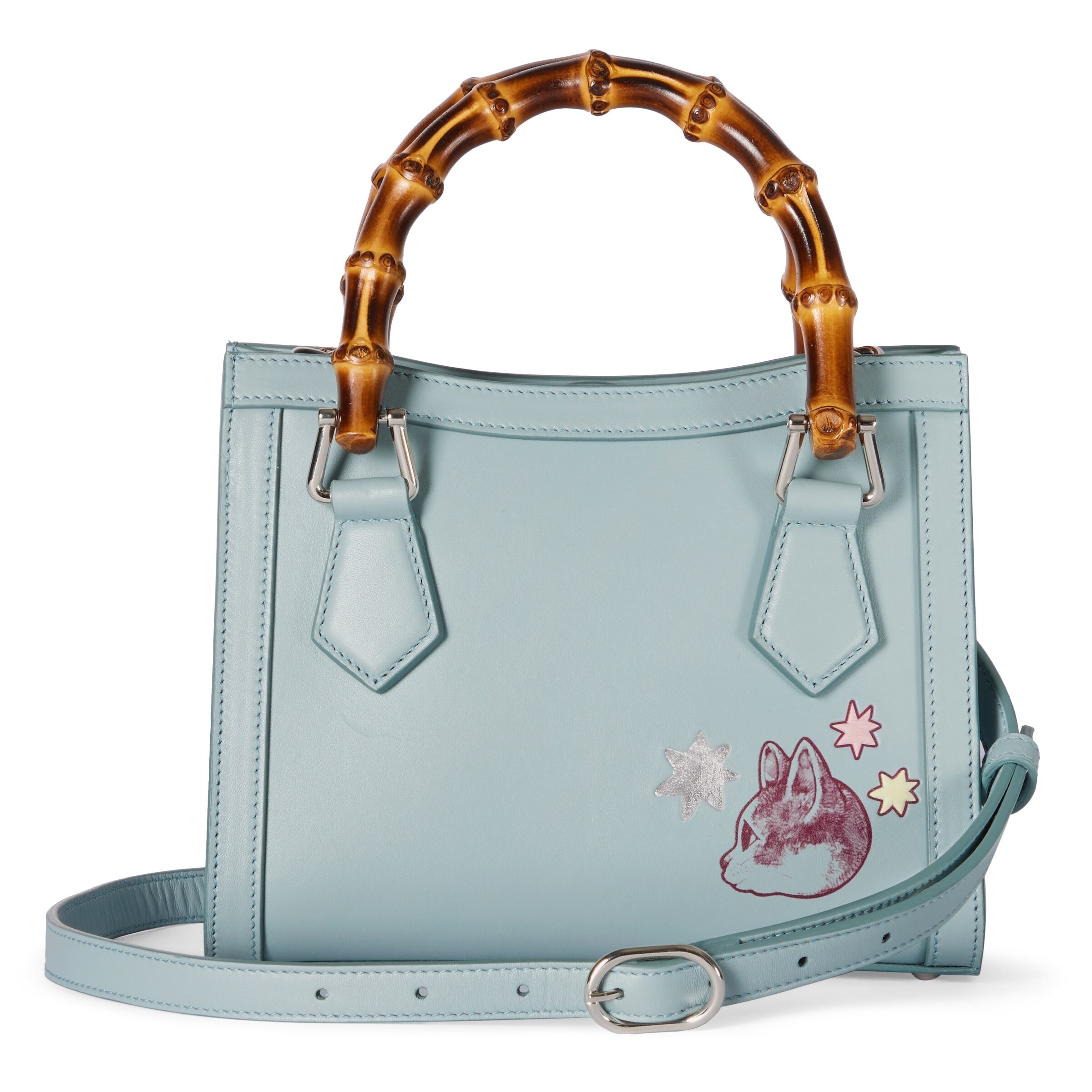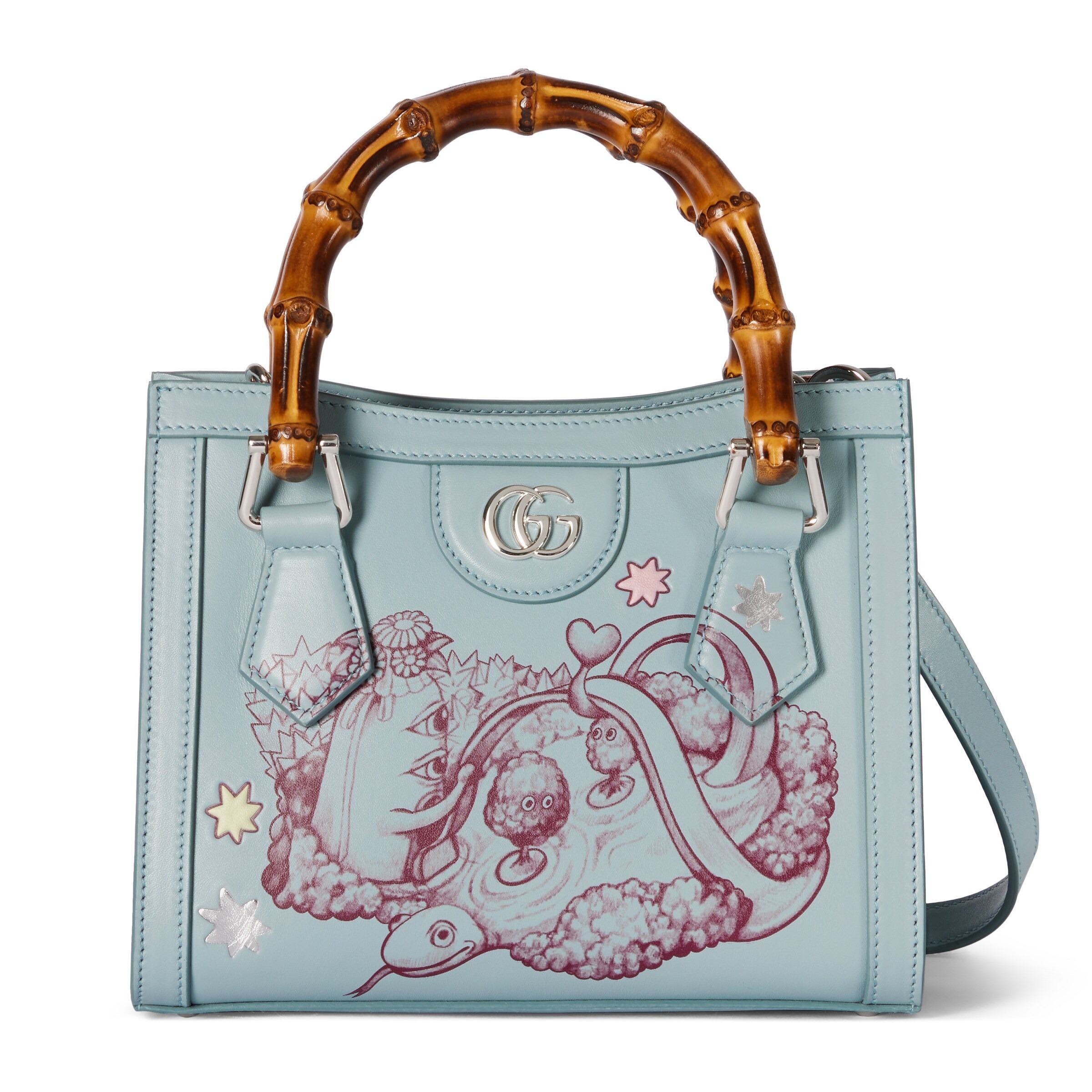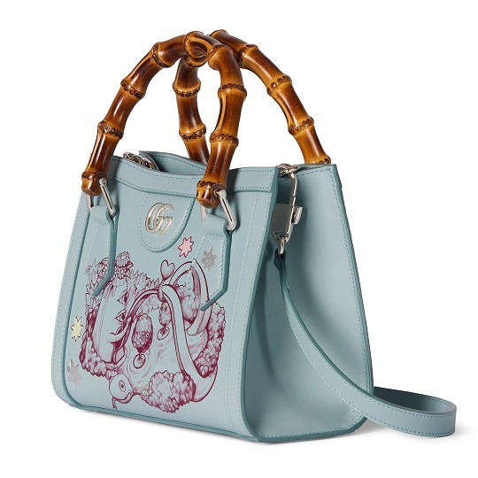 小号 Diana 手袋以清新的冰蓝色为基调,包身妆点「瞳酱」和森林精灵主题插画,充满节日氛围的银色、粉色、浅绿色「伯利恒之星」点缀其间。拱形竹节手柄让人联想到日本的古老传说《竹取物语》,展现东西方文化的交汇。