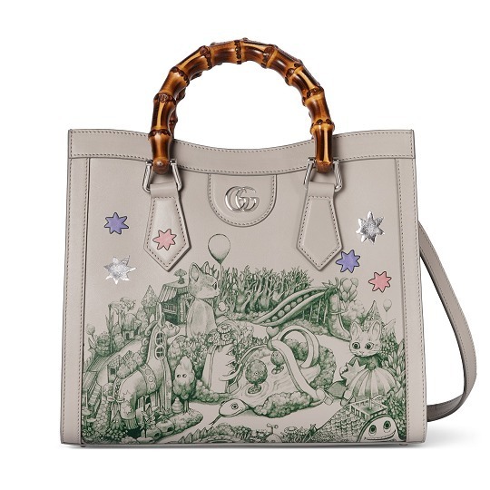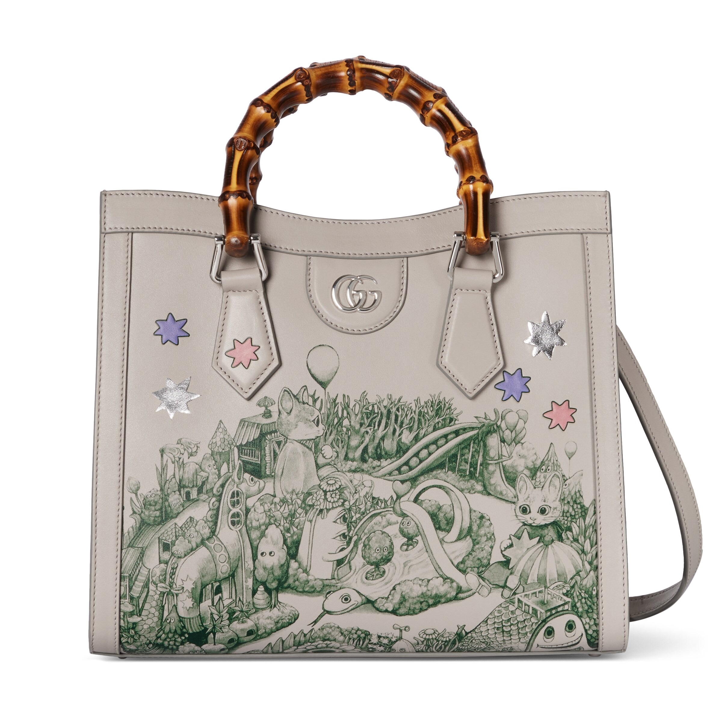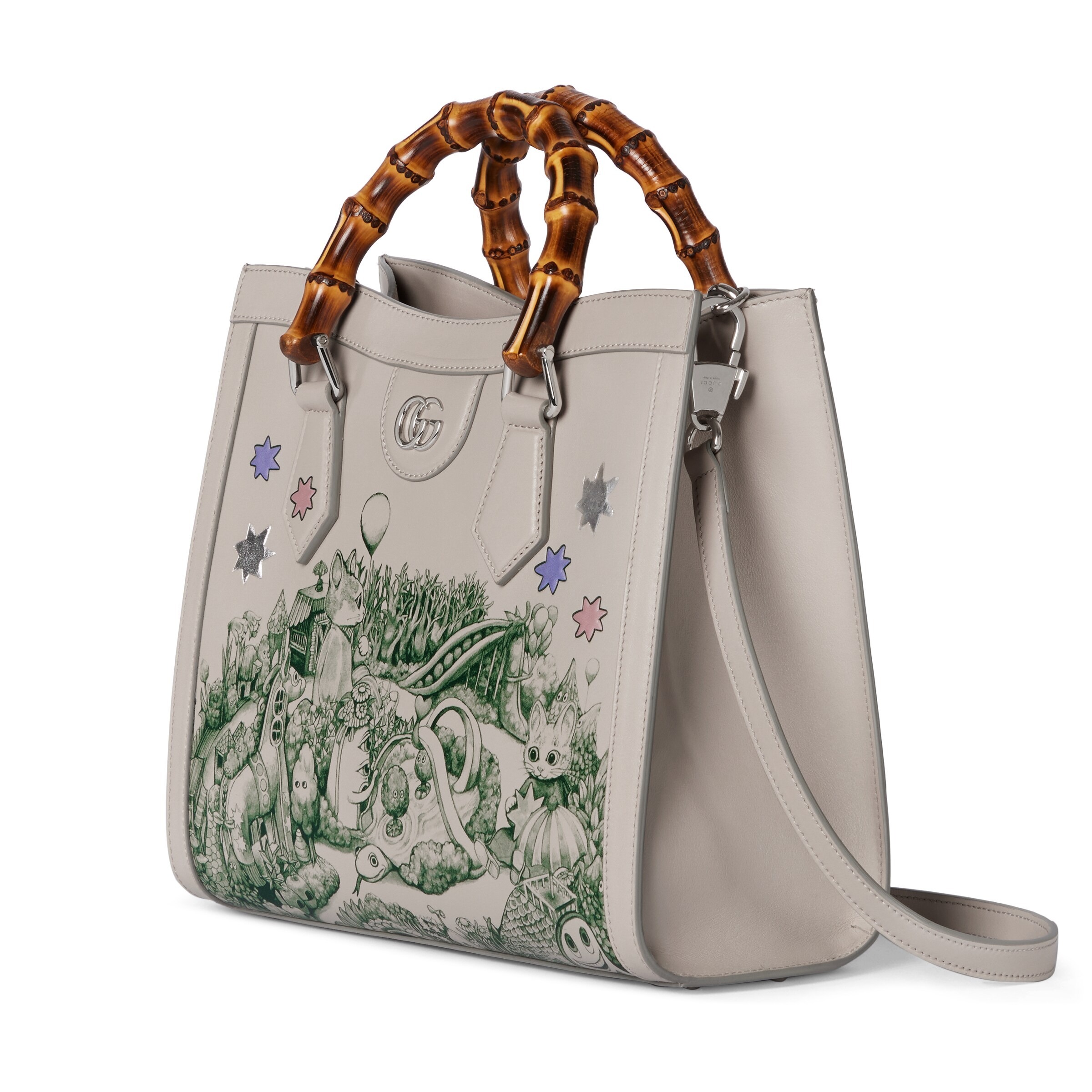 中号 Diana 竹节手袋以浅灰色皮革为背景,在包身呈现充满奇幻色彩的魔法森林游乐园场景,樋口裕子笔下标志性的角色——猫咪 Bo 和 Boris、独眼怪「瞳酱」(Hitotsume)与各种古怪生物化身为乐园中的奇趣景观,细致温柔的笔触和古灵精怪的画风为包包注入童话气息。