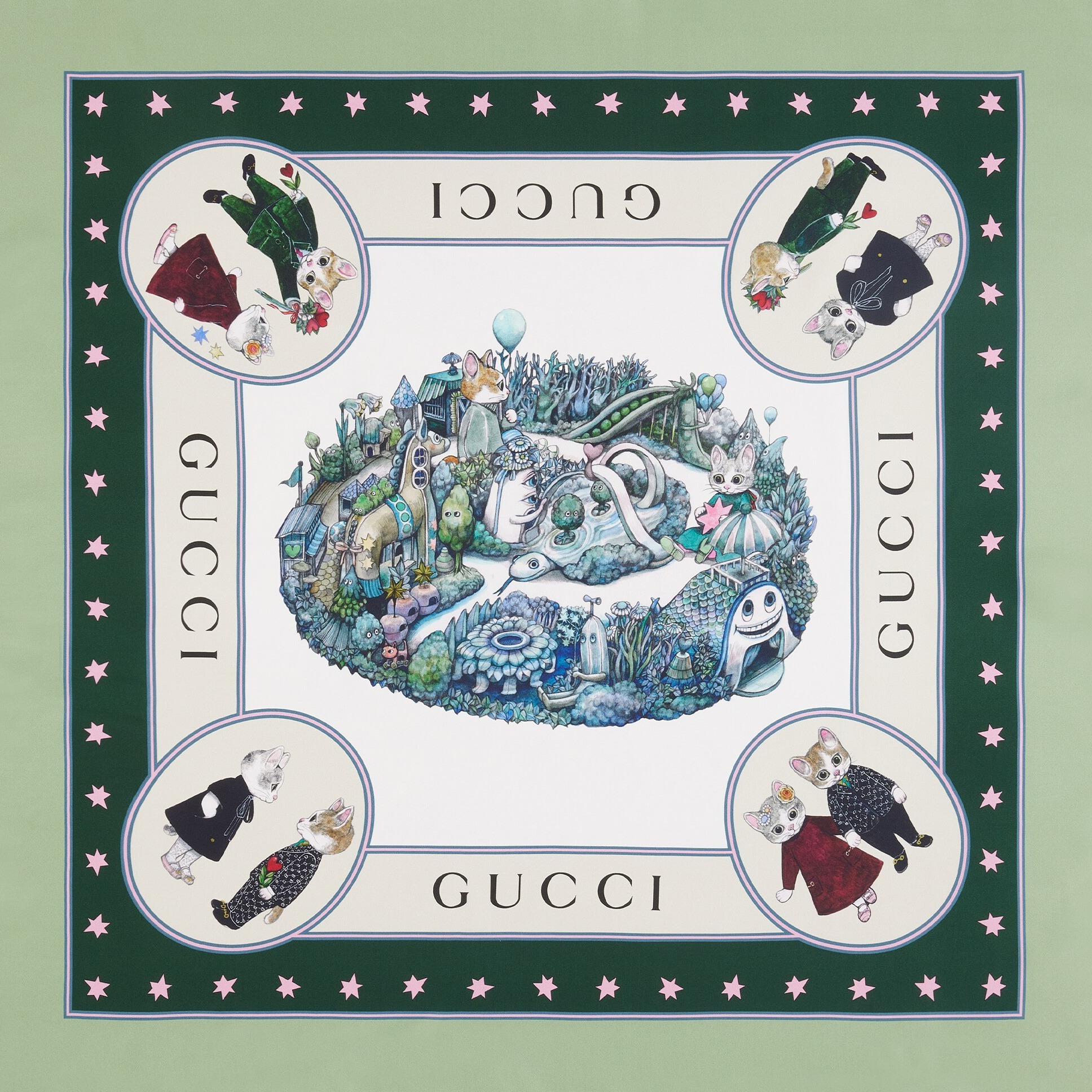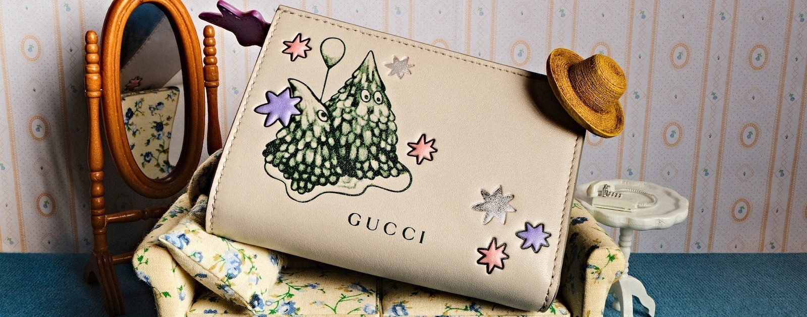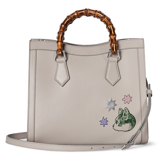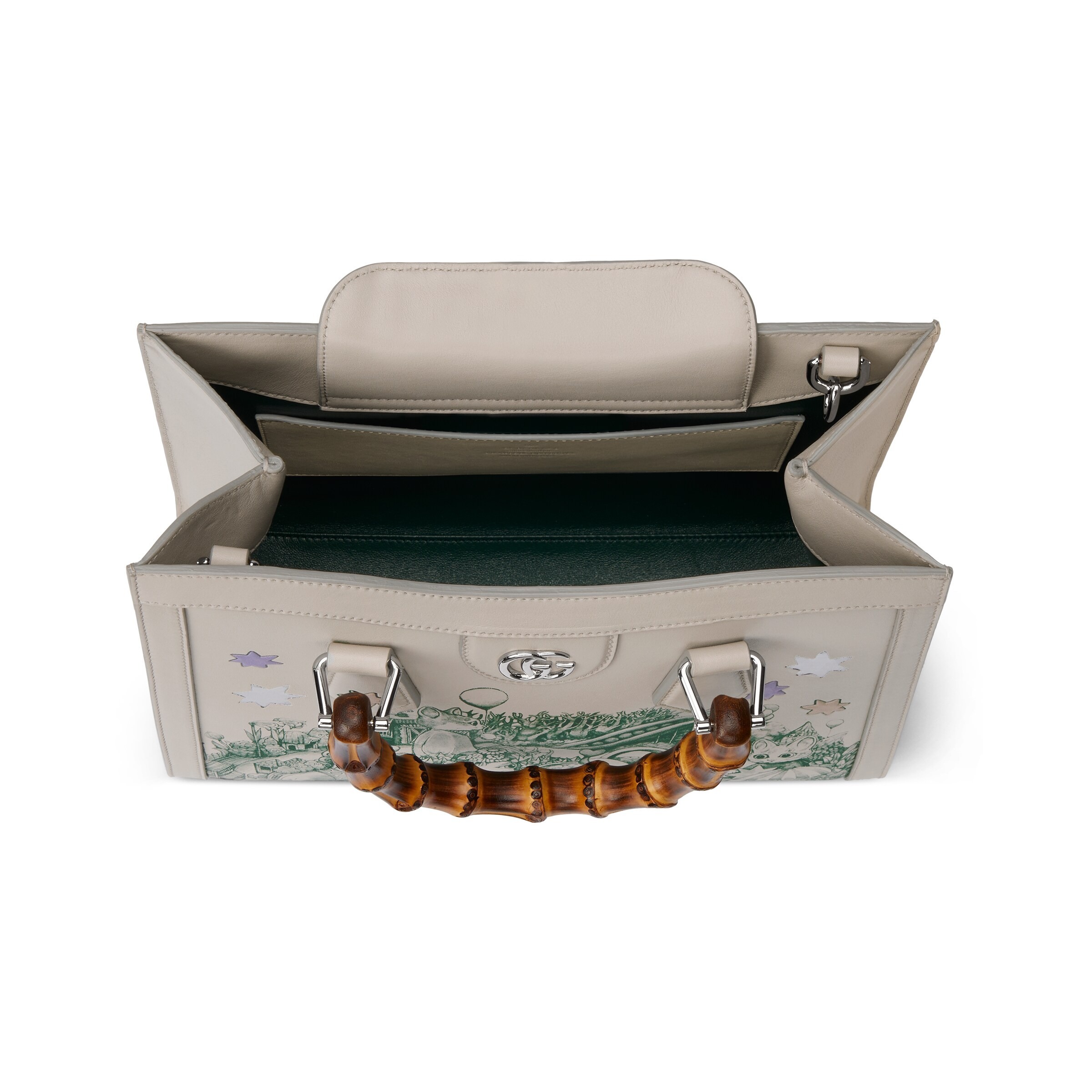 中号 Diana 竹节手袋以浅灰色皮革为背景,在包身呈现充满奇幻色彩的魔法森林游乐园场景,樋口裕子笔下标志性的角色——猫咪 Bo 和 Boris、独眼怪「瞳酱」(Hitotsume)与各种古怪生物化身为乐园中的奇趣景观,细致温柔的笔触和古灵精怪的画风为包包注入童话气息。