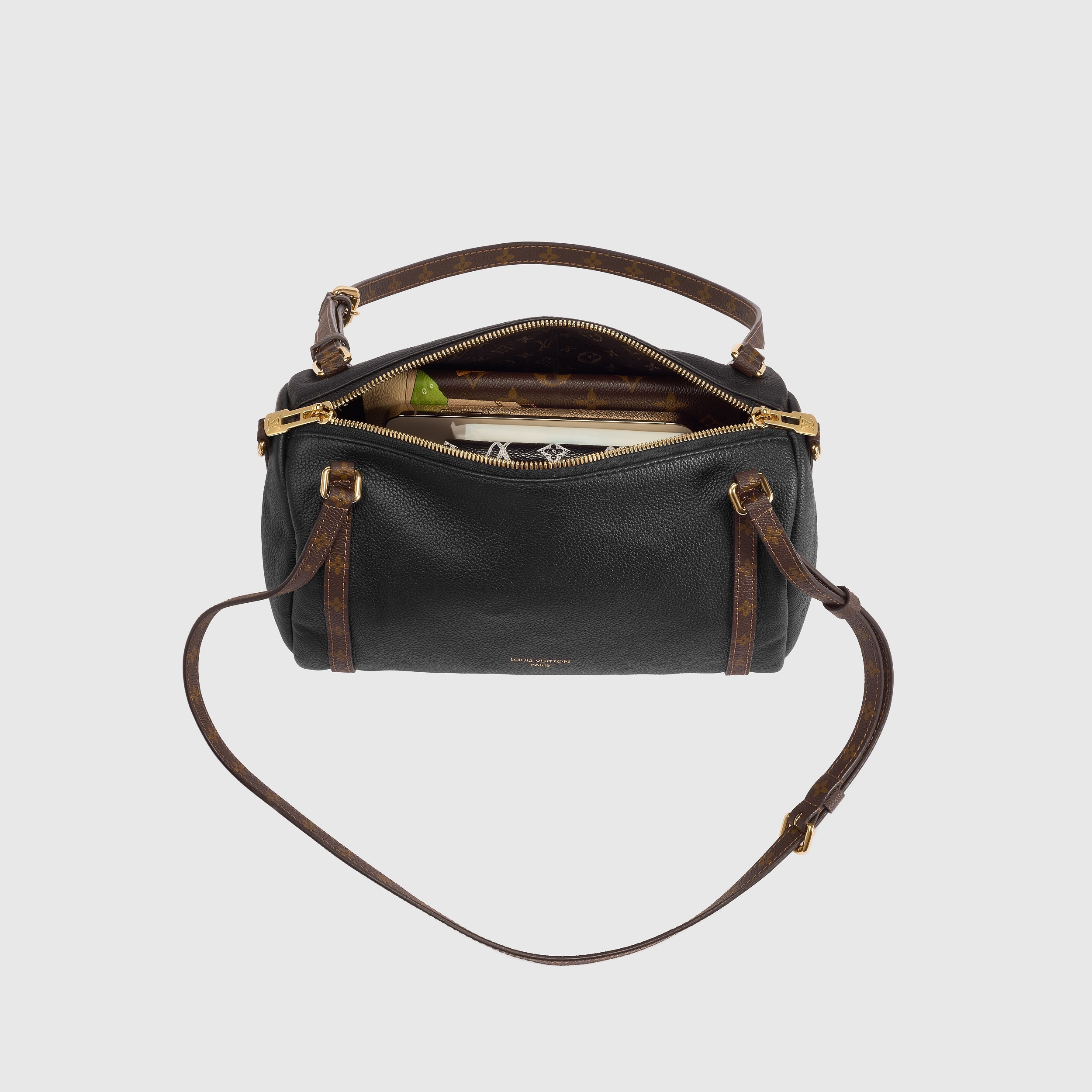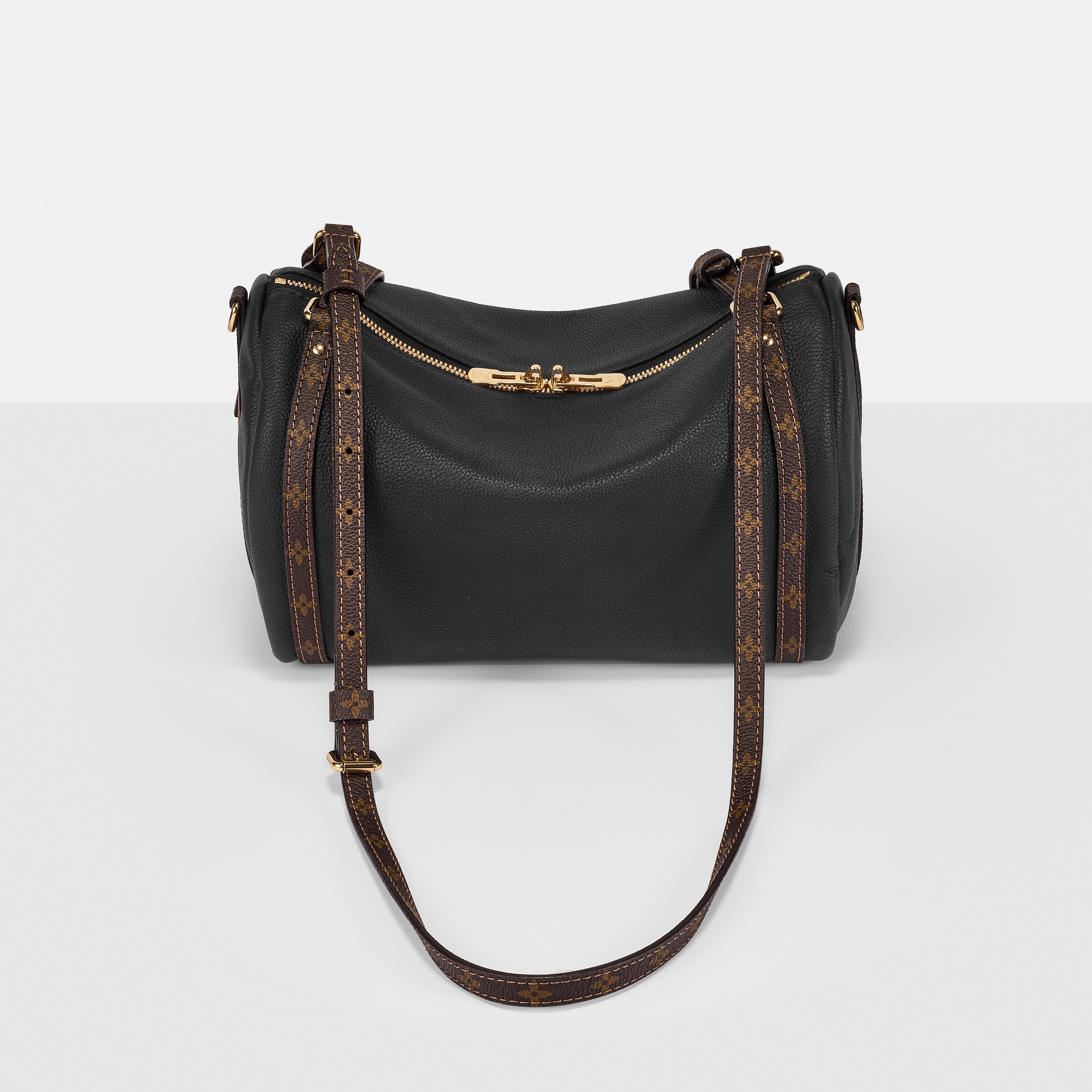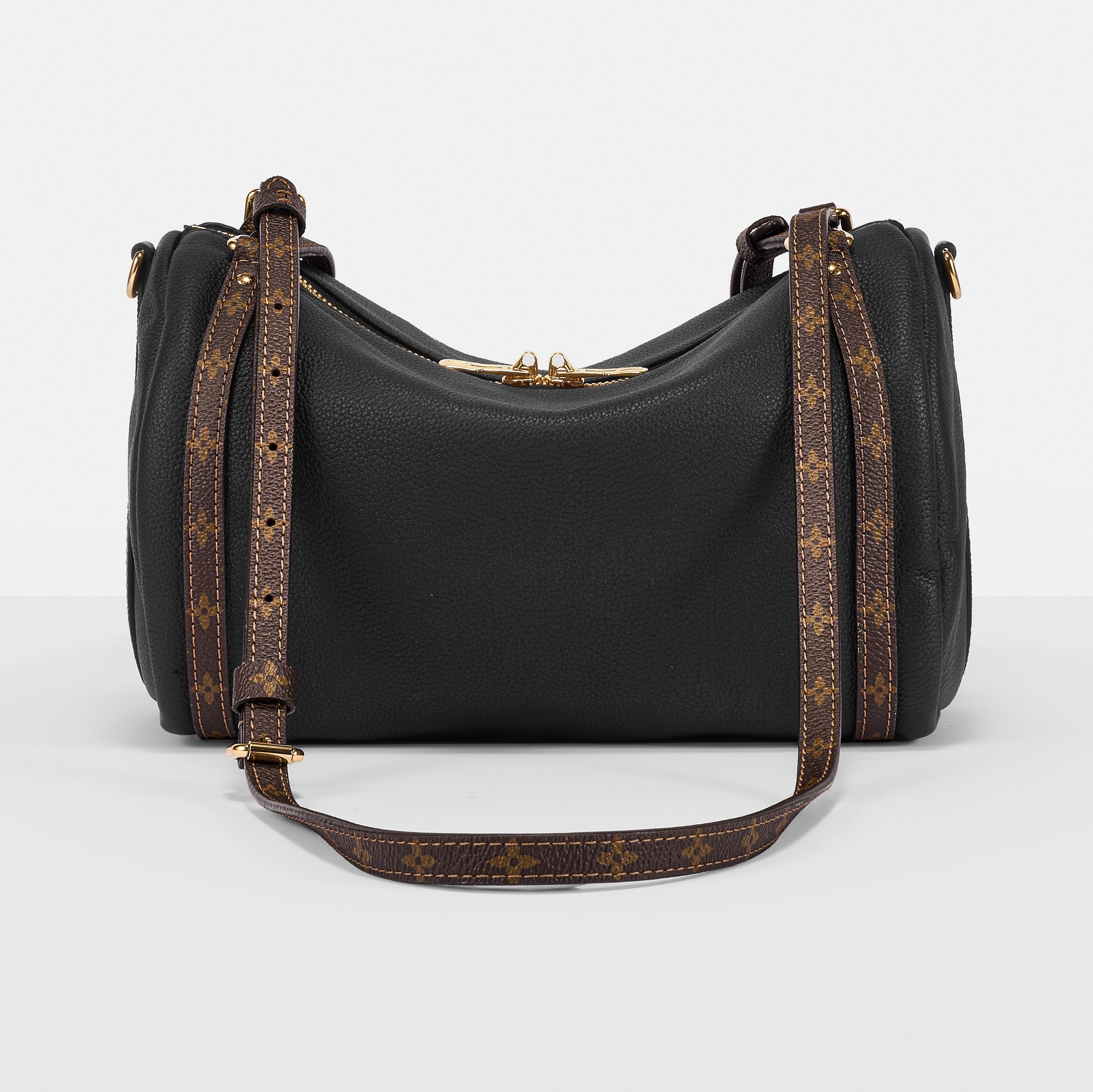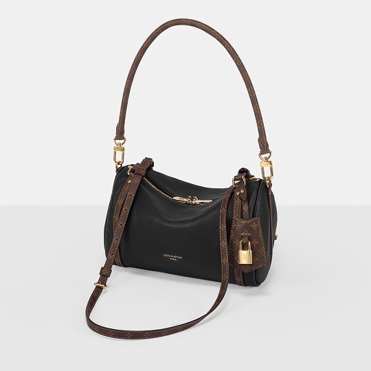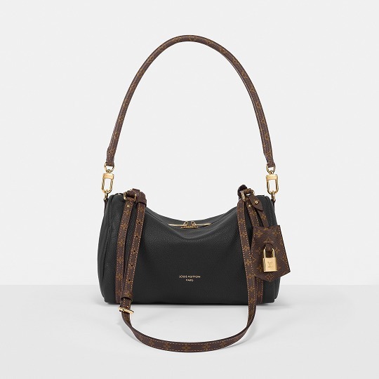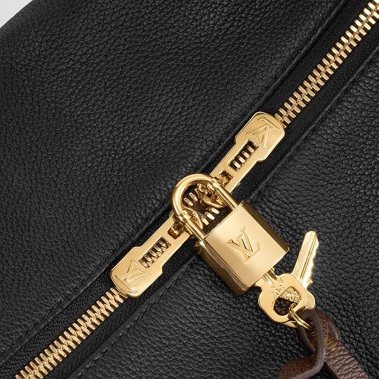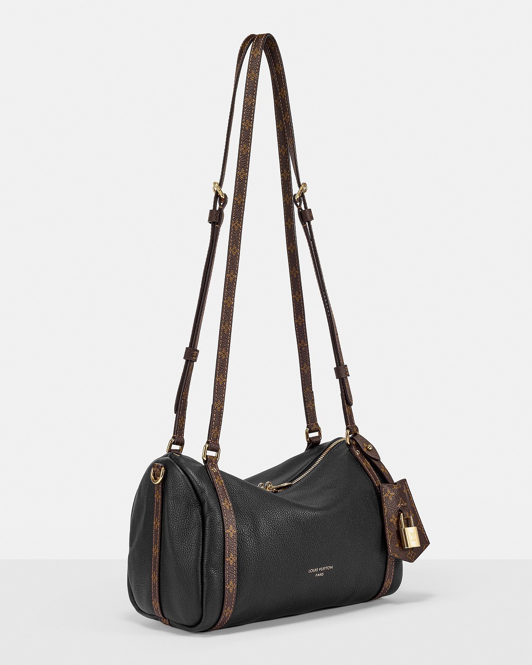 包包延续 Keepall 旅行袋的经典轮廓,采用黑色粒面小牛皮塑造柔软灵活的包身,Monogram 帆布装饰手柄和钥匙包,金属挂锁固定双拉链开合。