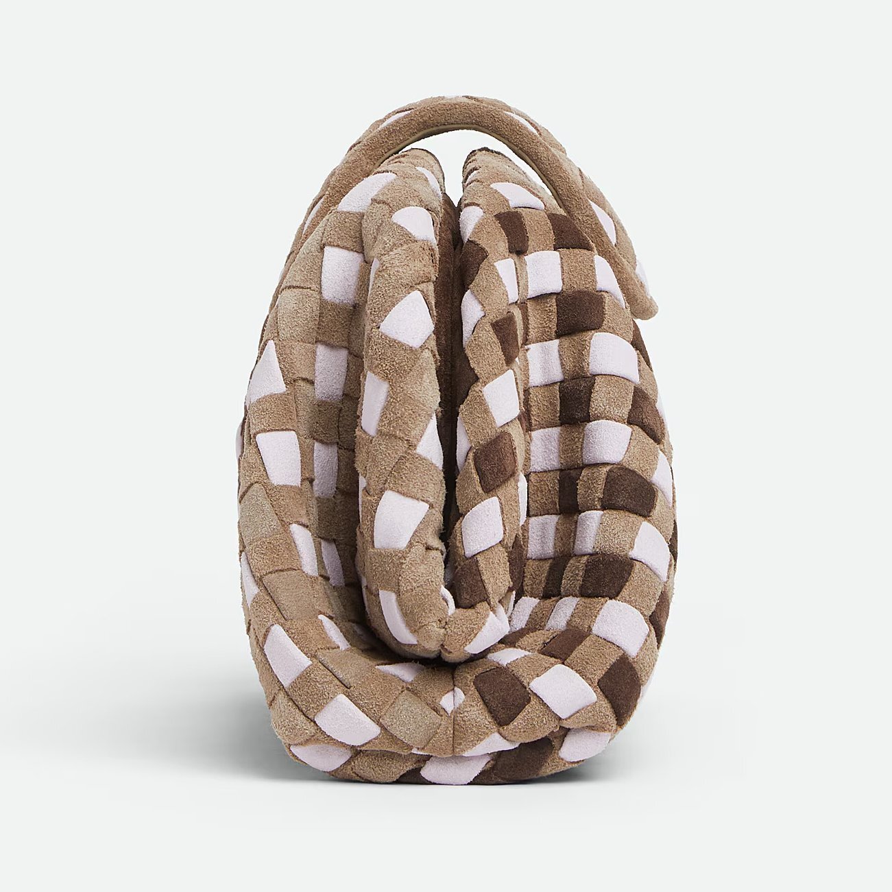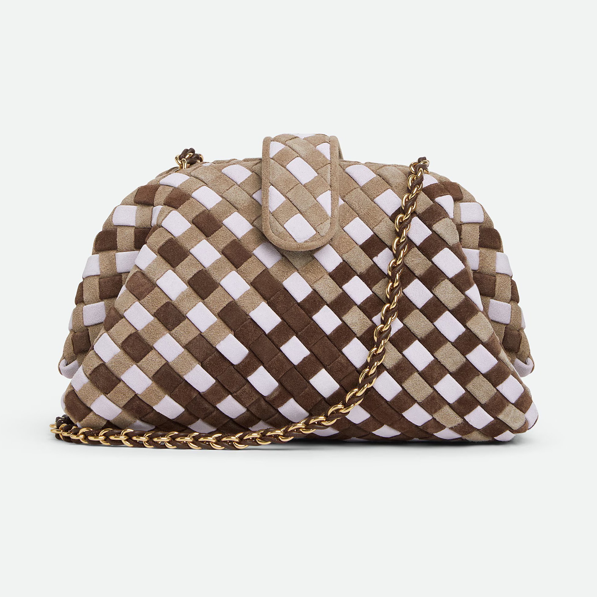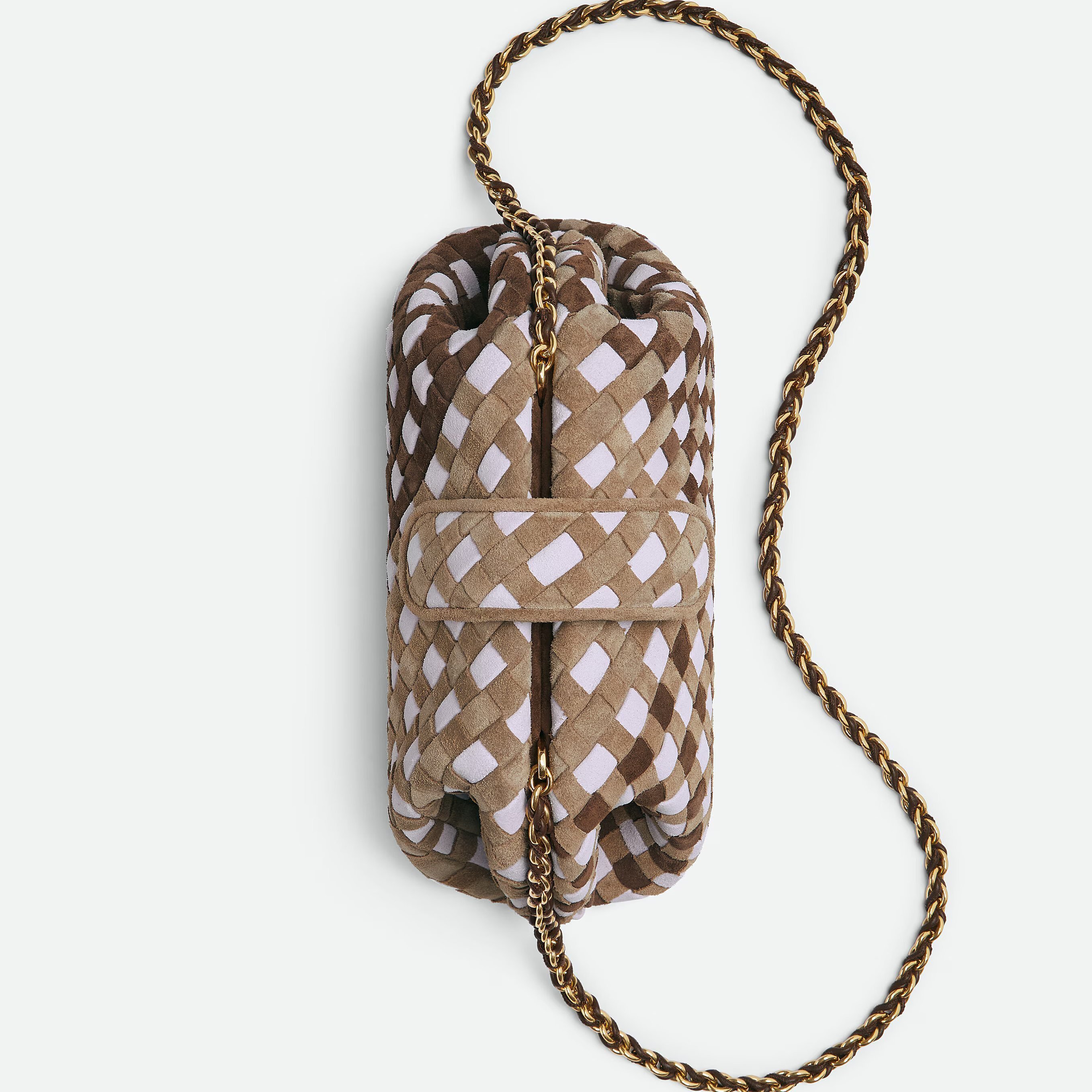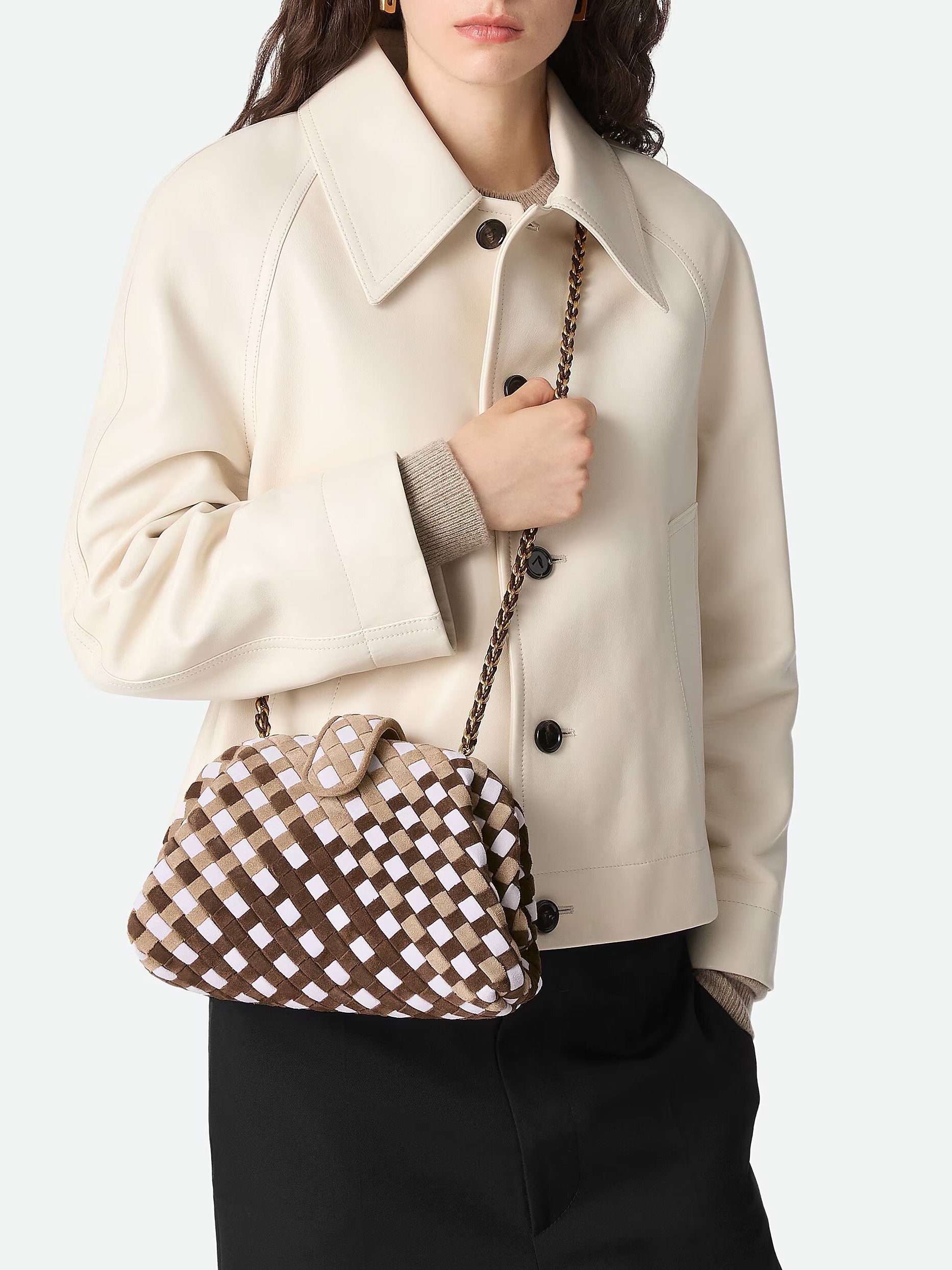小号 Lauren 1980 手袋同样以剩余优质绒面革打造编织袋身,设计师特别挑选白色、奶茶色和布朗尼棕色3种颜色交织,让人联想到秋冬季温暖又复古的格纹衬衫。