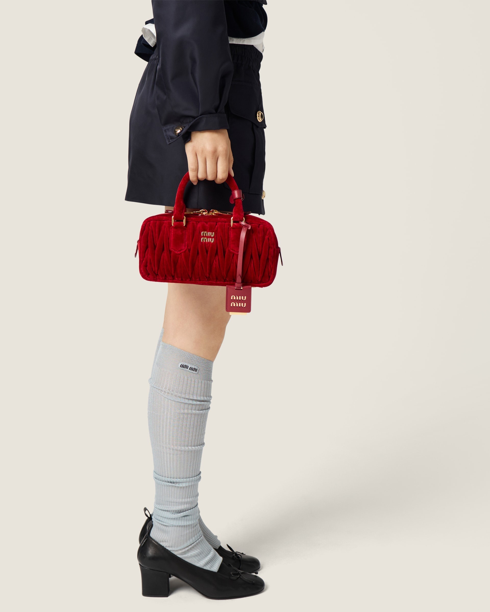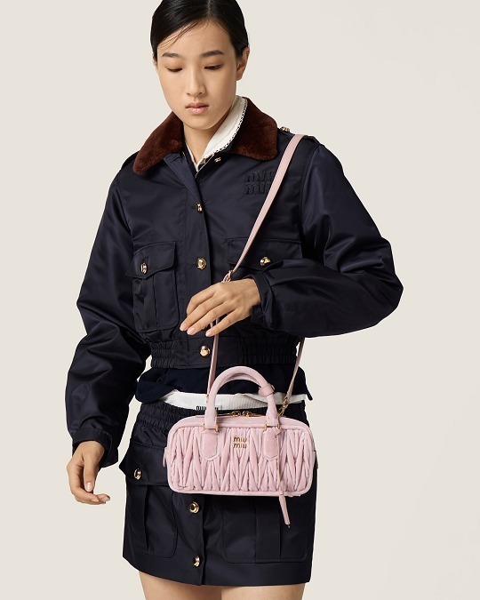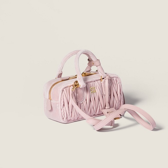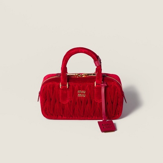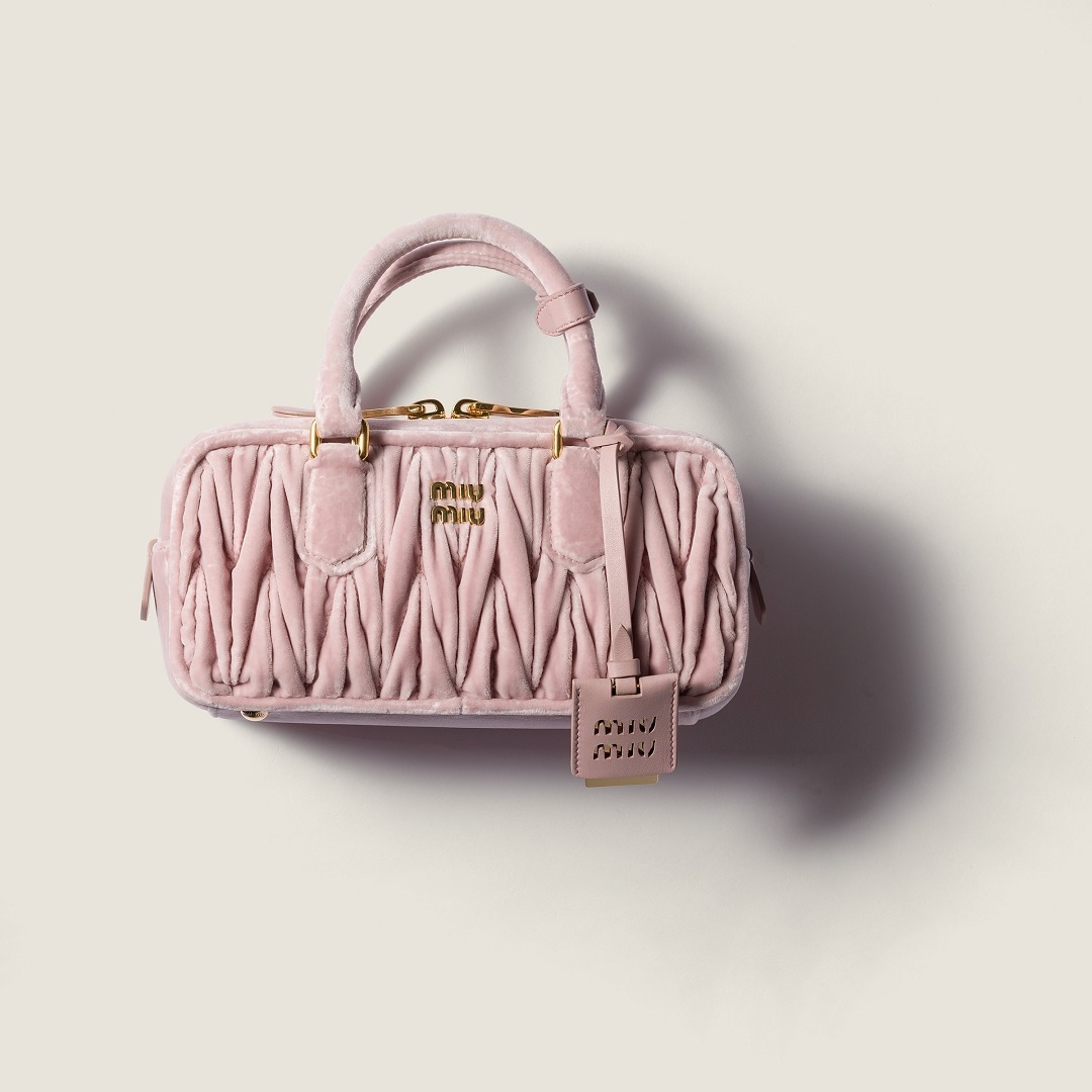 Arcadie 手袋的名字源自古希腊神话中的「理想之地」(Arcadia),采用复古保龄球包型搭配双向拉链、金属徽标和顶部双提手设计。新作同样焕以红色、粉色和黑色丝绒面料制作而成,饱满绗缝纹路在光泽感丝绒烘托下显得优雅而别致。