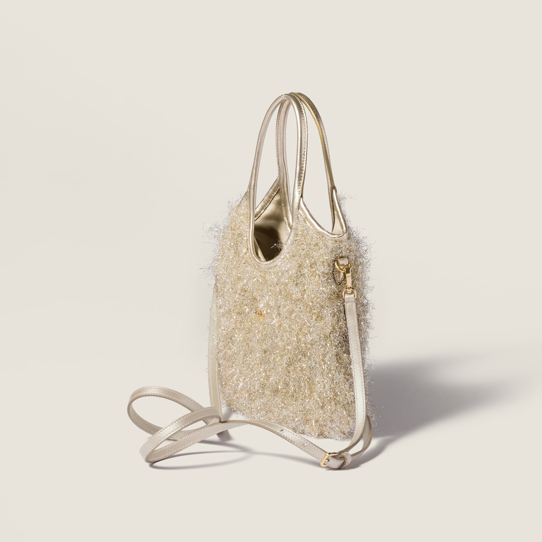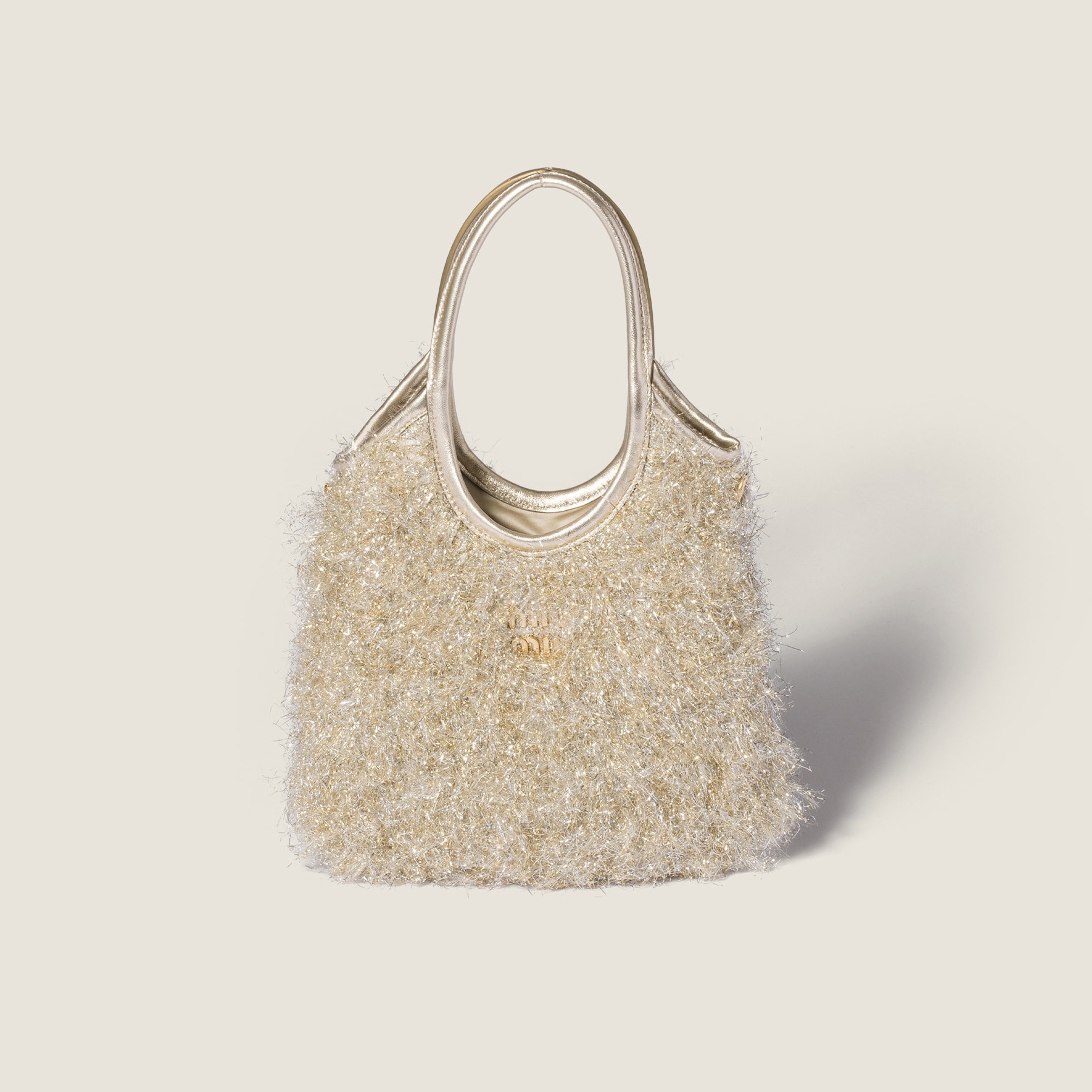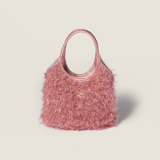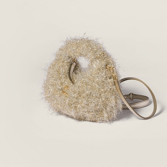 这组 Wander 手袋和 Ivy 托特包在包身织入亮晶晶的 Lurex 金银丝线,搭配同色系金属质感皮革饰边、可拆卸肩带和缎面里衬,整只包包闪耀灵动华彩,打造专属于 Miu Miu 女孩们的闪亮圣诞。