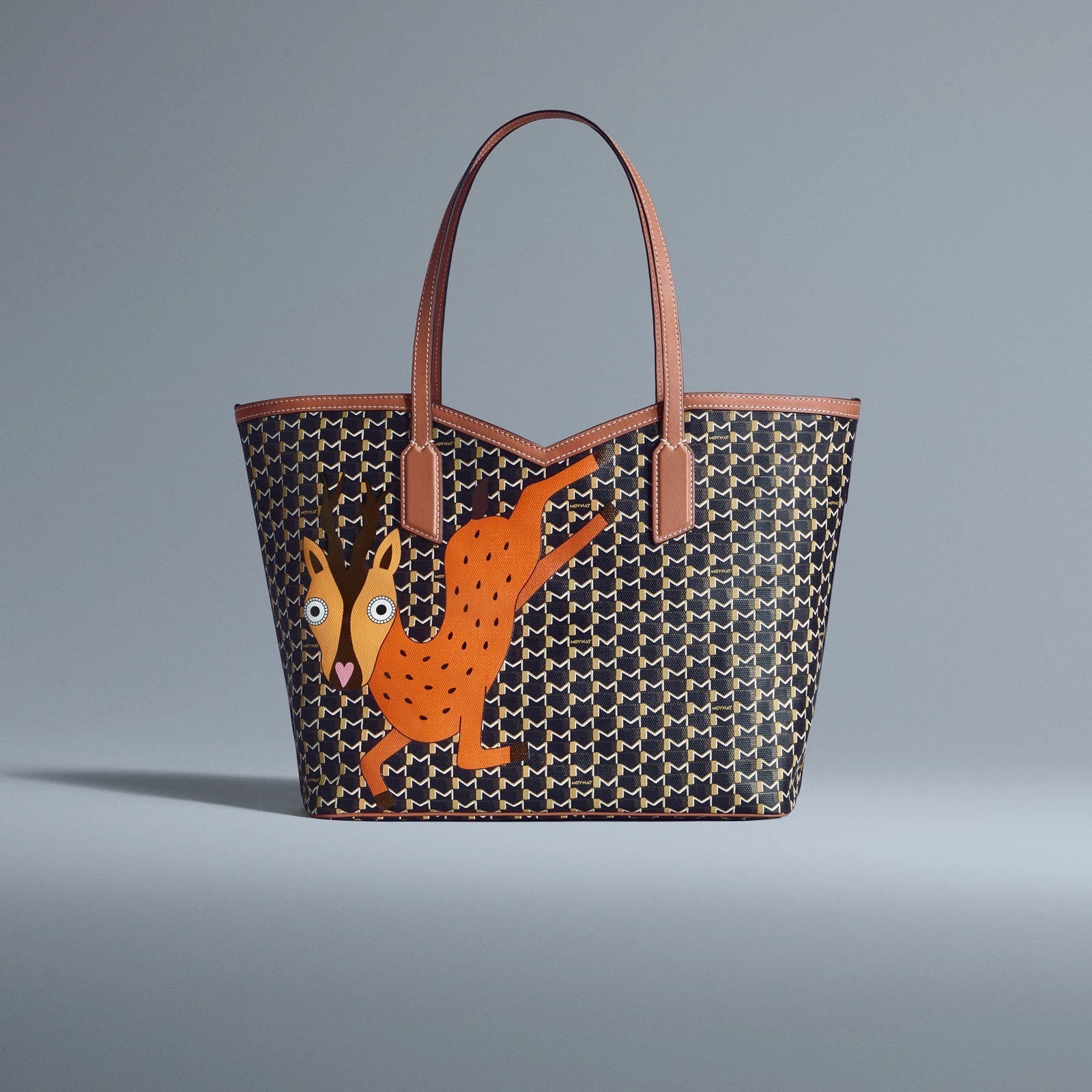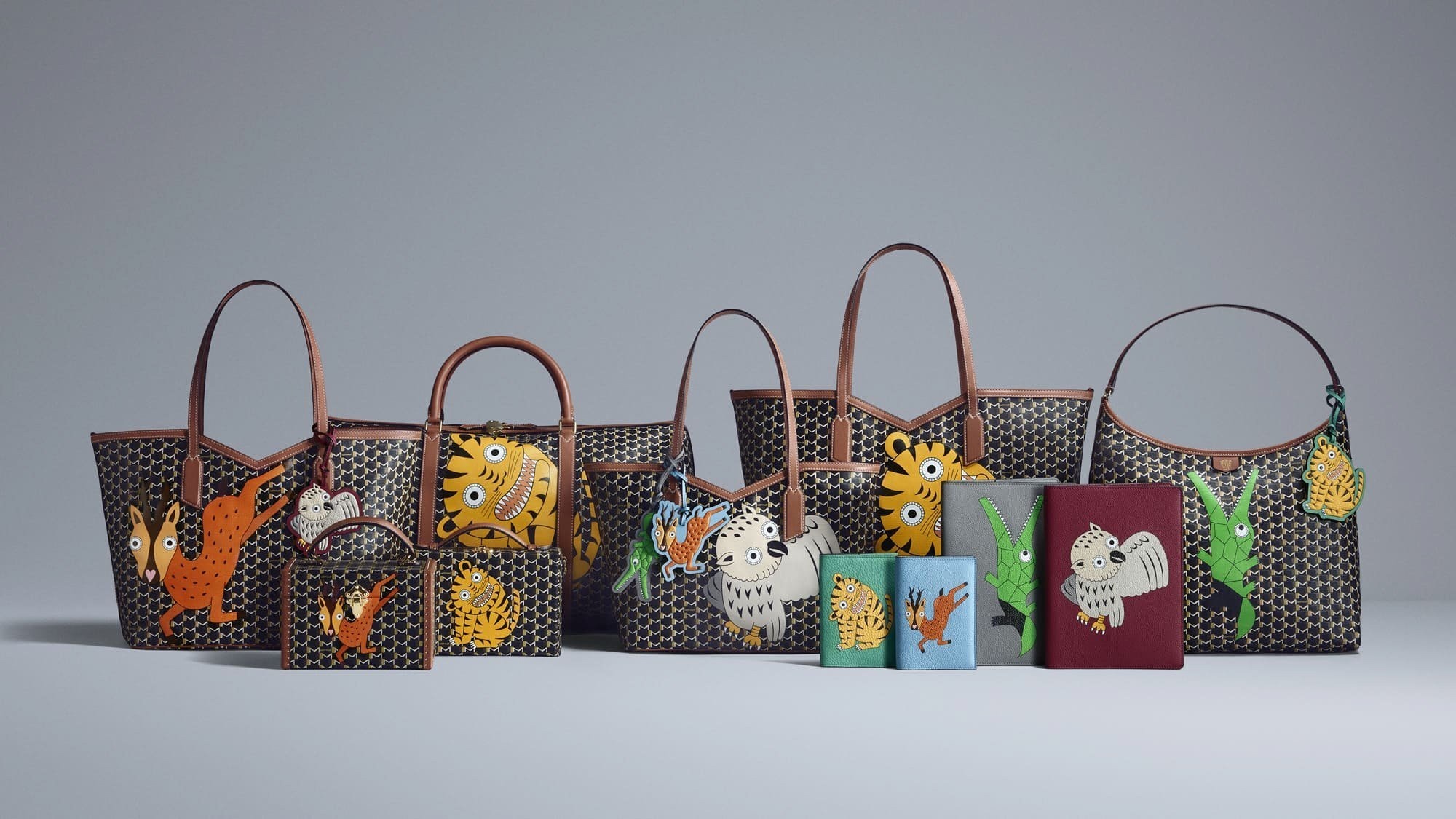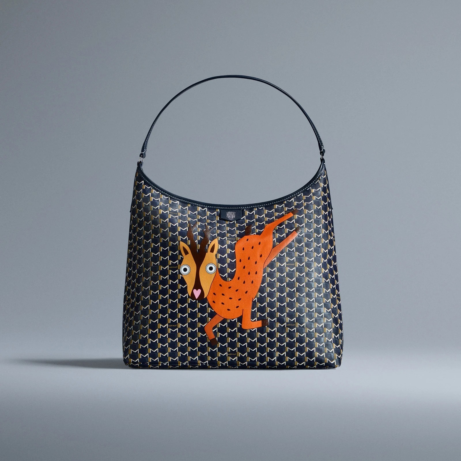 Vanity Box 化妆盒、Suitcase 手提箱、Hobo 手袋等包款以深色 M Canvas 帆布为背景,烘托老虎、小鹿、猫头鹰和鳄鱼等色彩鲜明的动物印花图案,呆萌有神的大眼睛格外生动传神,为假日季增添盎然意趣。Moynat 经典 M Monogram 由法国艺术家 Henri Rapin 于1905年设计,至此成为品牌永恒优雅的标志。