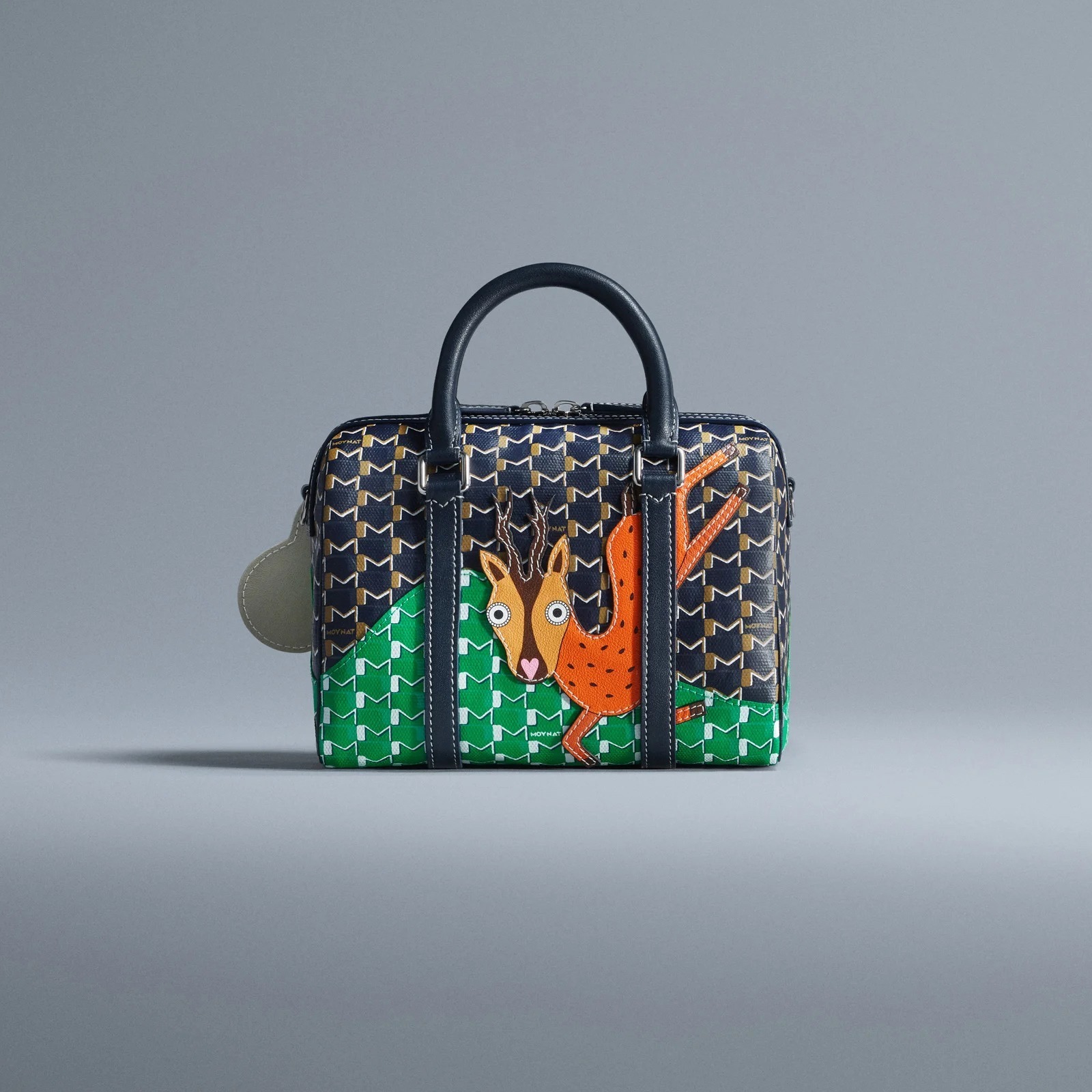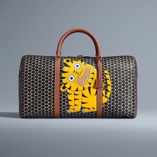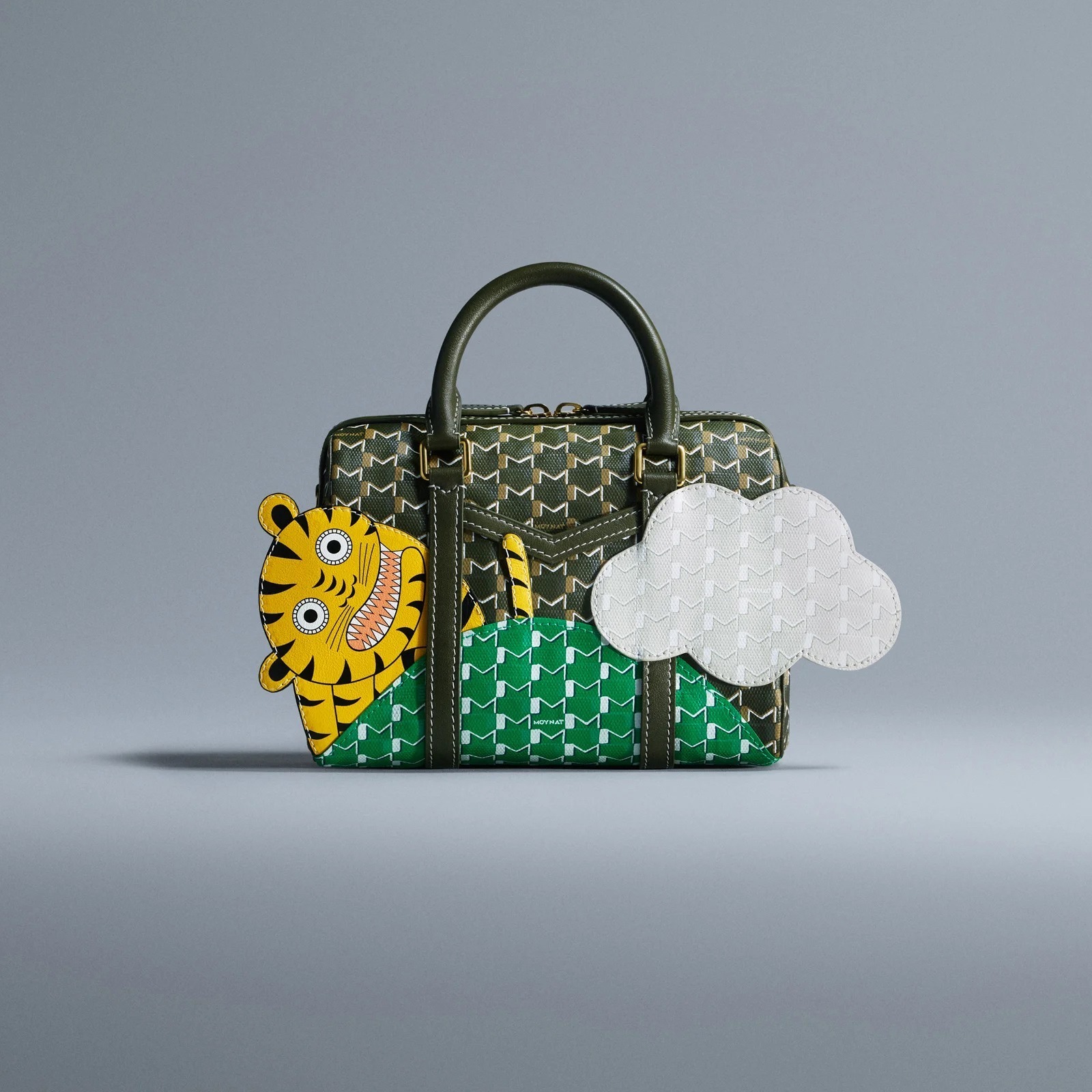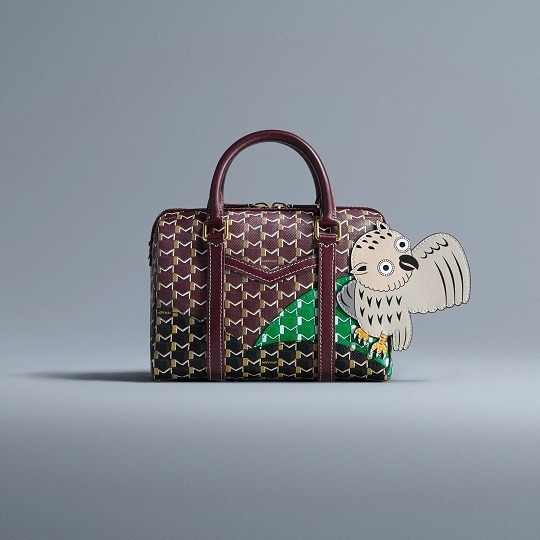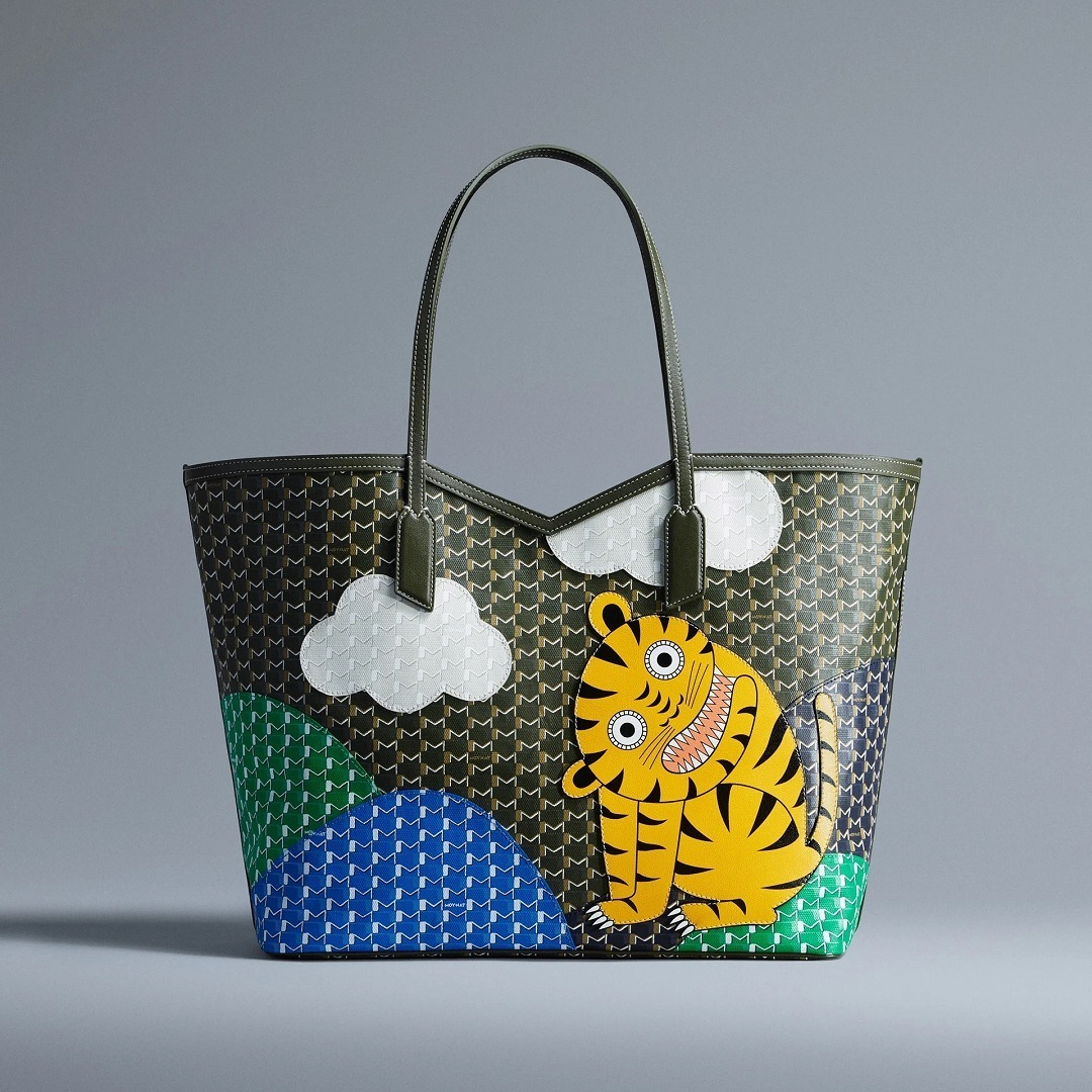 合作系列包袋以 Moynat 经典 M Canvas 老花帆布为背景,通过皮革拼缝工艺呈现永井一正创作的老虎、鹿和猫头鹰等奇趣动物形象。Mini 48h 波士顿包和 M 托特包采用棕色、绿色、海军蓝色、酒红色、白色等不同色彩的帆布拼合呈现延绵起伏的山丘和云彩背景,小动物在山野之中咆哮、奔跑、展翅,呈现充满生命力的场景。