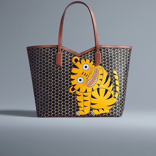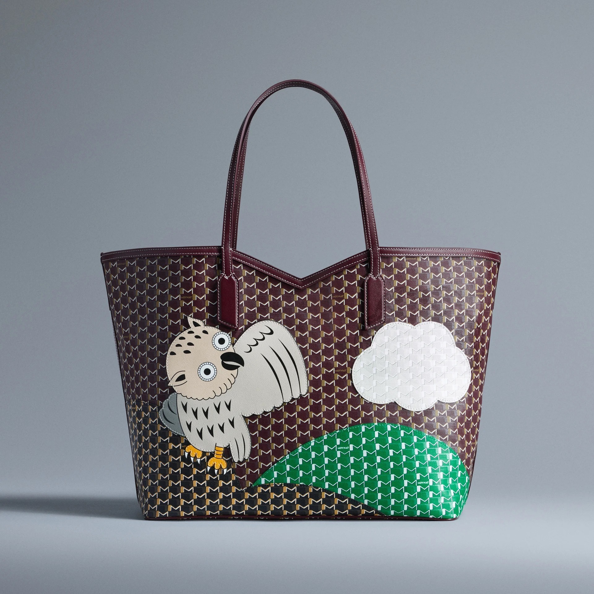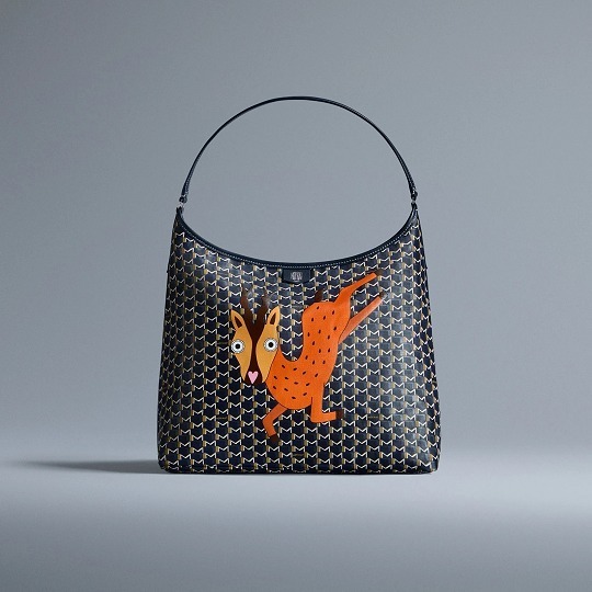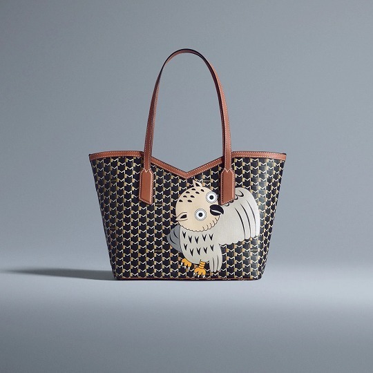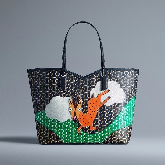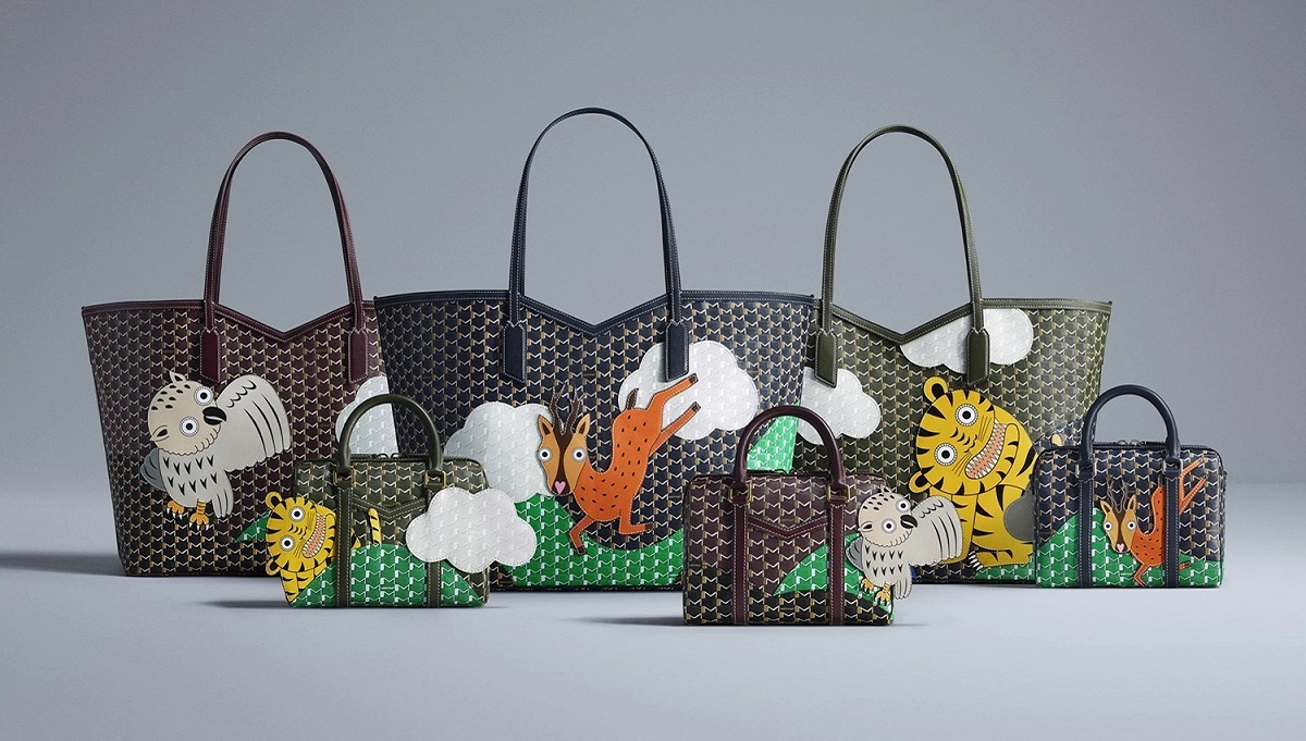 合作系列包袋以 Moynat 经典 M Canvas 老花帆布为背景,通过皮革拼缝工艺呈现永井一正创作的老虎、鹿和猫头鹰等奇趣动物形象。Mini 48h 波士顿包和 M 托特包采用棕色、绿色、海军蓝色、酒红色、白色等不同色彩的帆布拼合呈现延绵起伏的山丘和云彩背景,小动物在山野之中咆哮、奔跑、展翅,呈现充满生命力的场景。