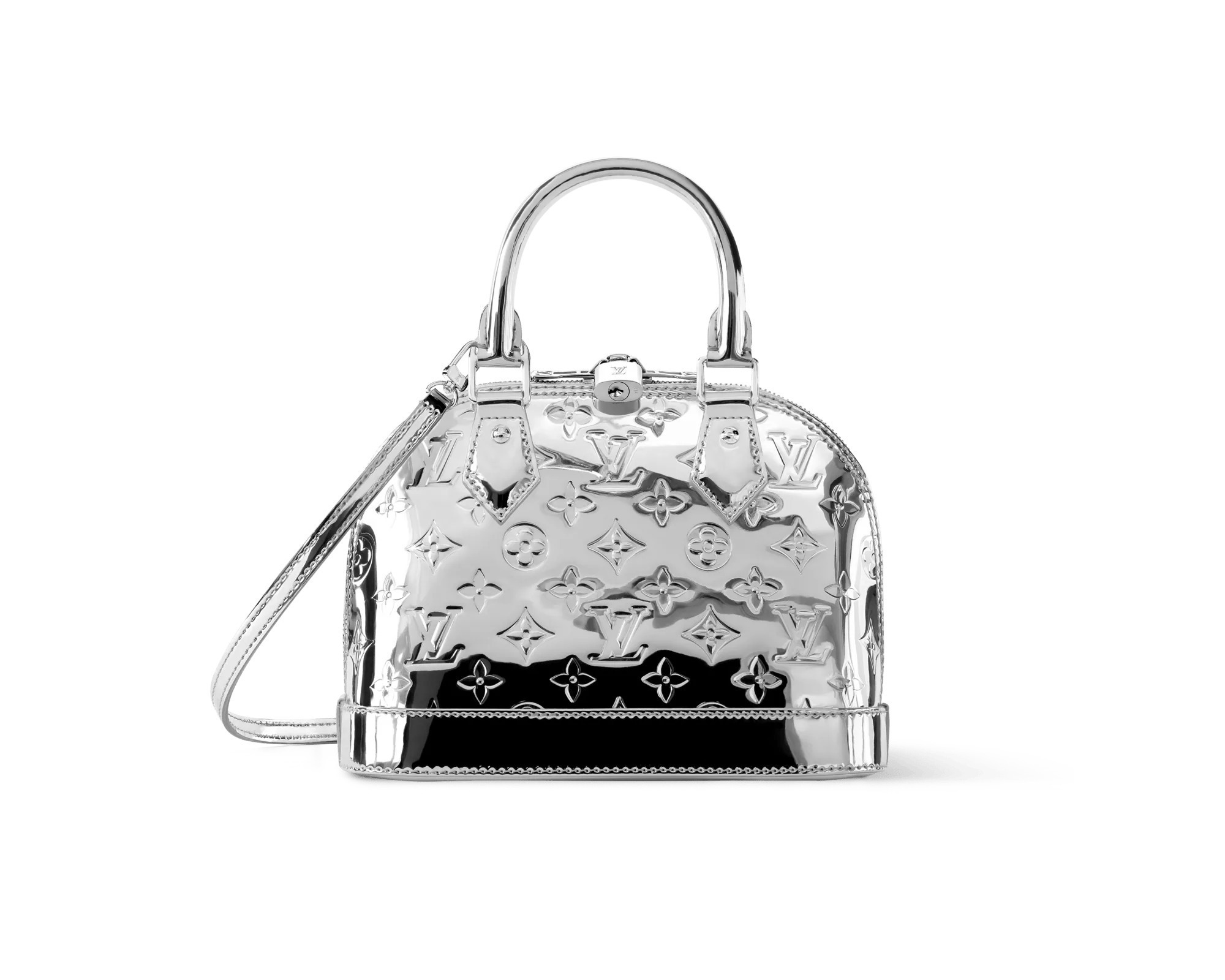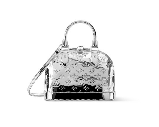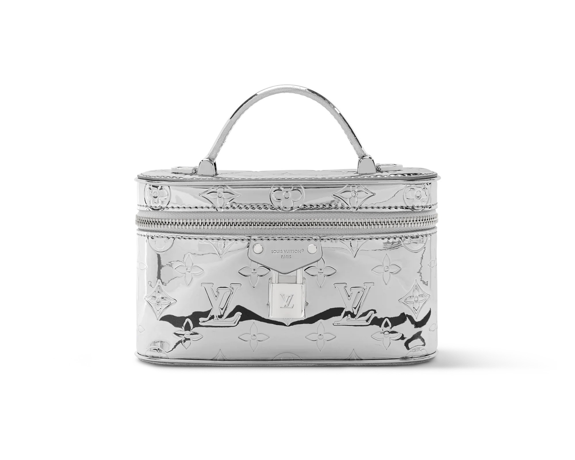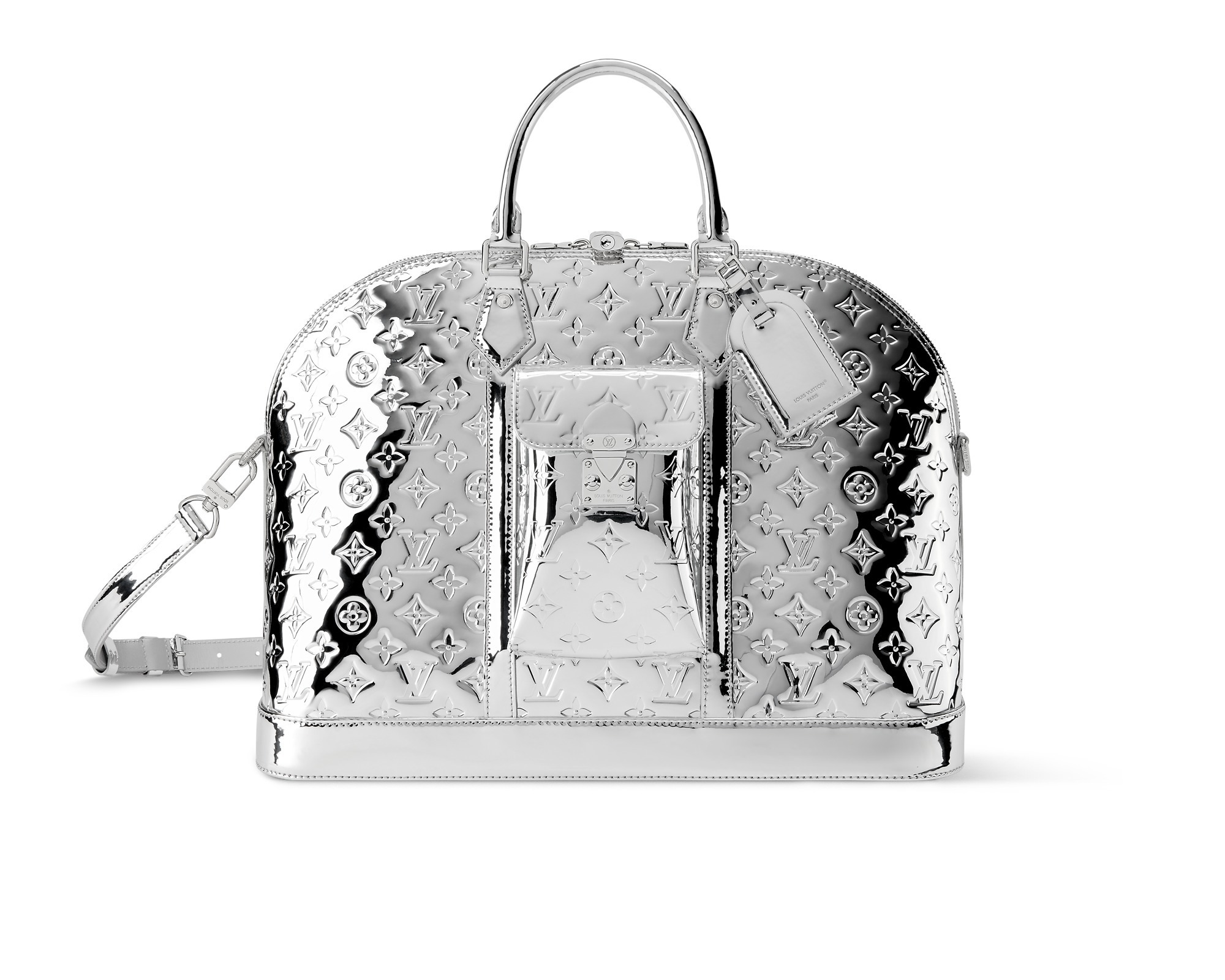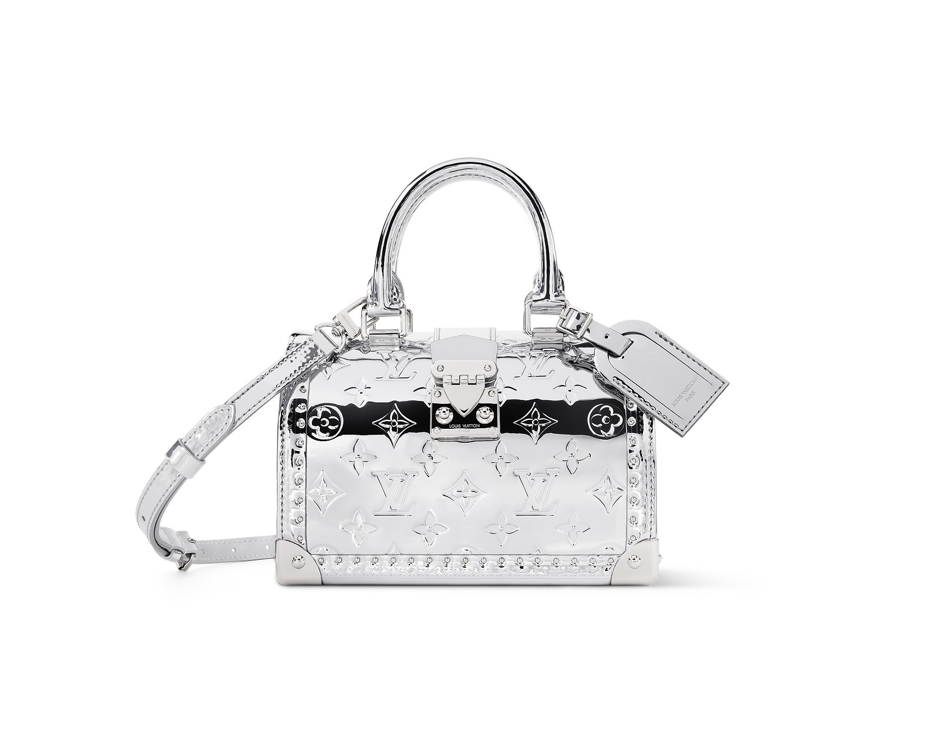 Monogram Miroir 系列包袋作品以银装素裹的冰川为设计灵感,在 Monogram 压纹帆布表面渲染镜面银色或铜色涂层,演绎 Petite Malle、Speedy、Alma、OnTheGo、Vanity 等热门款包袋作品,耀目金属色调让人联想到太空时代,尽显复古未来主义美学。