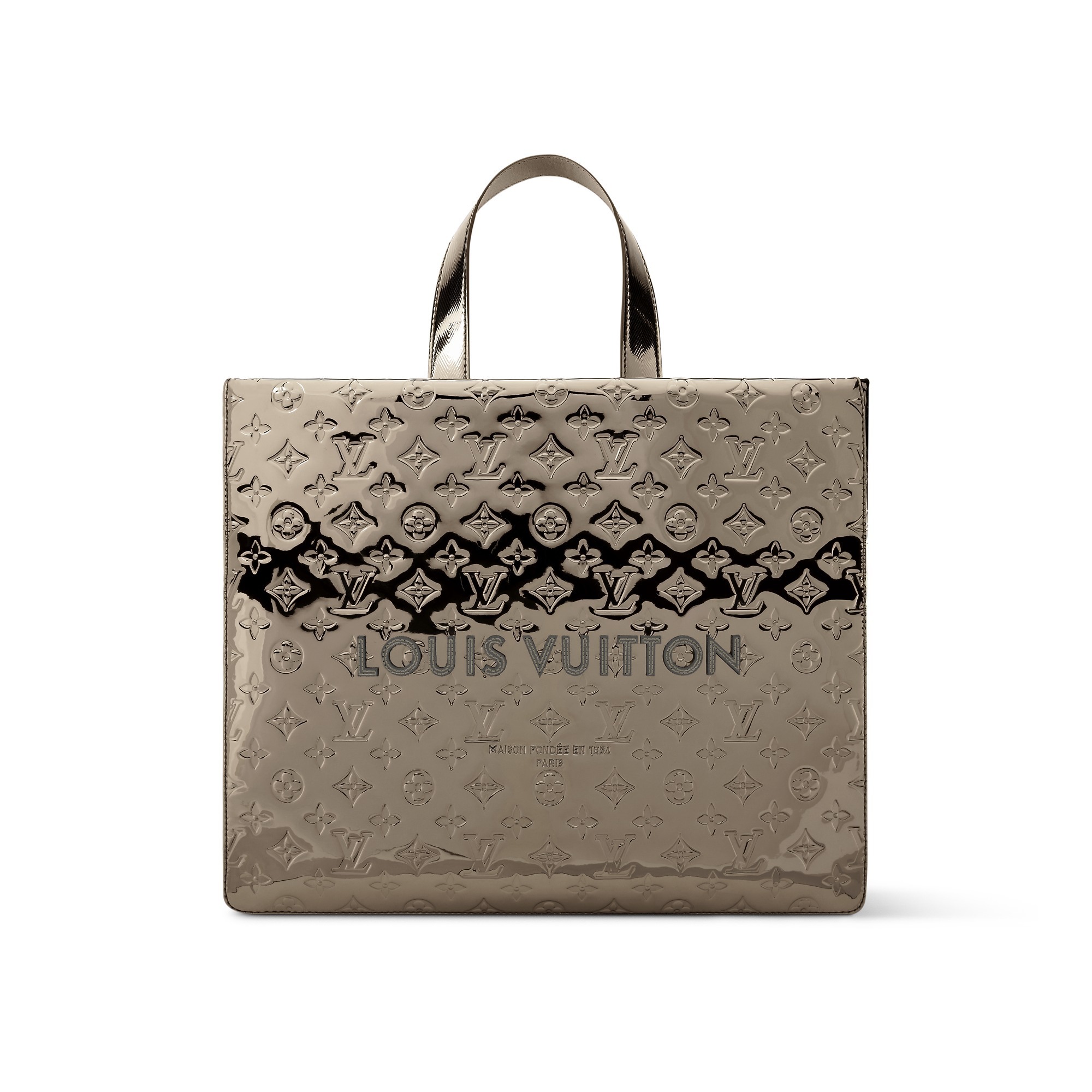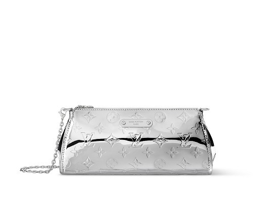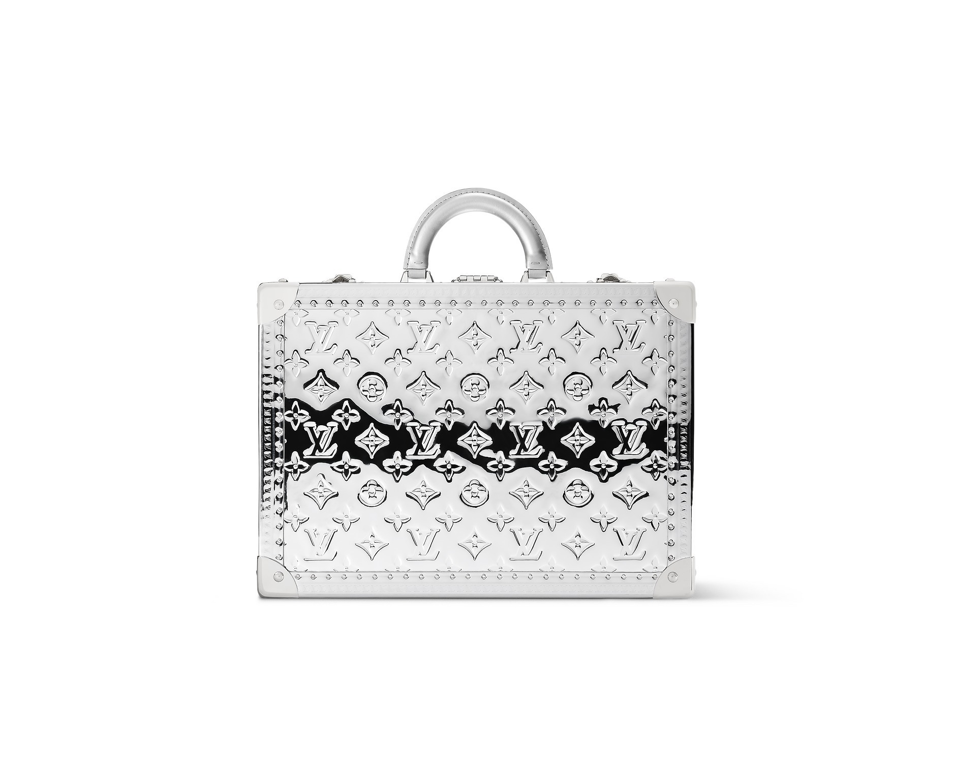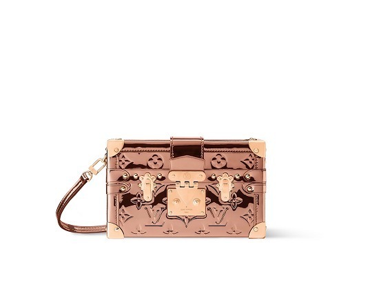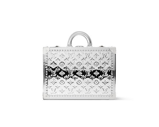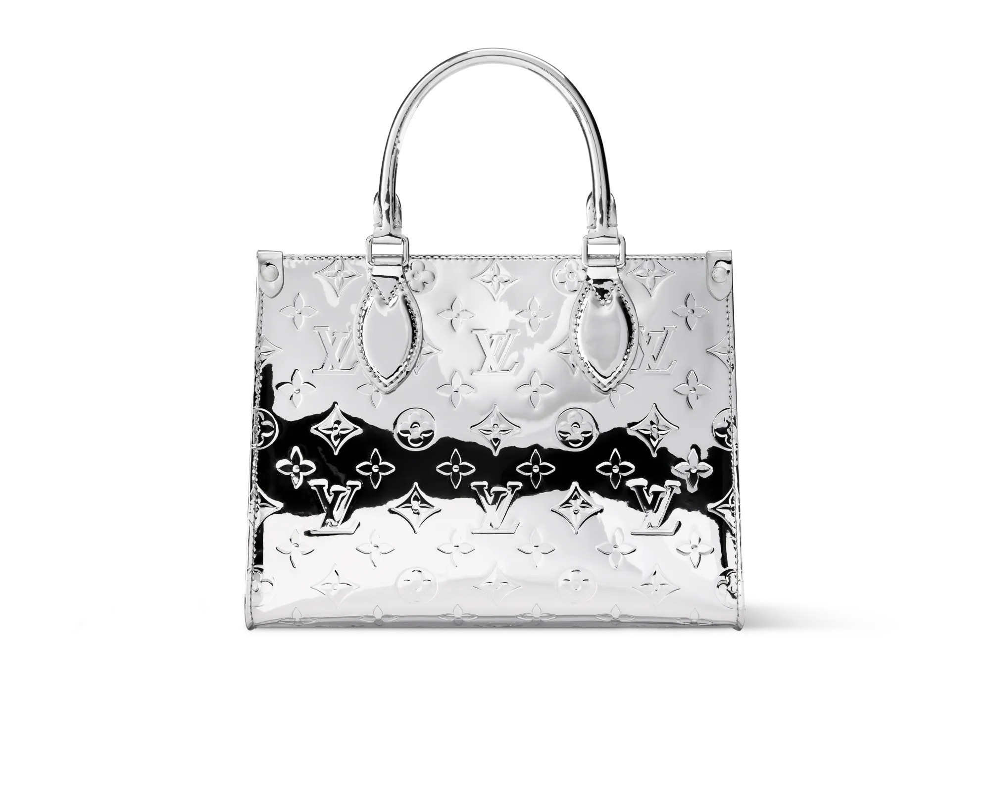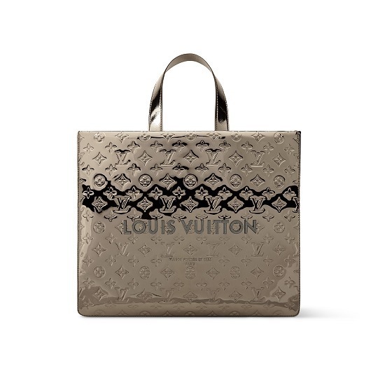 Monogram Miroir 系列包袋作品以银装素裹的冰川为设计灵感,在 Monogram 压纹帆布表面渲染镜面银色或铜色涂层,演绎 Petite Malle、Speedy、Alma、OnTheGo、Vanity 等热门款包袋作品,耀目金属色调让人联想到太空时代,尽显复古未来主义美学。