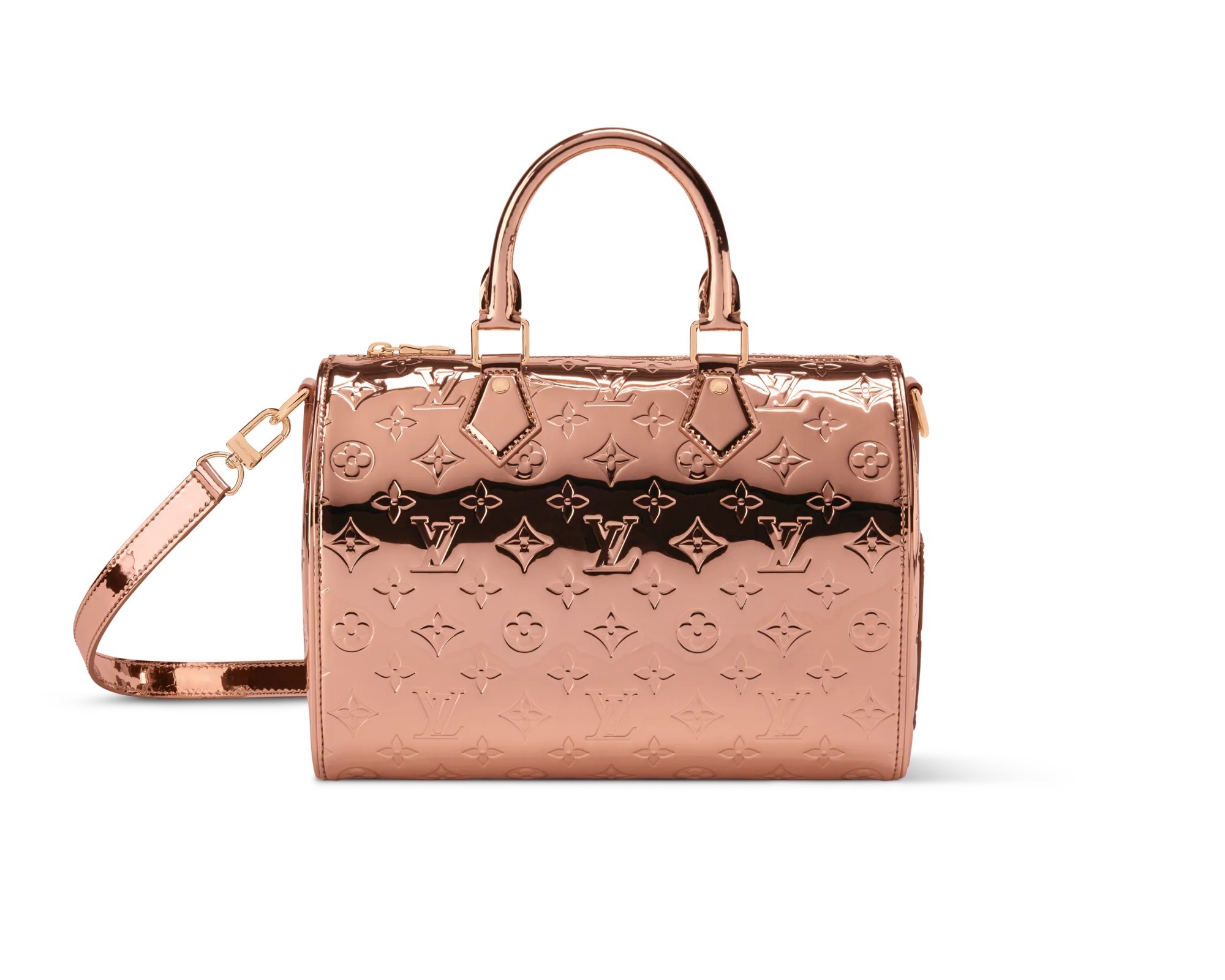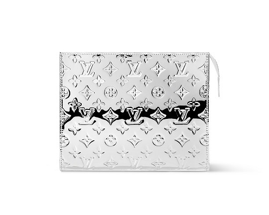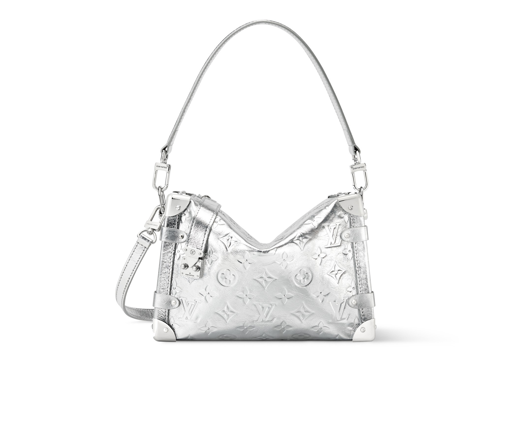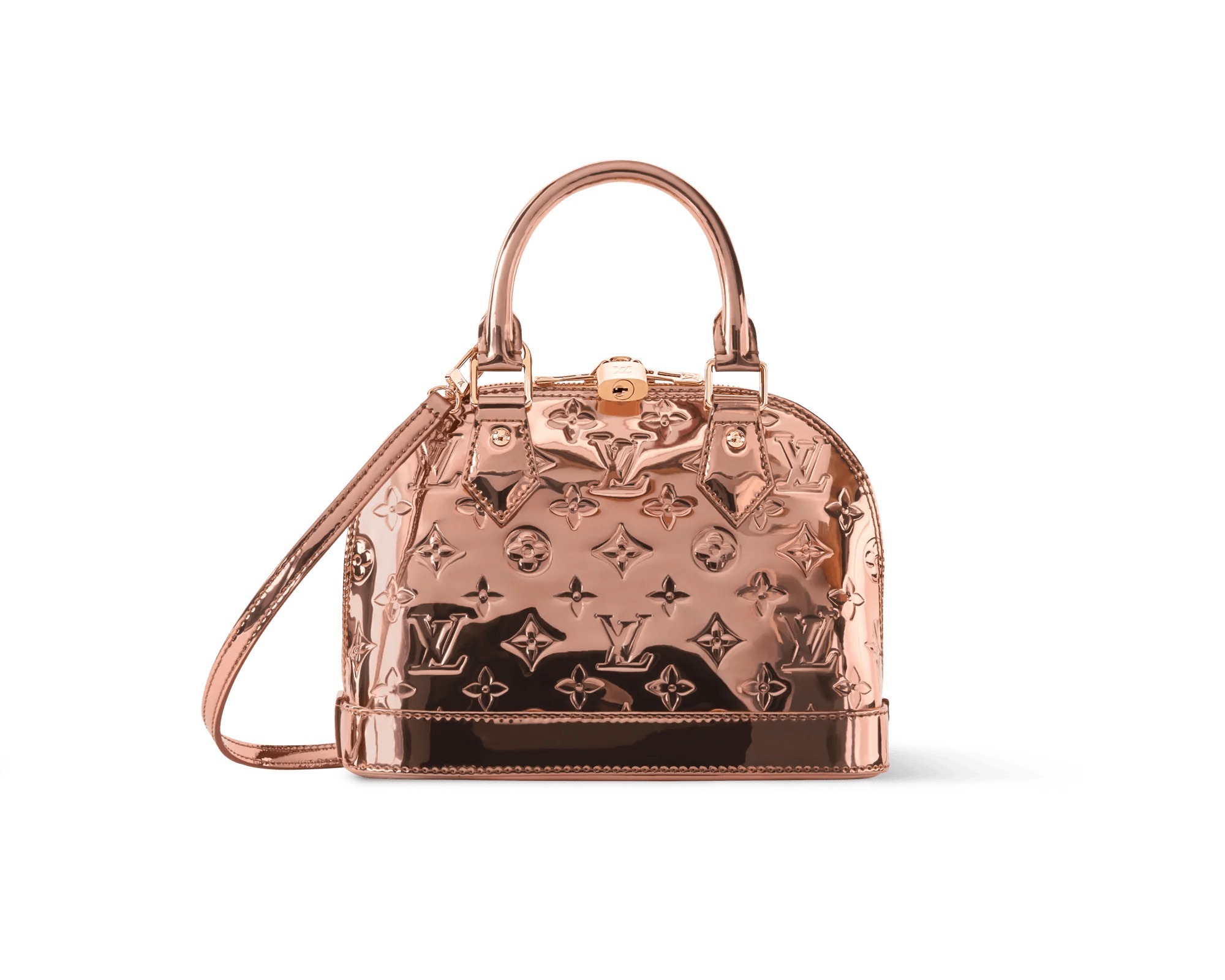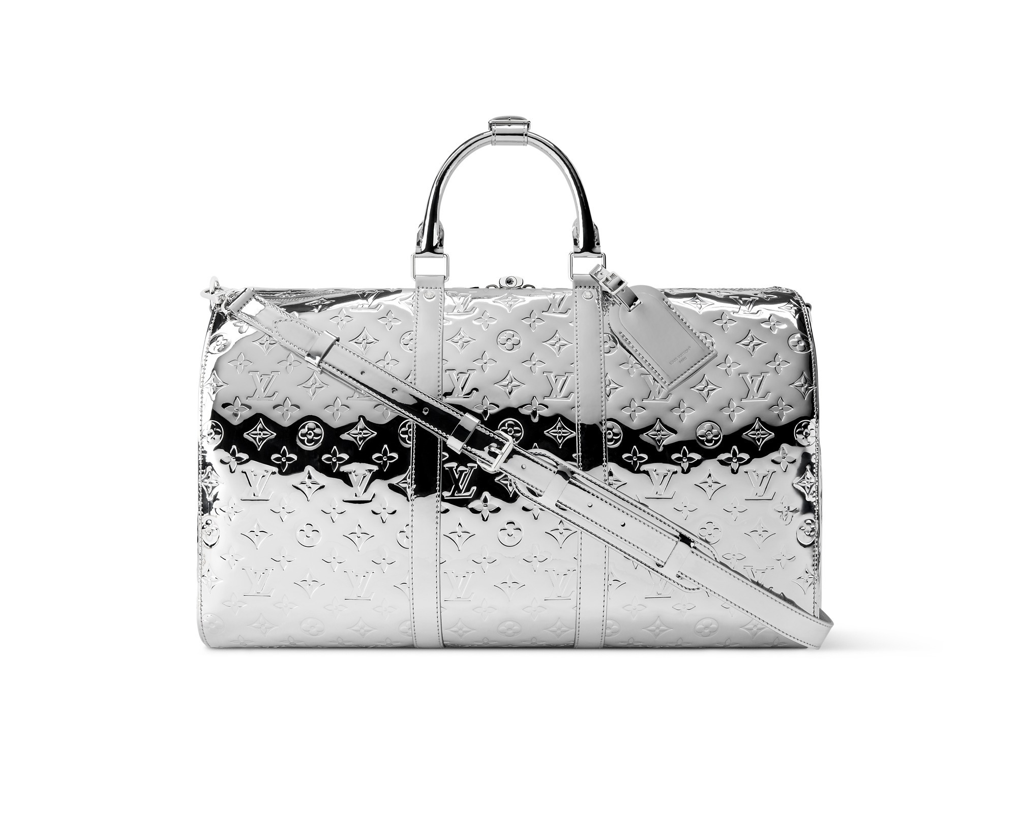 Monogram Miroir 系列包袋作品以银装素裹的冰川为设计灵感,在 Monogram 压纹帆布表面渲染镜面银色或铜色涂层,演绎 Petite Malle、Speedy、Alma、OnTheGo、Vanity 等热门款包袋作品,耀目金属色调让人联想到太空时代,尽显复古未来主义美学。