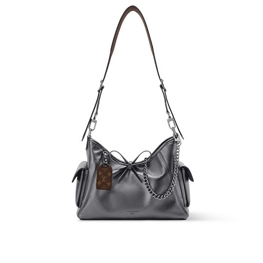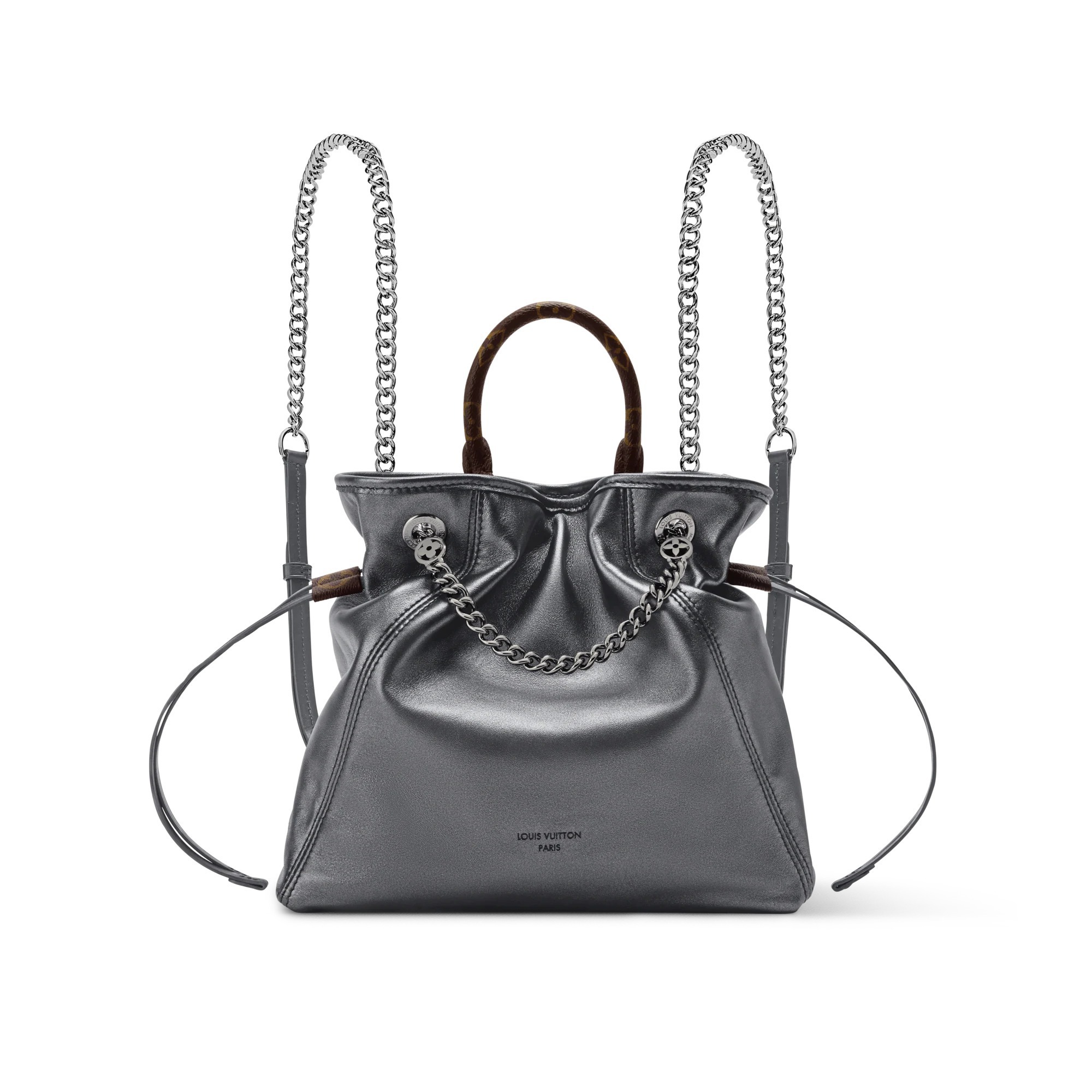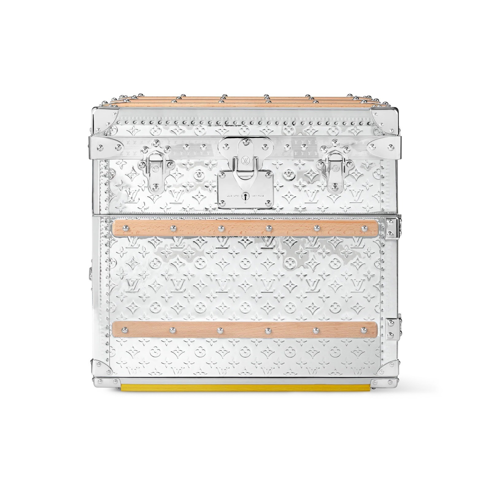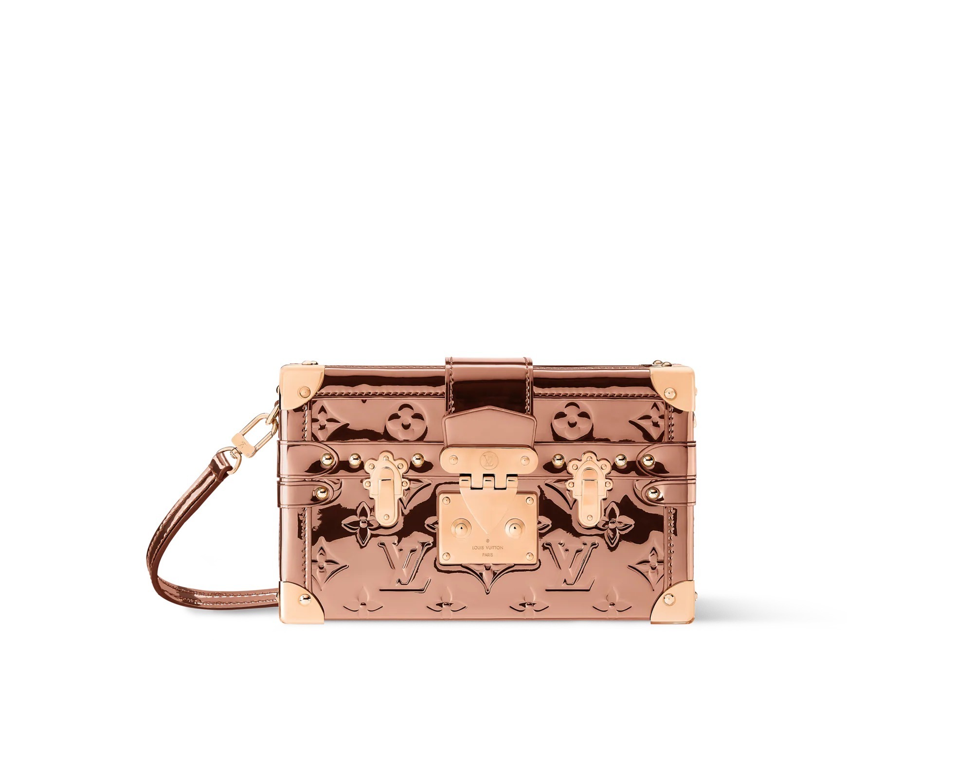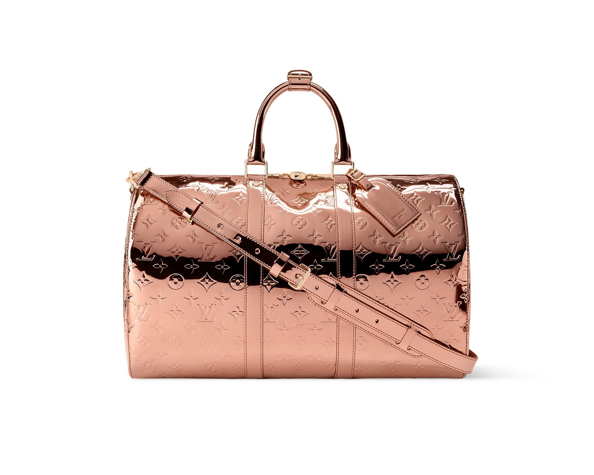 Monogram Miroir 系列包袋作品以银装素裹的冰川为设计灵感,在 Monogram 压纹帆布表面渲染镜面银色或铜色涂层,演绎 Petite Malle、Speedy、Alma、OnTheGo、Vanity 等热门款包袋作品,耀目金属色调让人联想到太空时代,尽显复古未来主义美学。