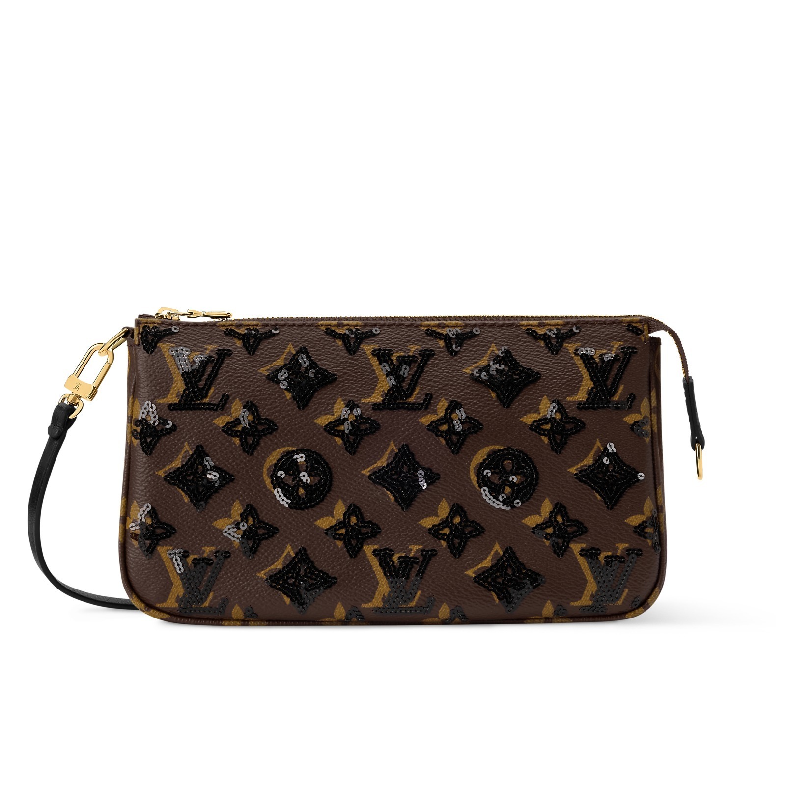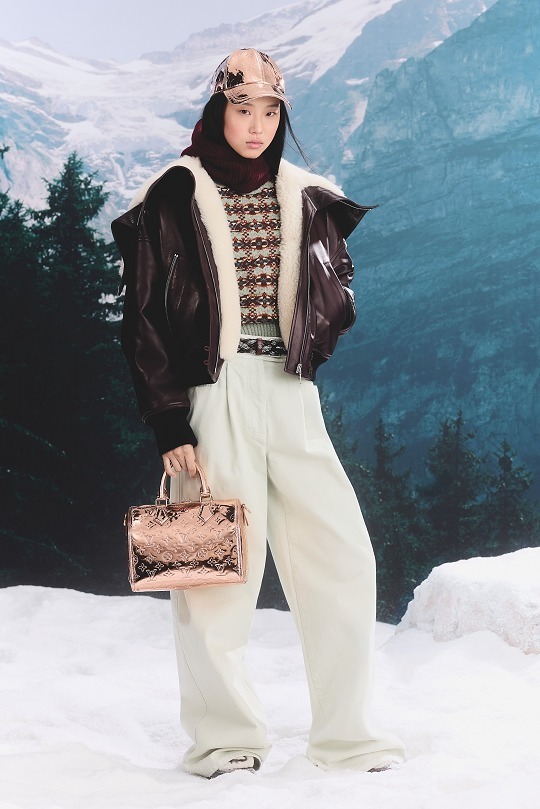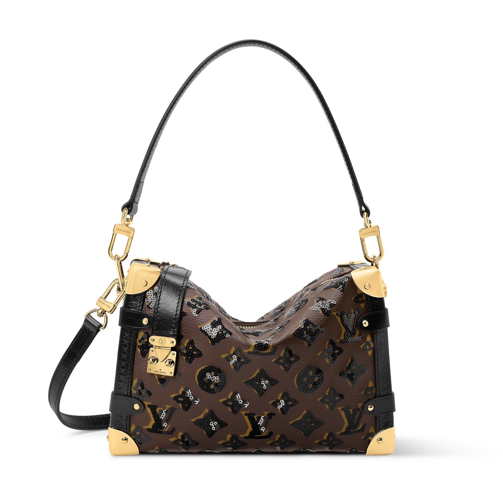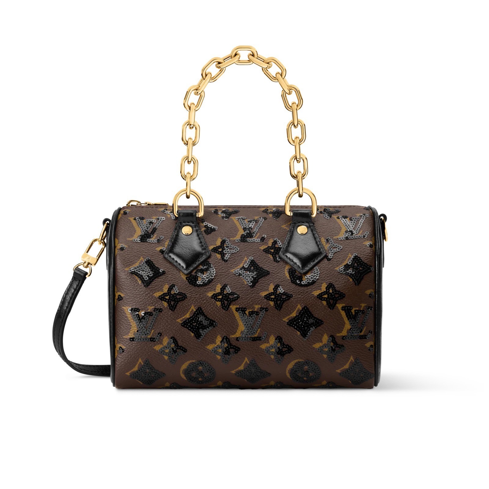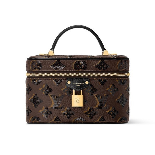 Side Trunk 中号手袋、Speedy 链条包、Vanity 化妆包等包款采用巧克力色 Monogram Sequins 帆布制作而成,通过亮片刺绣在包身呈现重叠闪烁的 Monogram 图案,象征群山之巅的灵动光影。