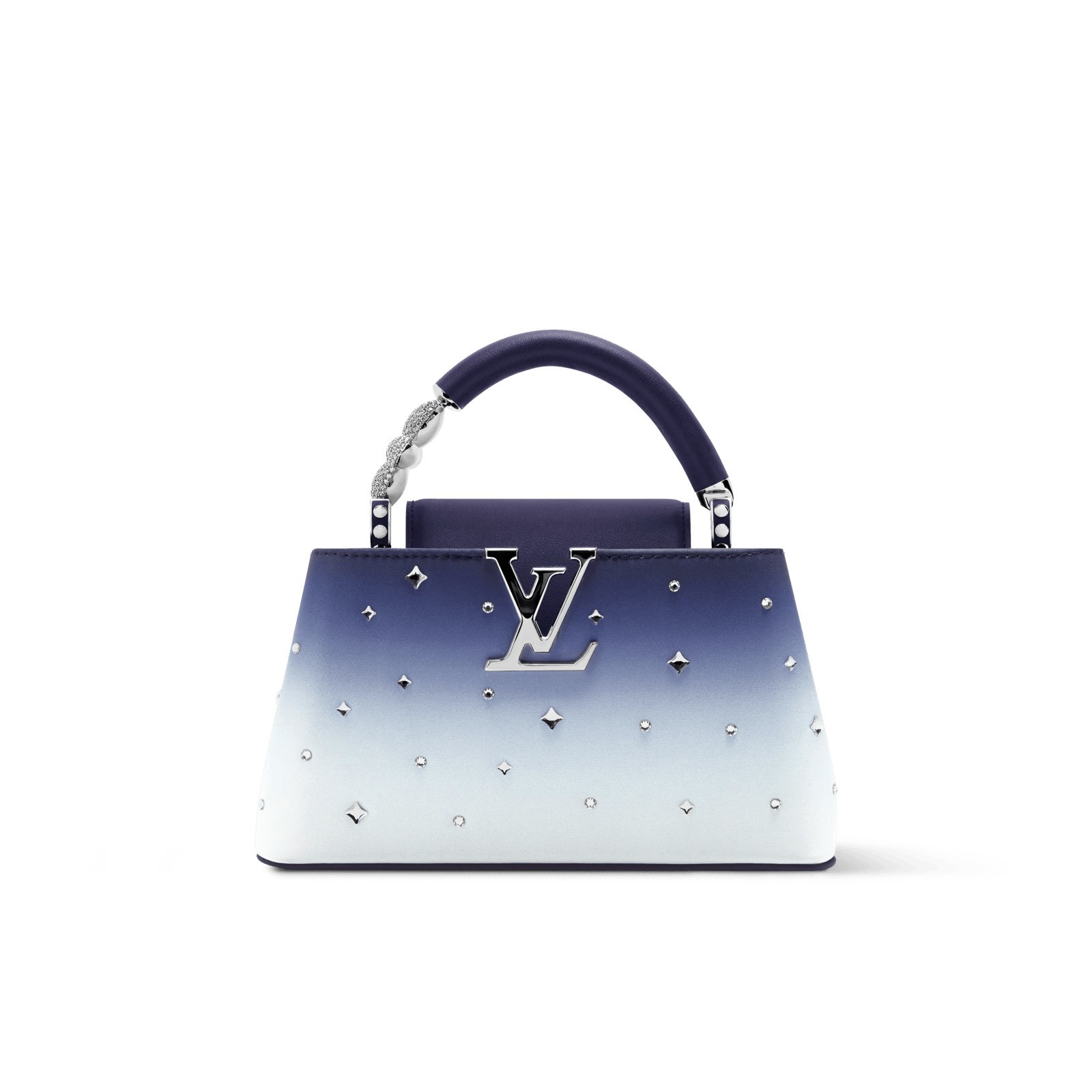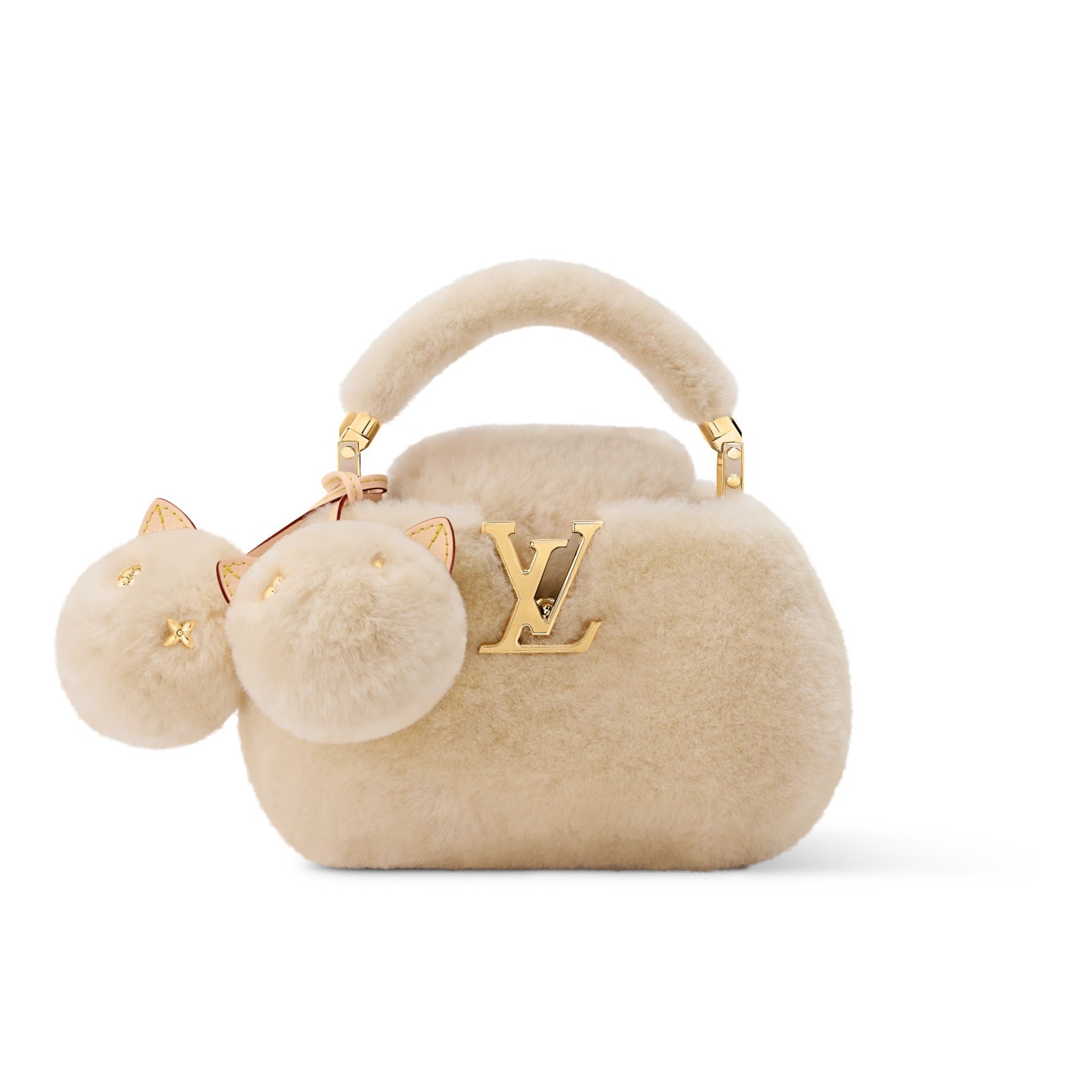 本次滑雪系列还特别推出4款 Capucines 手袋作品,圆滚滚的 Capusnow 手袋尤其令人心动,包包采用奶油色美利奴羊毛皮构筑圆润廓形,搭配毛绒绒的拱形手柄和可拆卸绒球小猫挂件,可爱又治愈。Capucines EW 迷你手袋的设计灵感来自溜冰运动员的华丽舞裙,采用渐变蓝色缎面包身为背景,点缀璀璨水晶刺绣和 Monogram 水钻花卉手柄,适合出席年末派对或聚会。