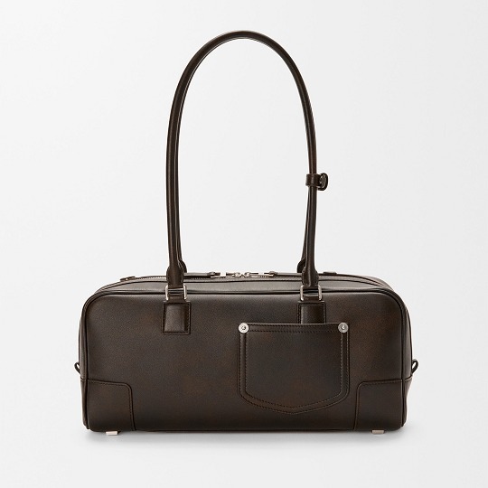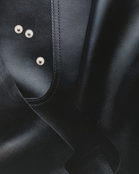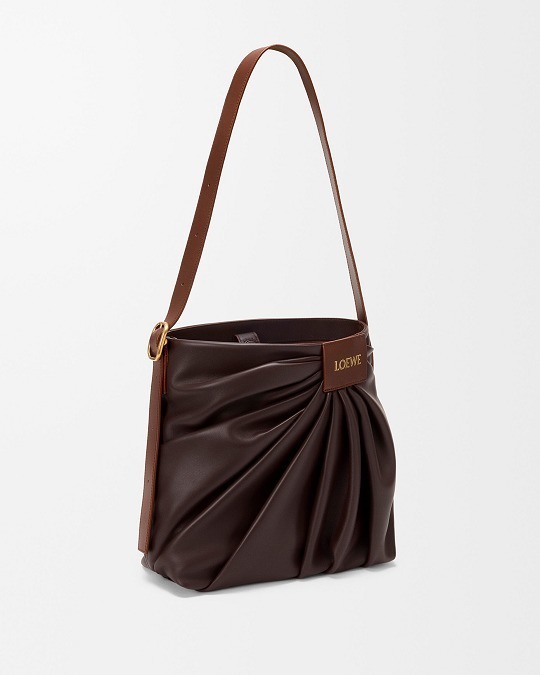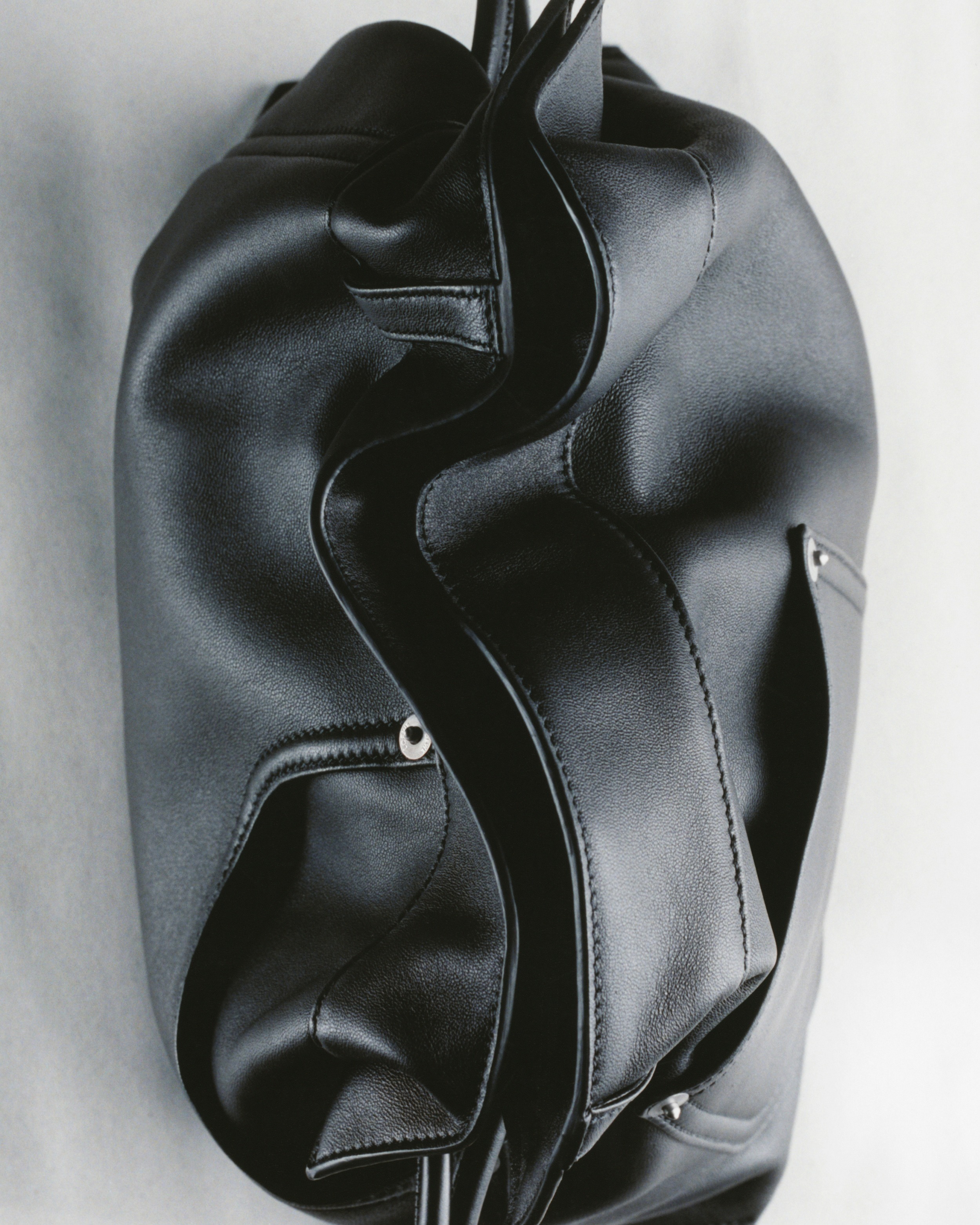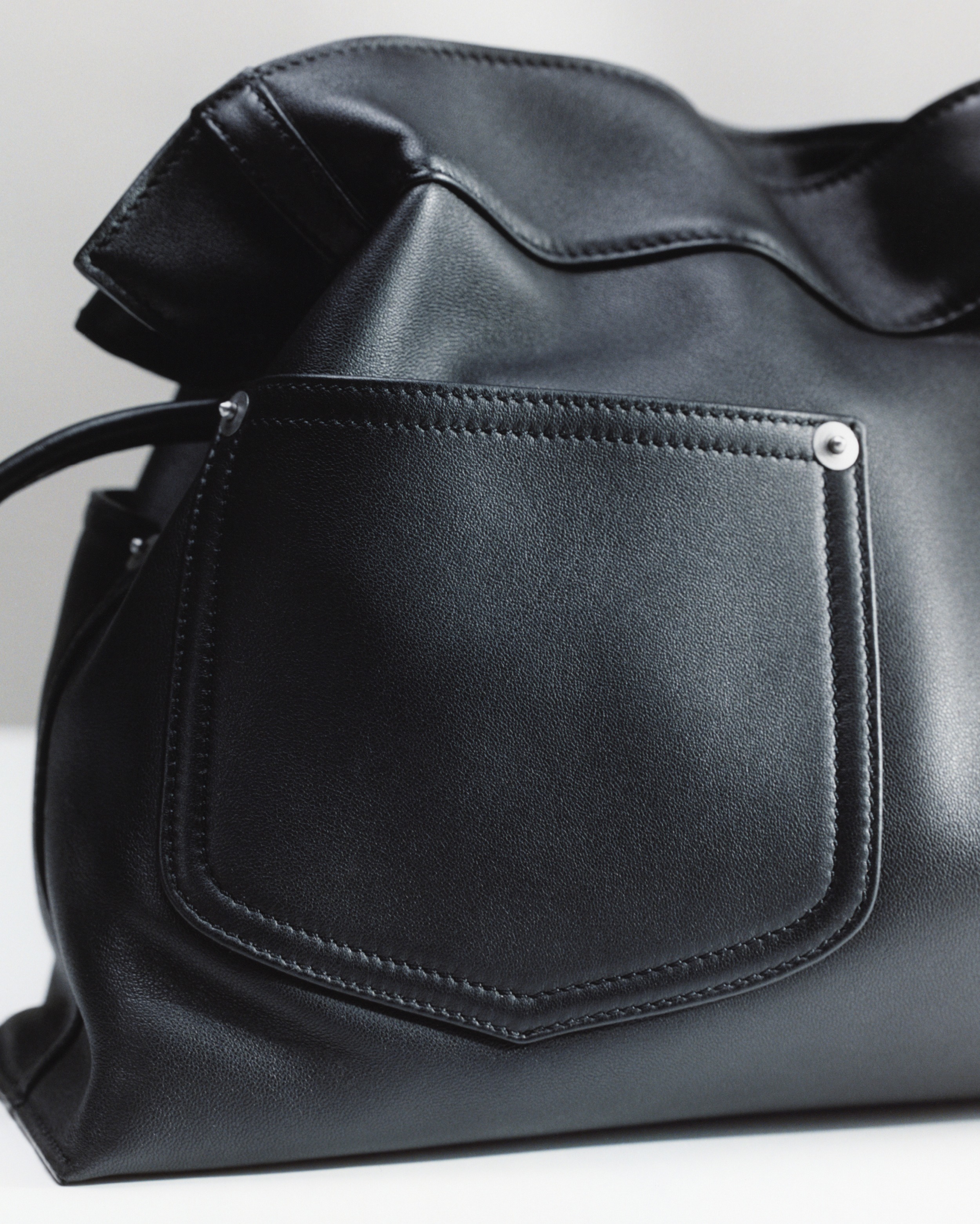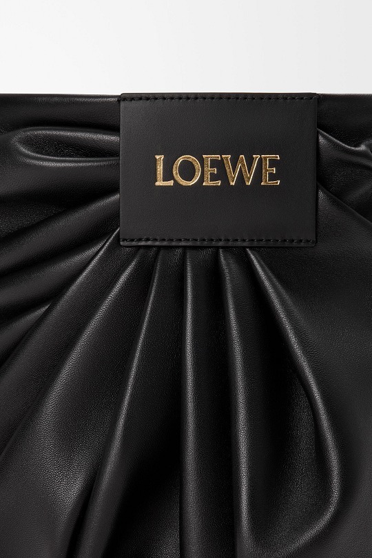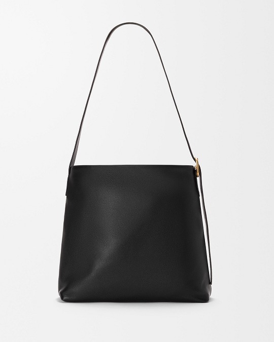 新款 Draped Tote 手袋以2025春夏系列中的裤装剪裁为灵感,设计师将优雅的褶裥和常见于牛仔裤腰头的皮标运用在包包廓形中,用柔软的皮革构筑雕塑般的结构。包包采用顶部磁扣开合,肩带可通过侧面金属扣调节长短,推出黑色和复古棕色2种颜色选择。