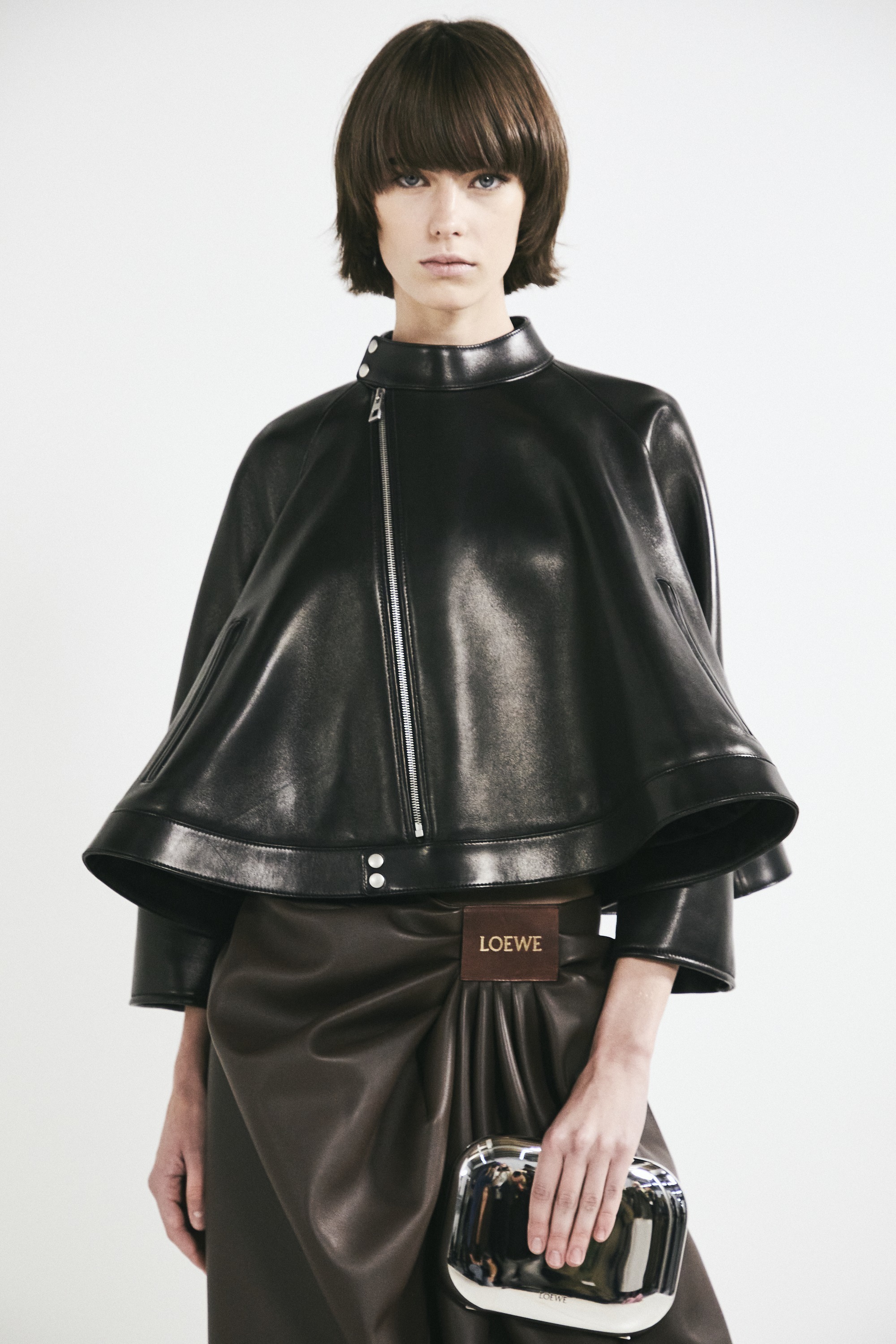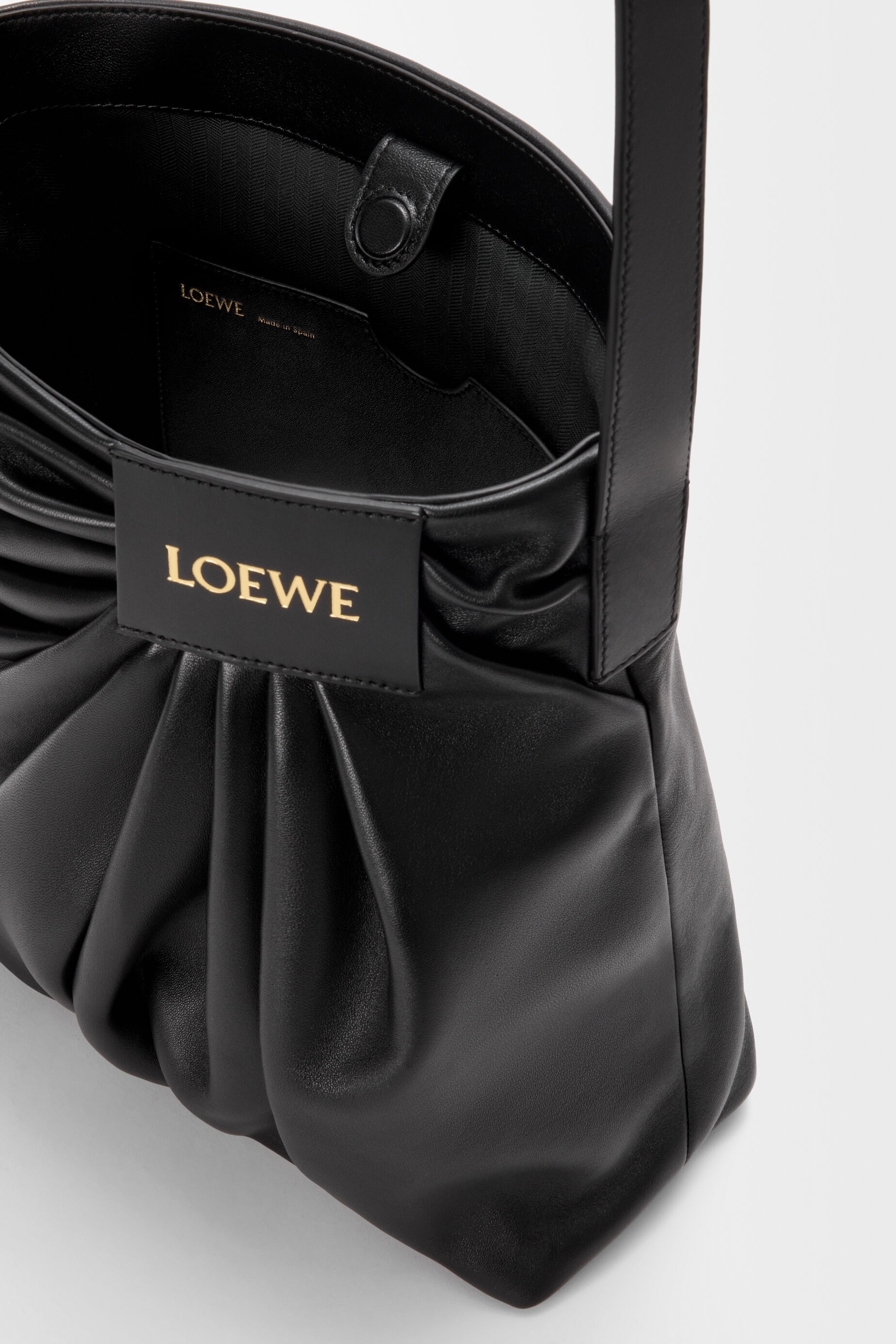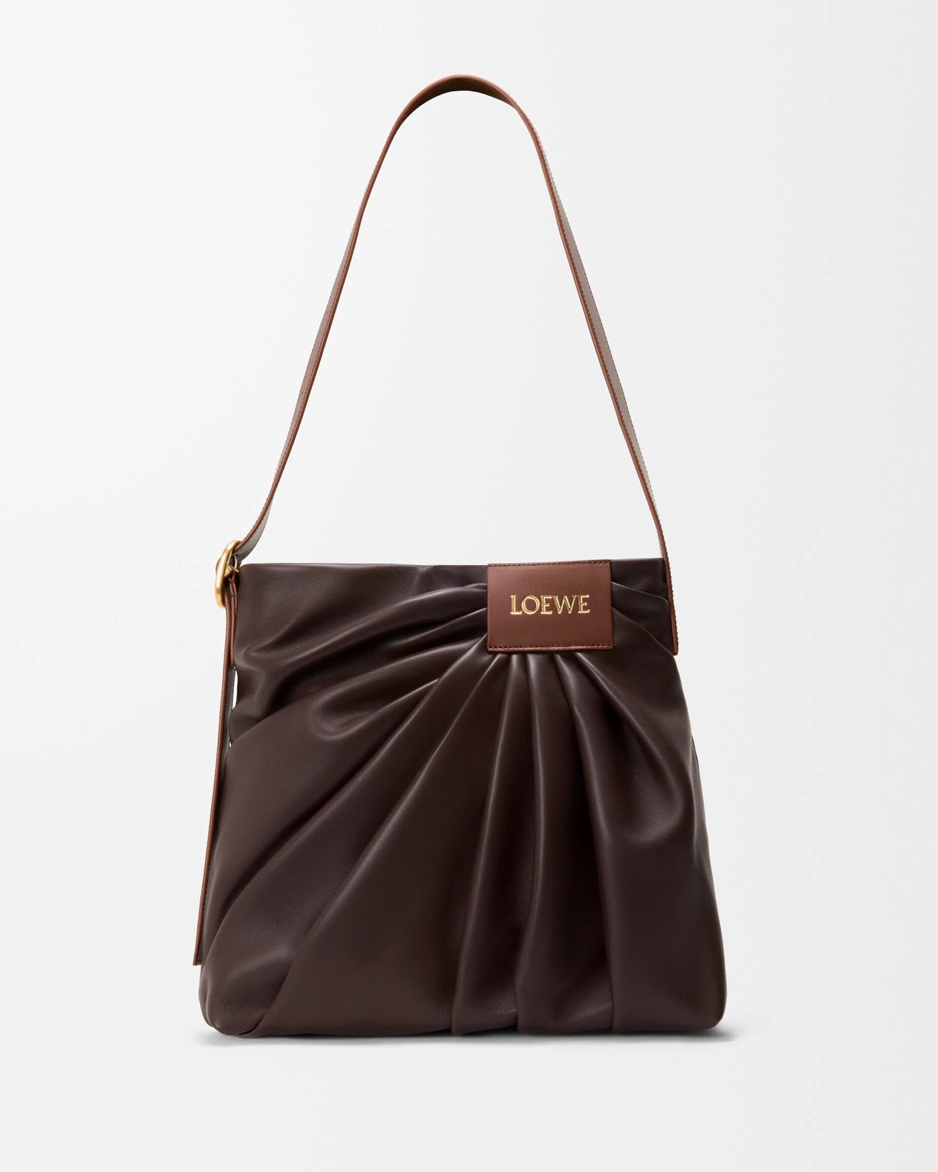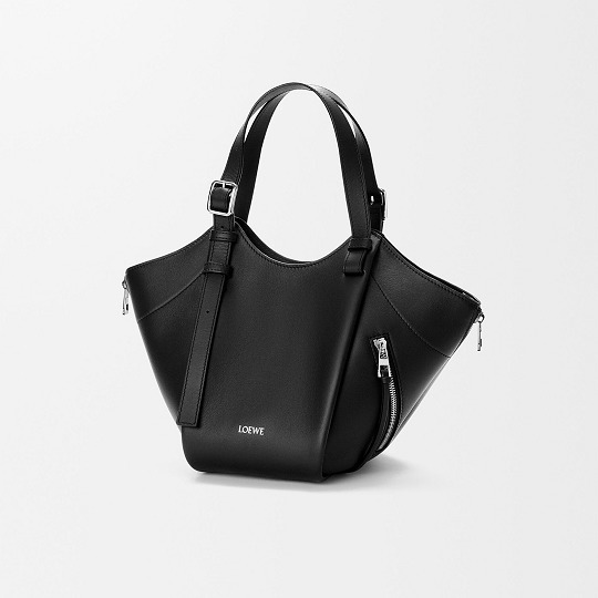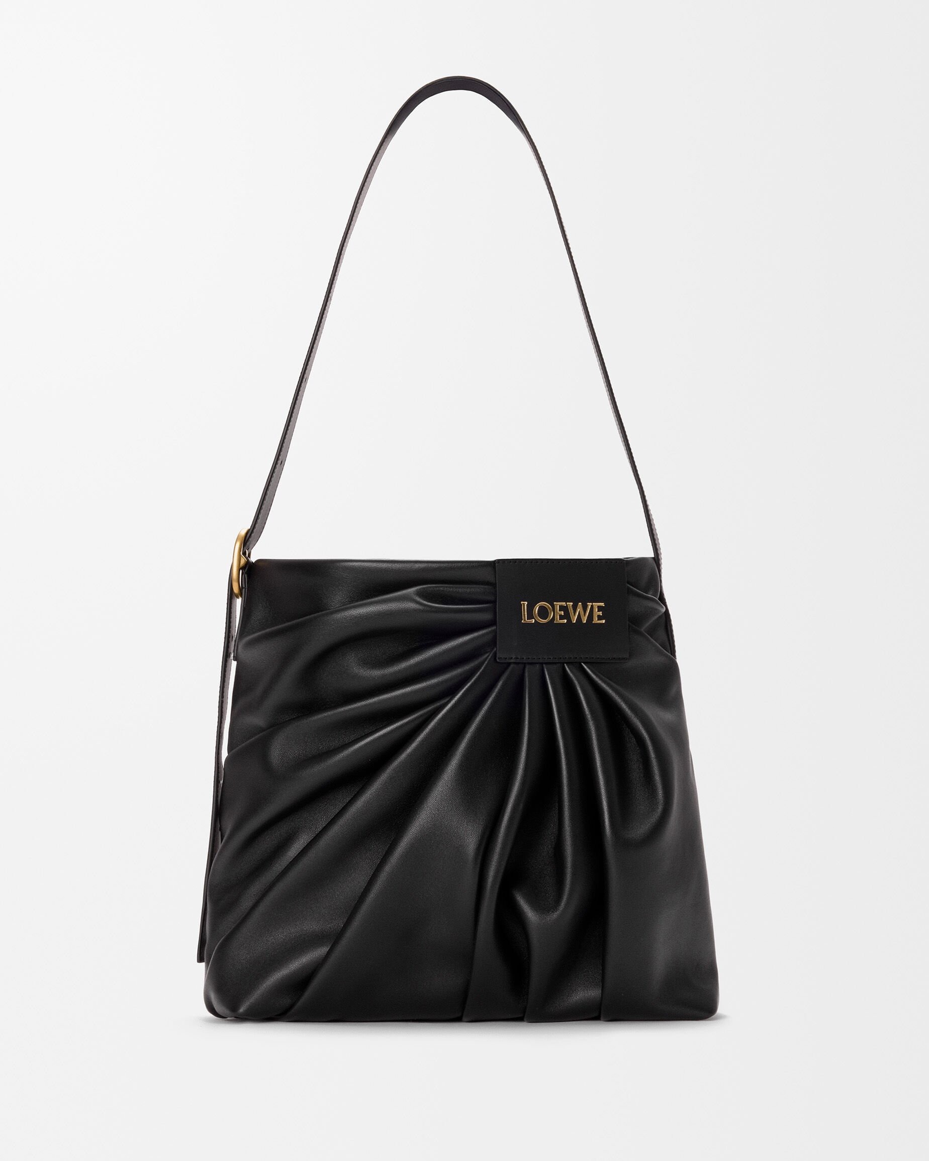 新款 Draped Tote 手袋以2025春夏系列中的裤装剪裁为灵感,设计师将优雅的褶裥和常见于牛仔裤腰头的皮标运用在包包廓形中,用柔软的皮革构筑雕塑般的结构。包包采用顶部磁扣开合,肩带可通过侧面金属扣调节长短,推出黑色和复古棕色2种颜色选择。