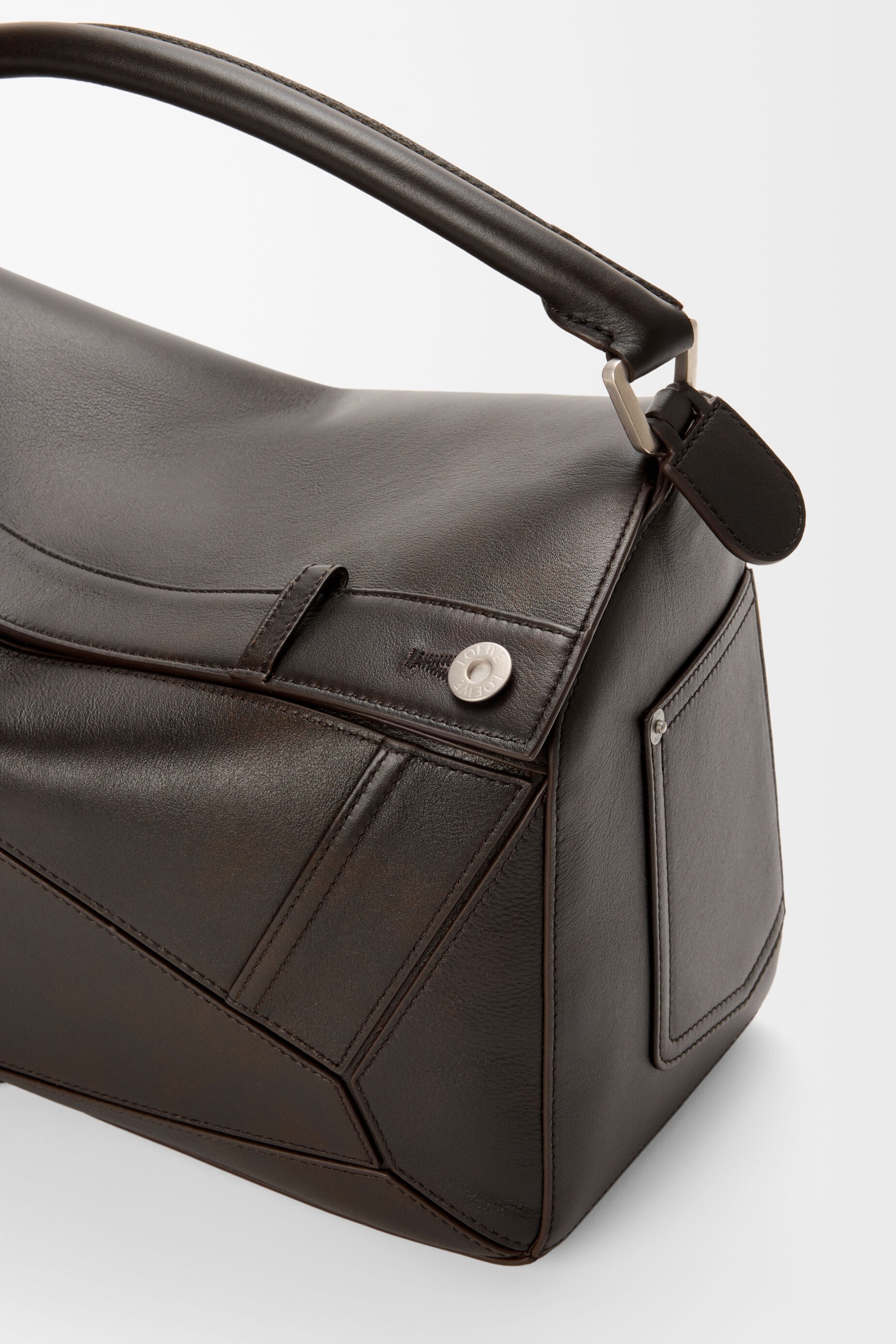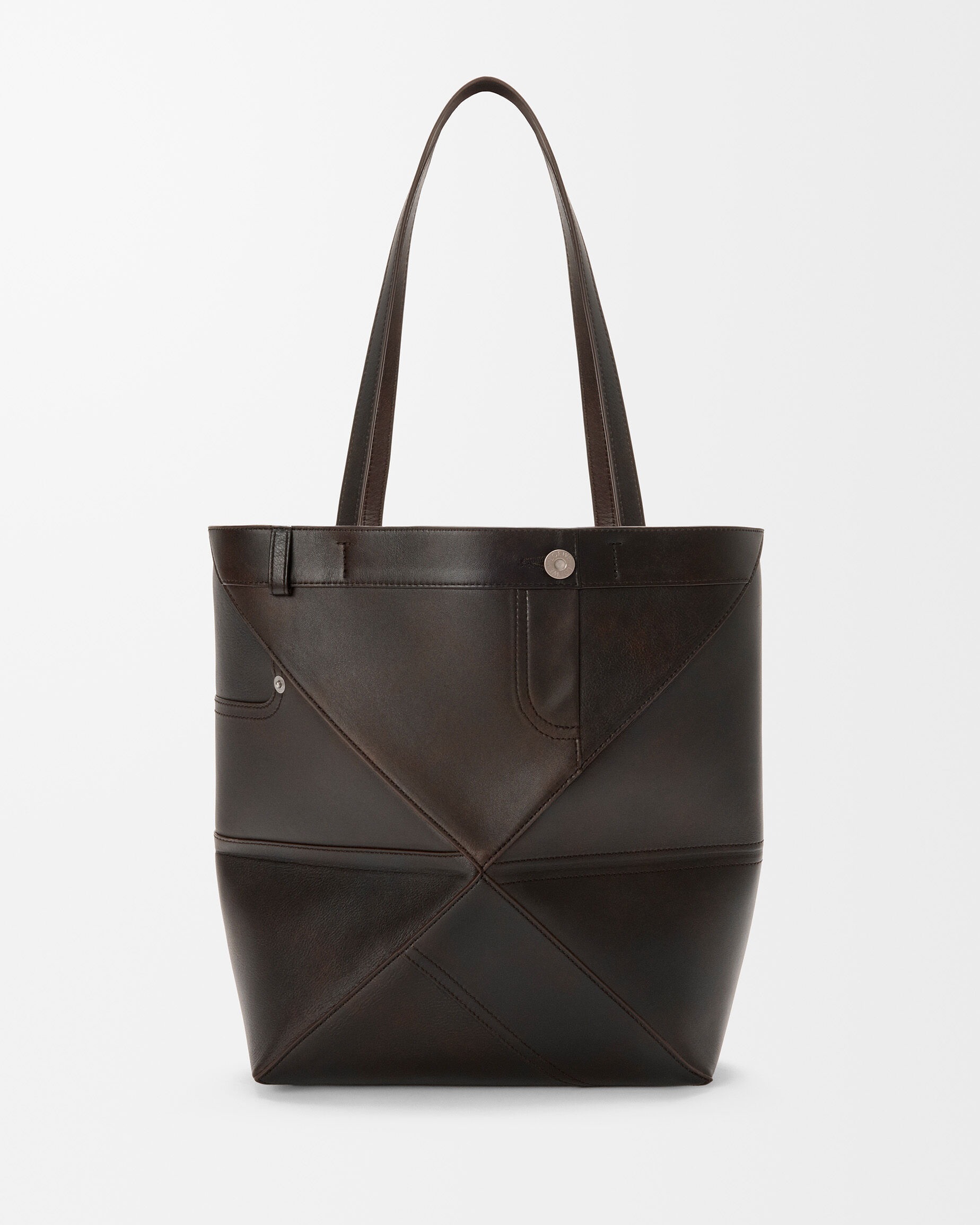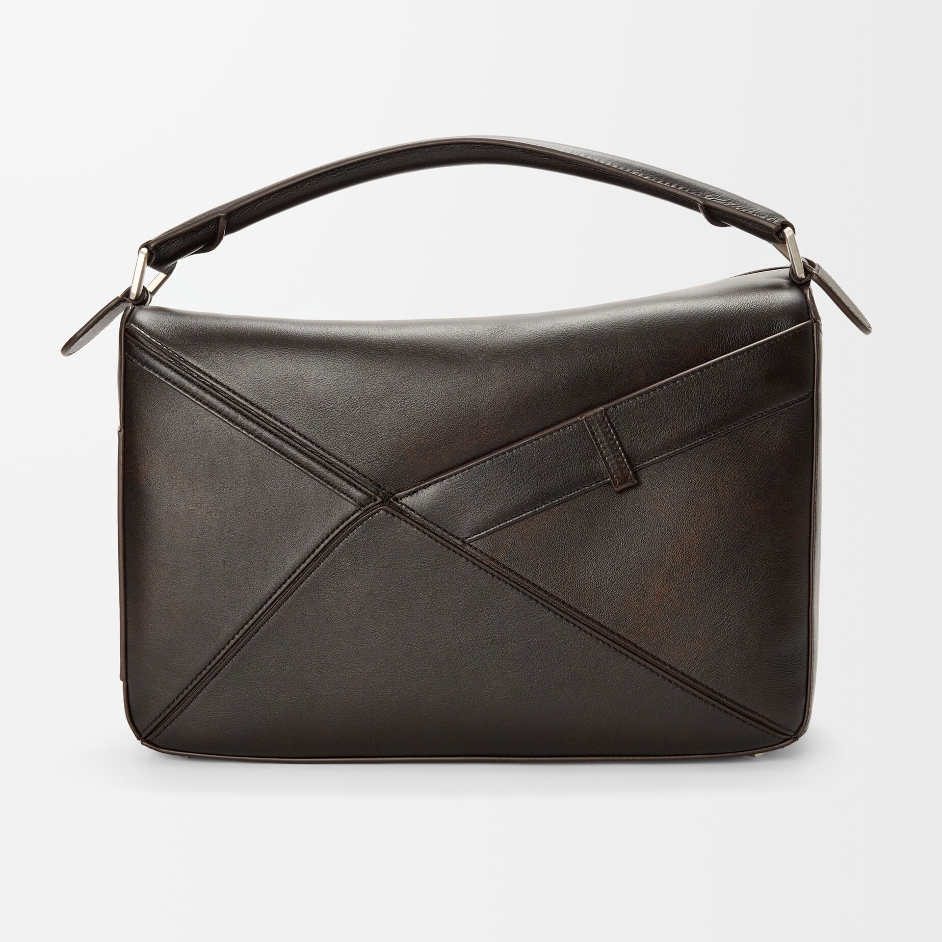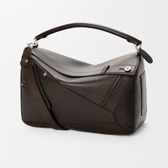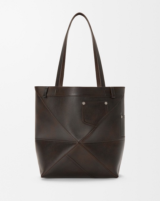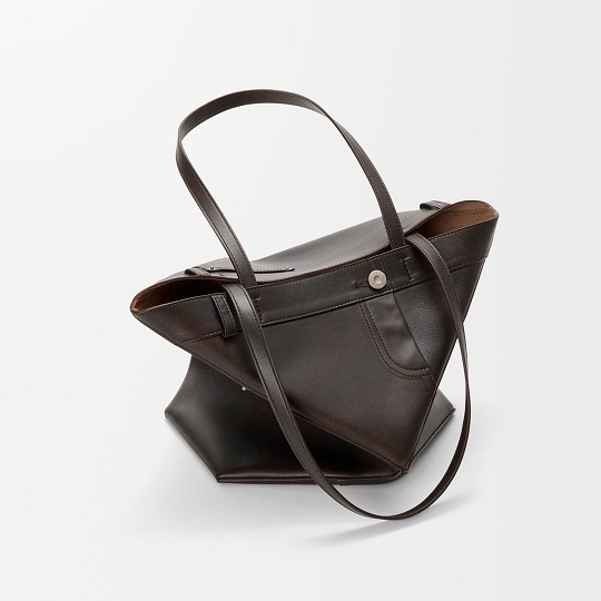 Puzzle Fold Panta 手袋采用布朗尼深棕色小牛皮制作而成,几何拼缝结构能够完全扁平折叠,源自牛仔裤的腰头和口袋细节为包包增添点睛。