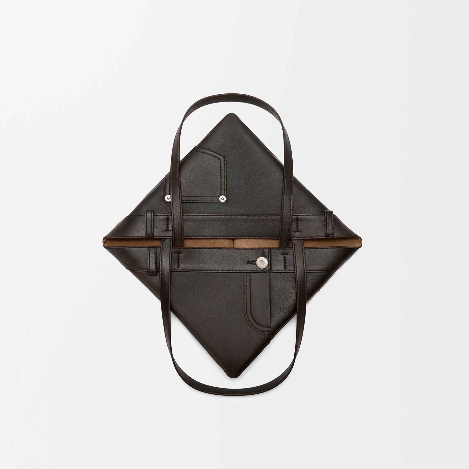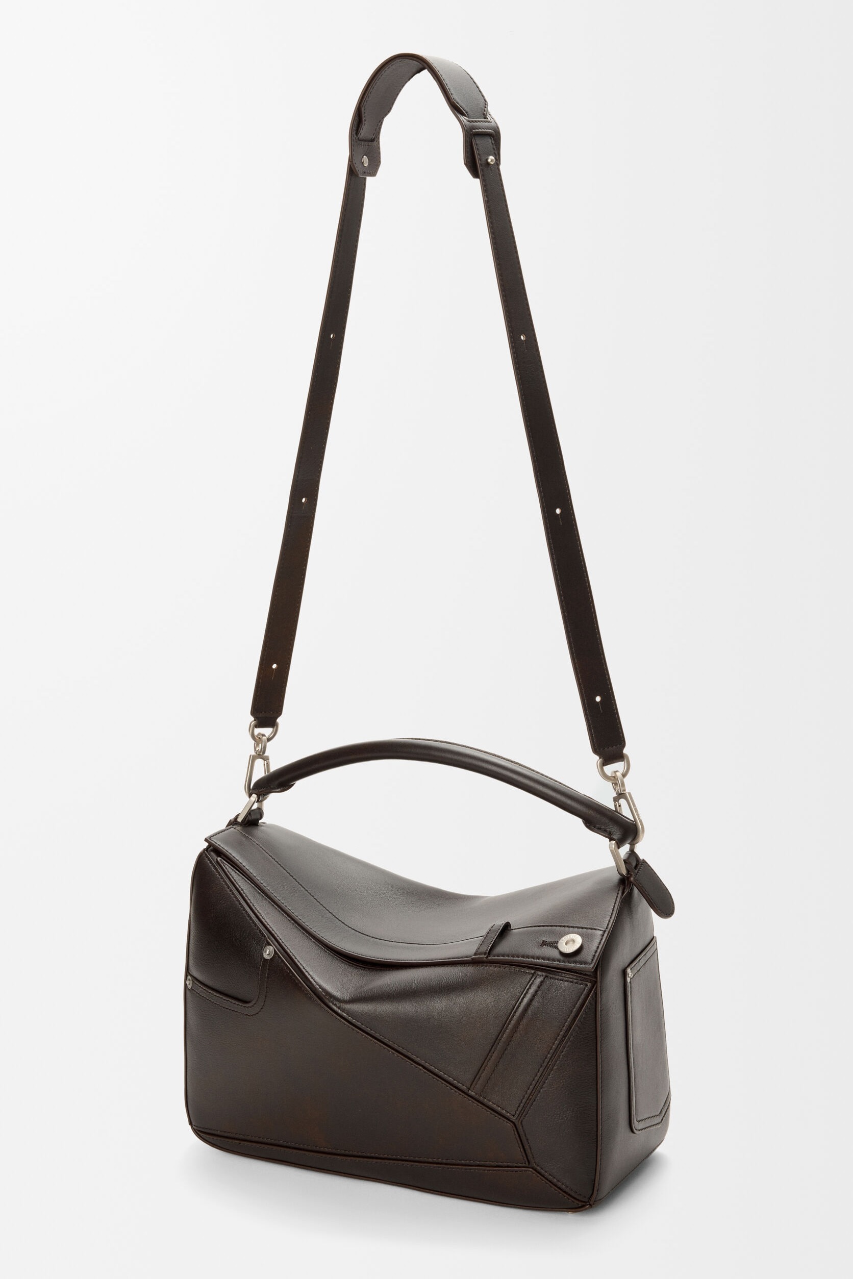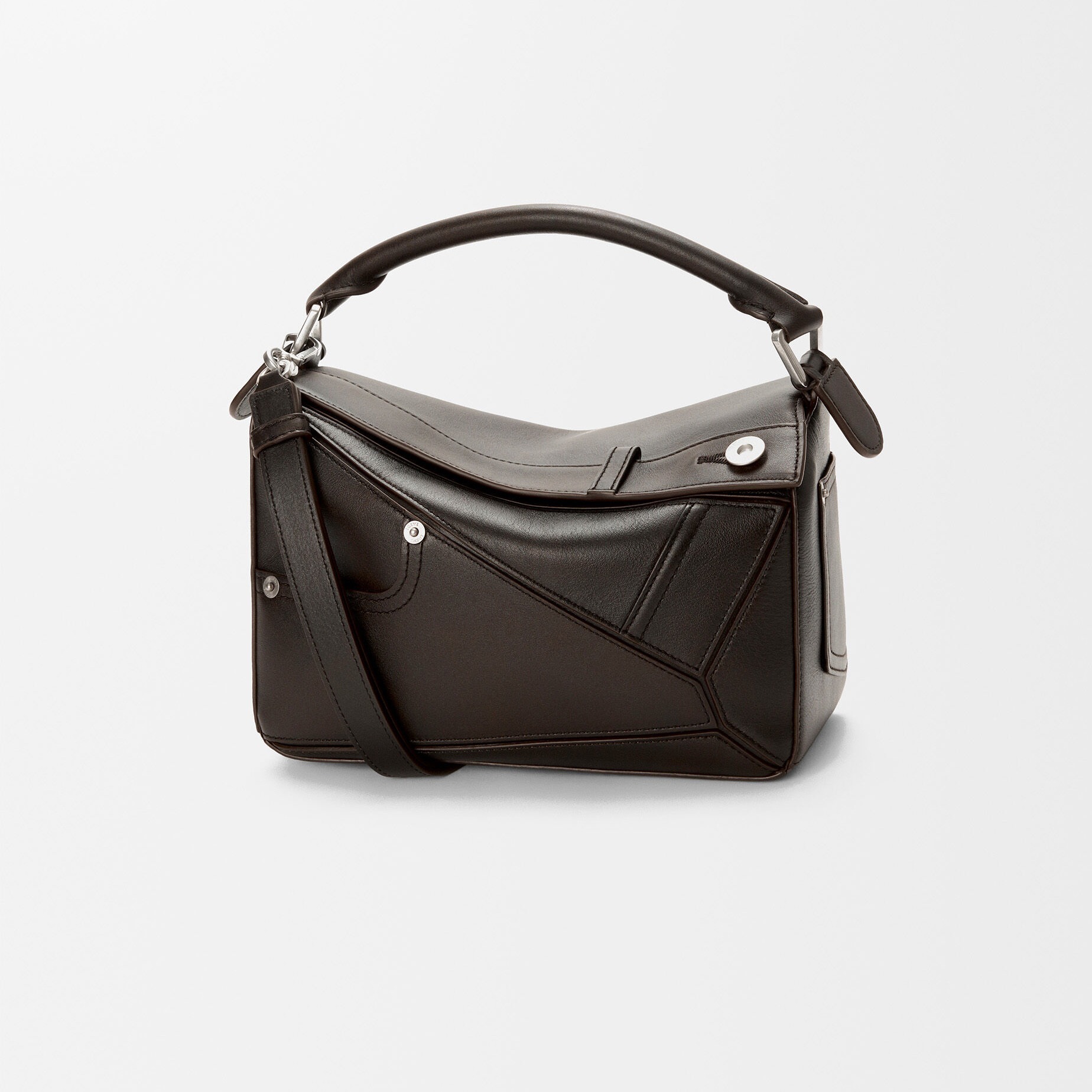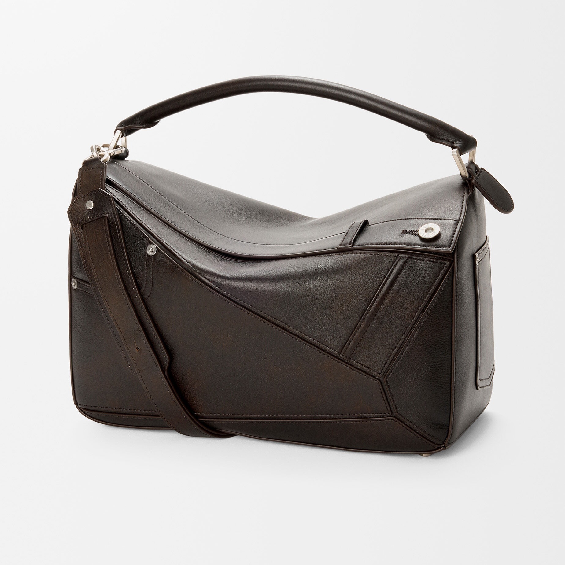Puzzle Fold Panta 手袋采用布朗尼深棕色小牛皮制作而成,几何拼缝结构能够完全扁平折叠,源自牛仔裤的腰头和口袋细节为包包增添点睛。