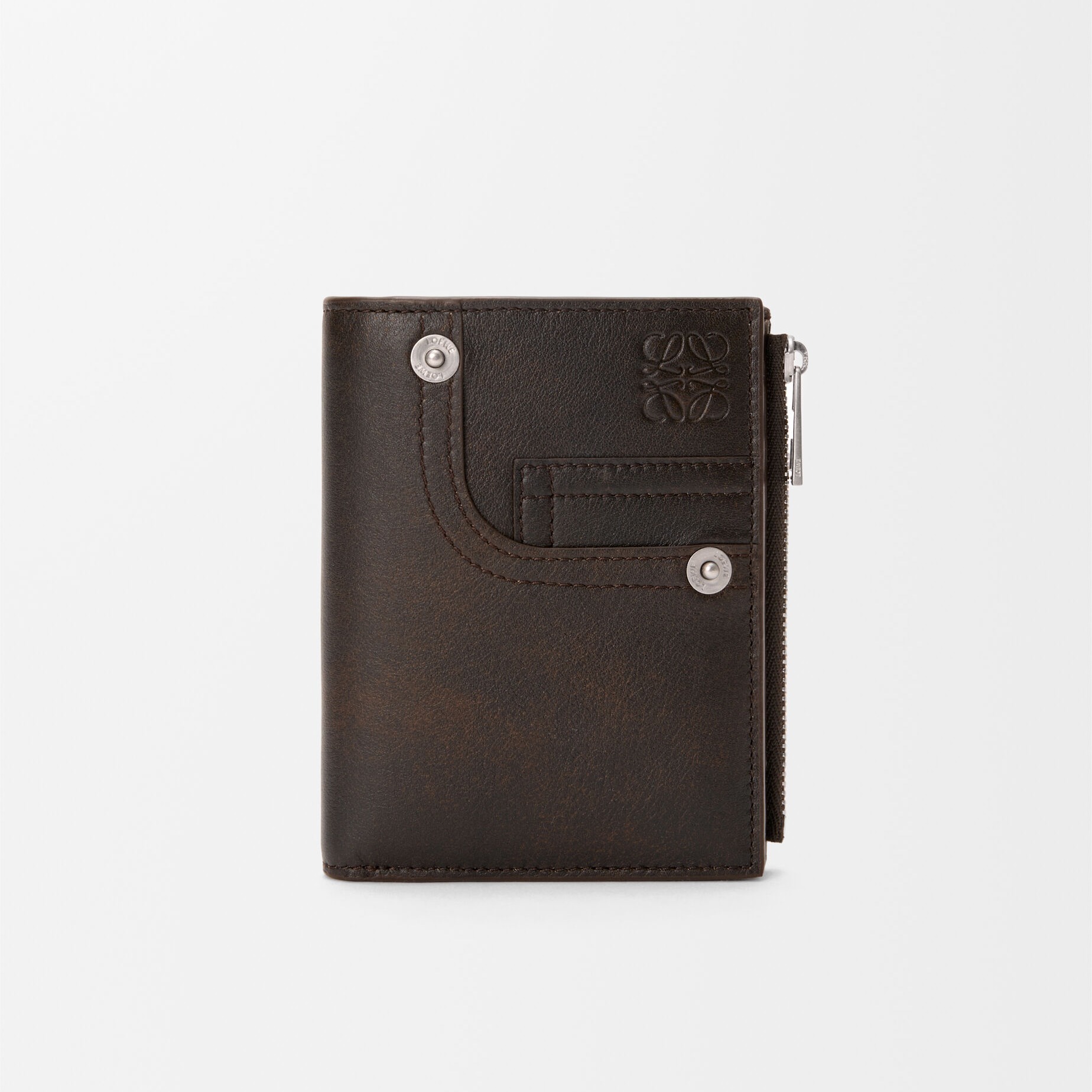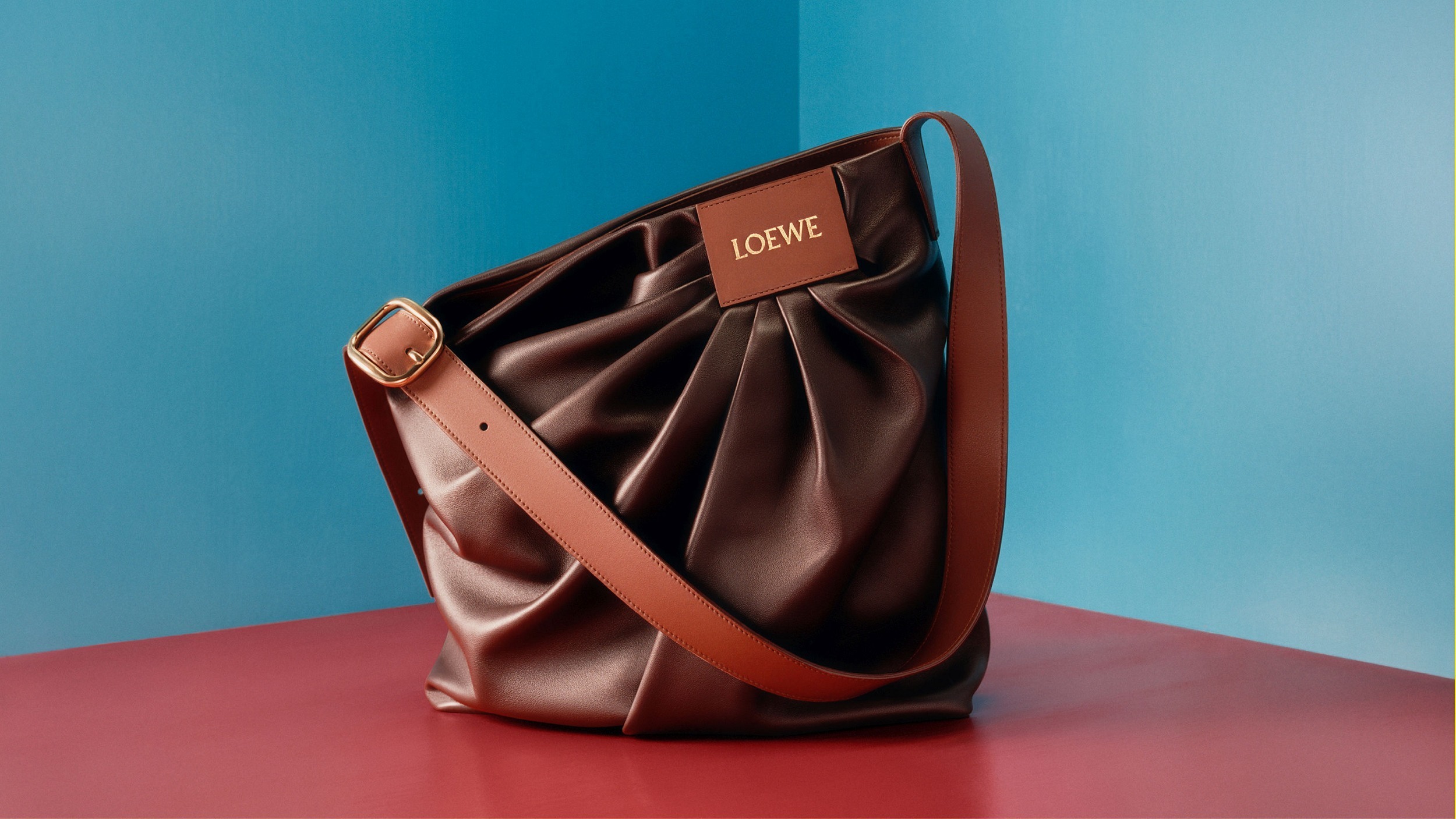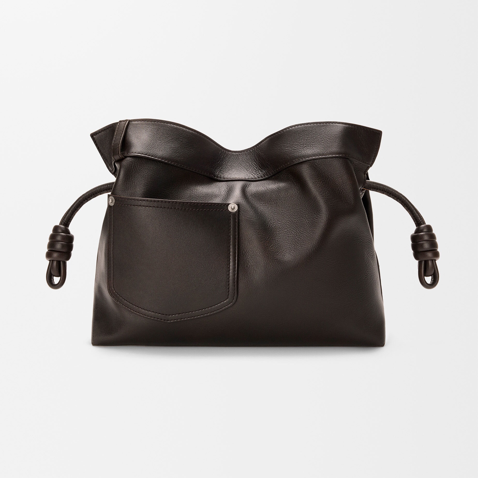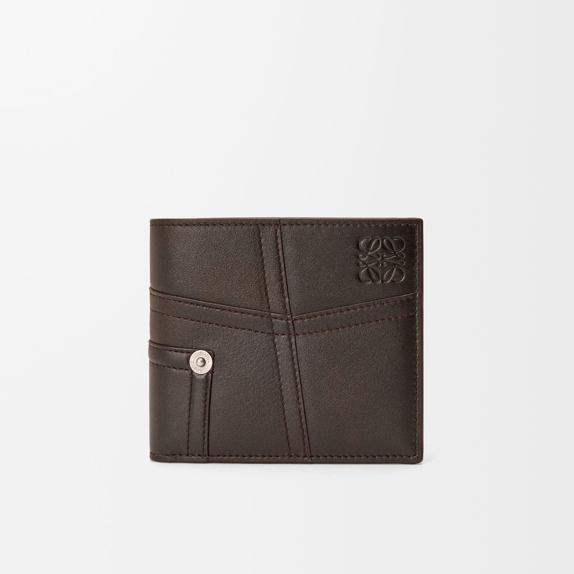 Puzzle Fold Panta 手袋采用布朗尼深棕色小牛皮制作而成,几何拼缝结构能够完全扁平折叠,源自牛仔裤的腰头和口袋细节为包包增添点睛。