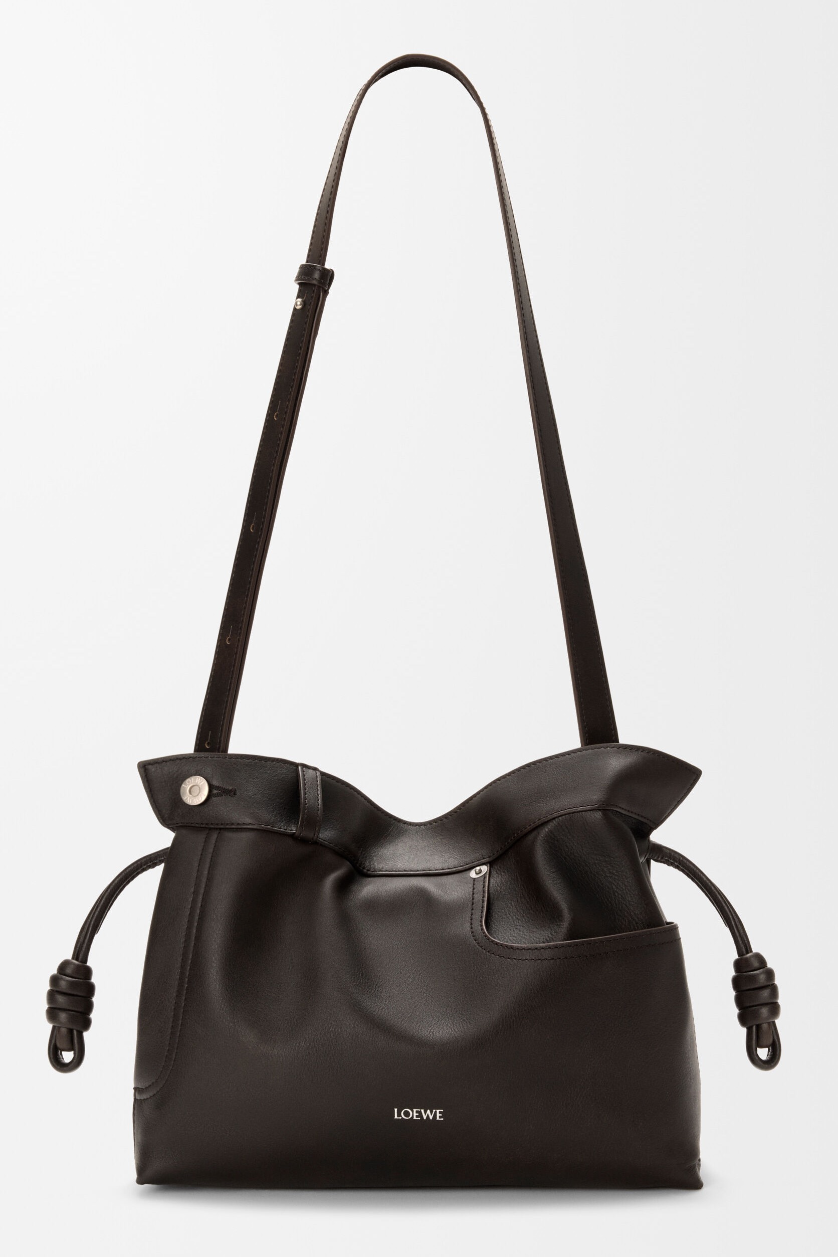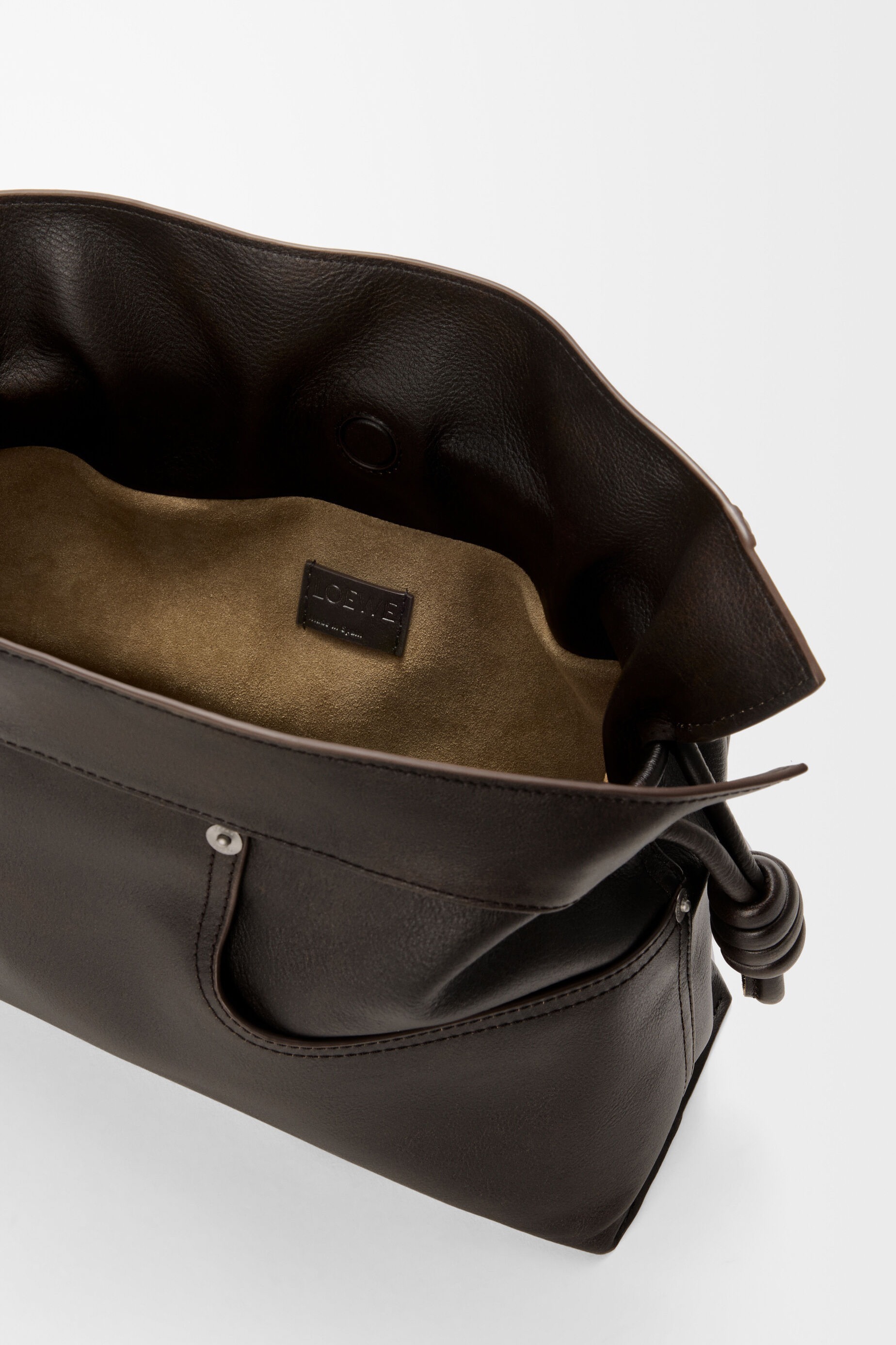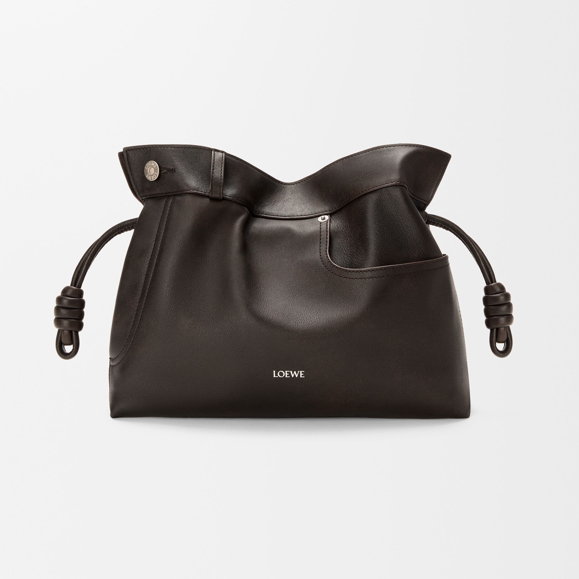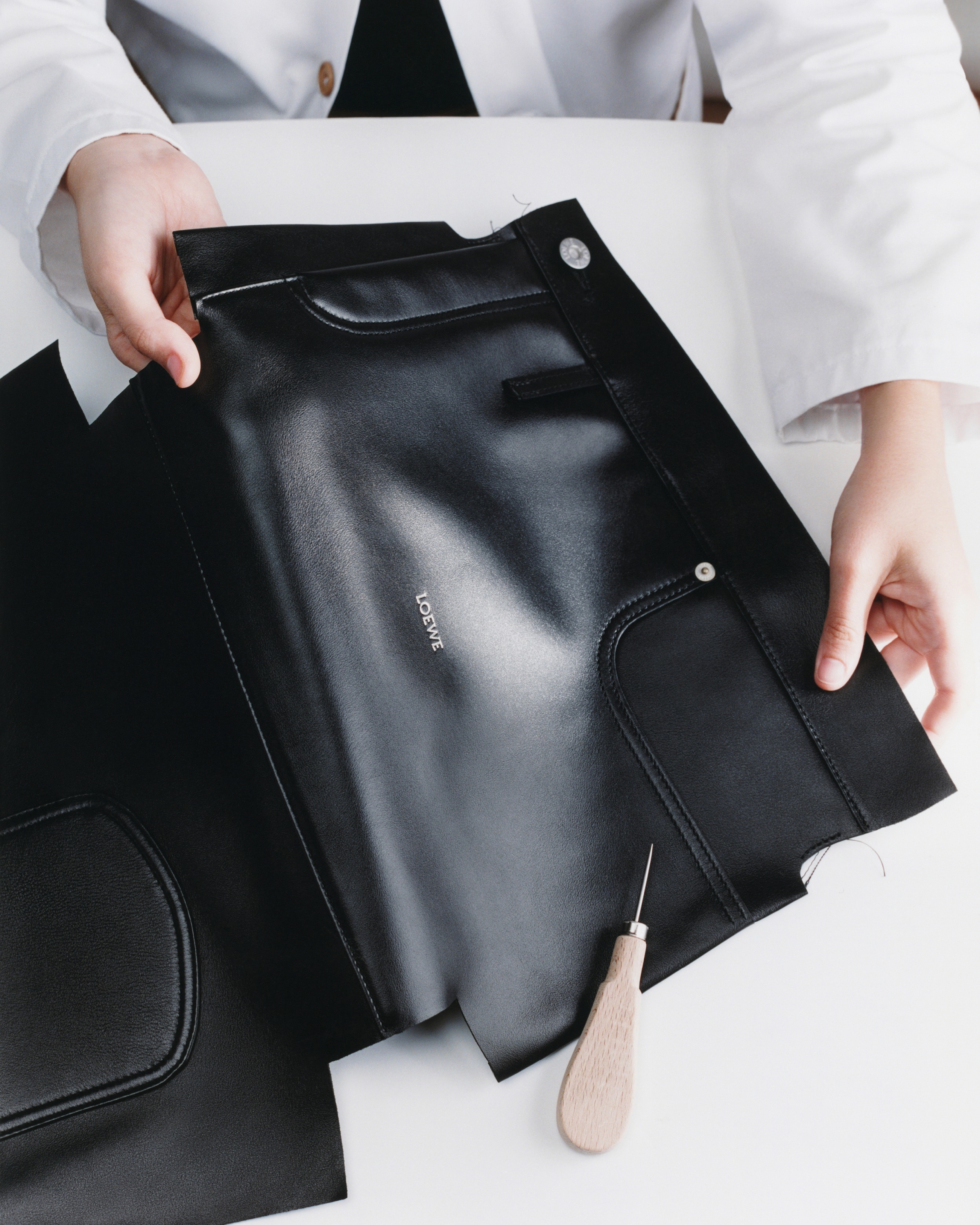 Panta 系列手袋从牛仔裤👖的制作工艺中汲取灵感,采用柔软细腻的亮面牛皮革为主要材质,搭配银色钉扣、拉链等金属饰件。每只 Panta Flamenco 手拿包由46块皮料拼缝而成,即使技艺娴熟的工匠也需要约20个小时制作,包包上饰有牛仔裤标志性的侧口袋、背面插袋、铆钉扣和腰袢等元素,两侧绳结装饰为包包增添灵动点缀。推出黑色和布朗尼深棕色2种配色,可拆卸肩带实现多样背法。