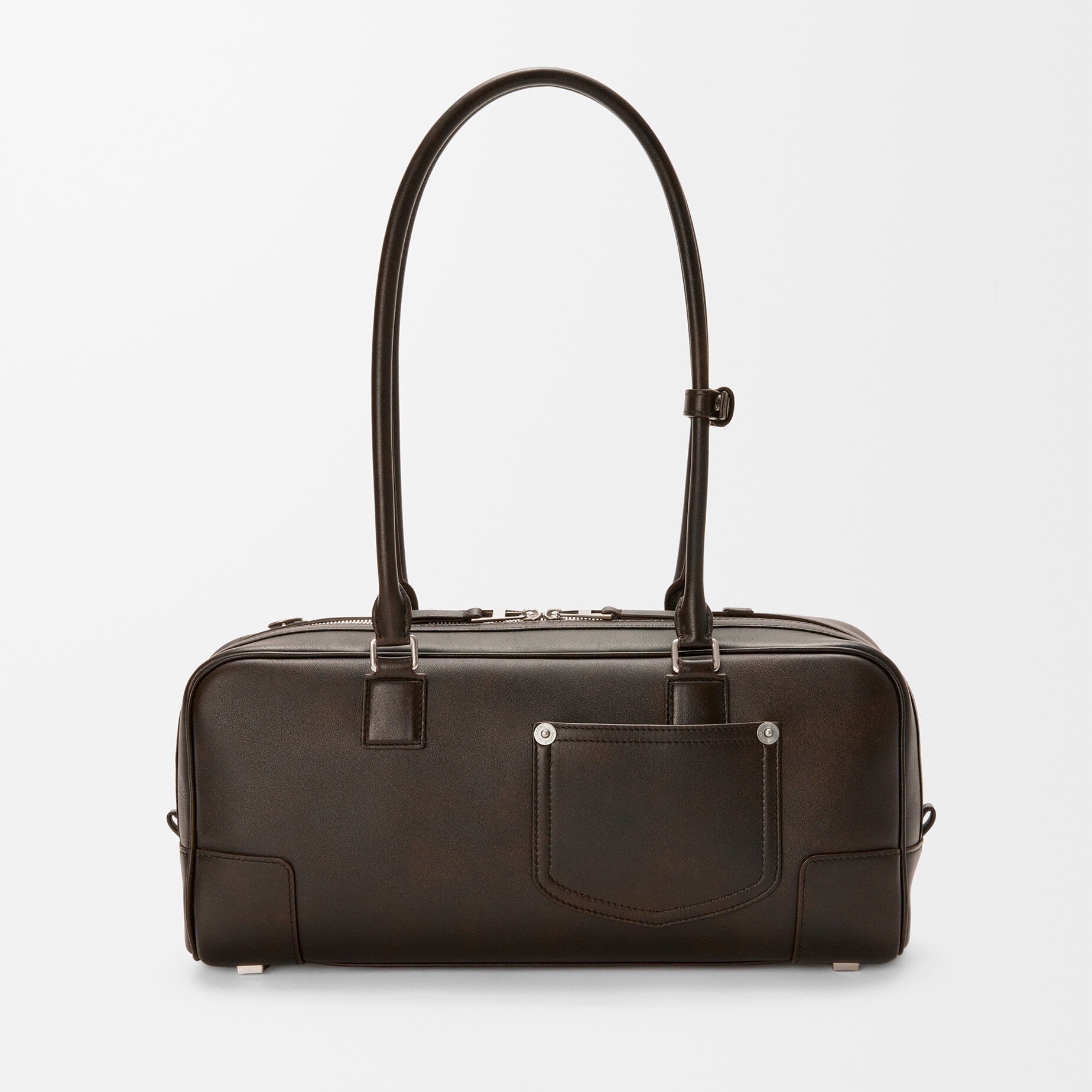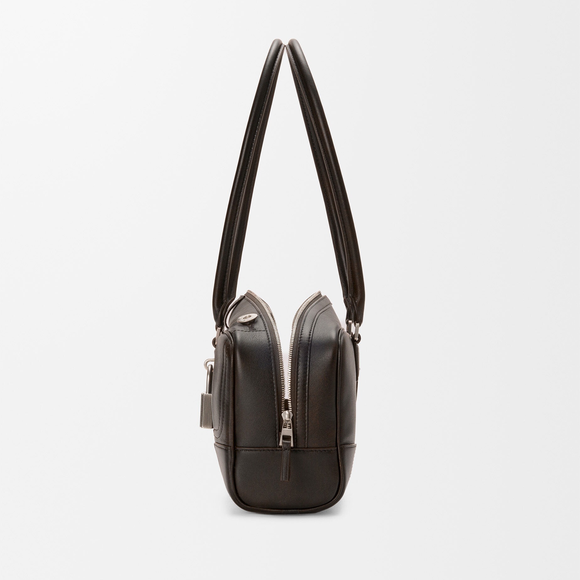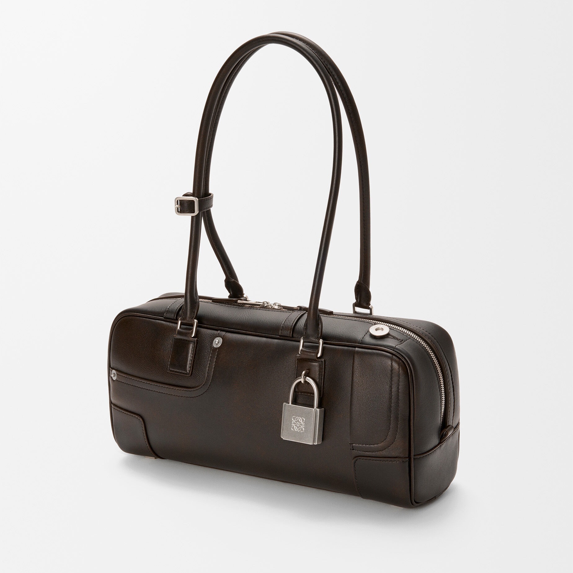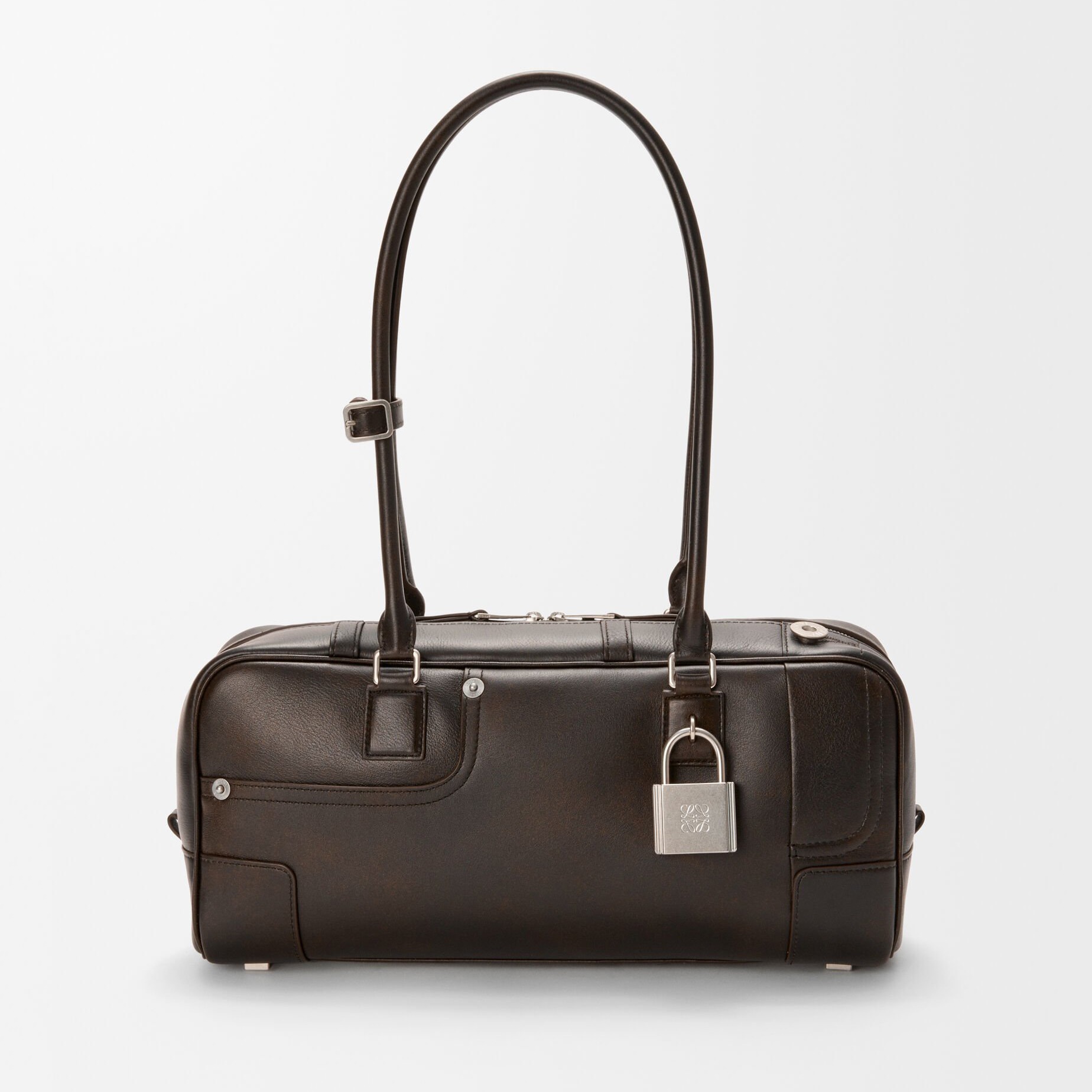 Panta Amazona 31 Cropped 手袋以复古保龄球包型搭配裤装剪裁细节,银色金属挂锁与铆钉扣、底部脚钉等五金饰件相呼应,纤长的管状皮革手柄可实现手拎、肩背等不同造型方式。