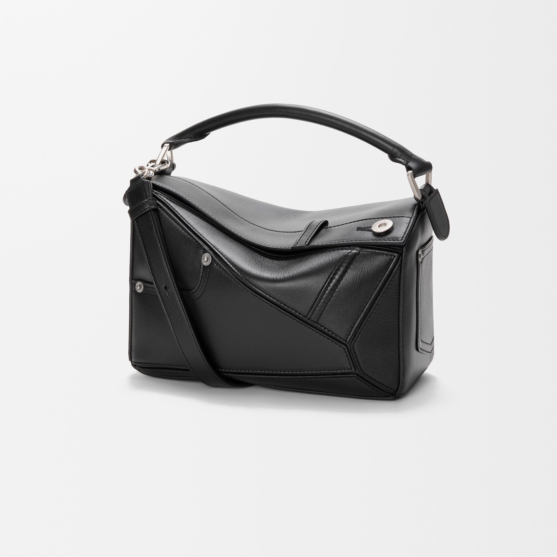 Panta Puzzle 系列推出小号和大号2种尺寸,包包标志性的几何廓形与牛仔裤的裁片巧妙融合,非对称的拼接结构呈现叛逆不羁格调。
