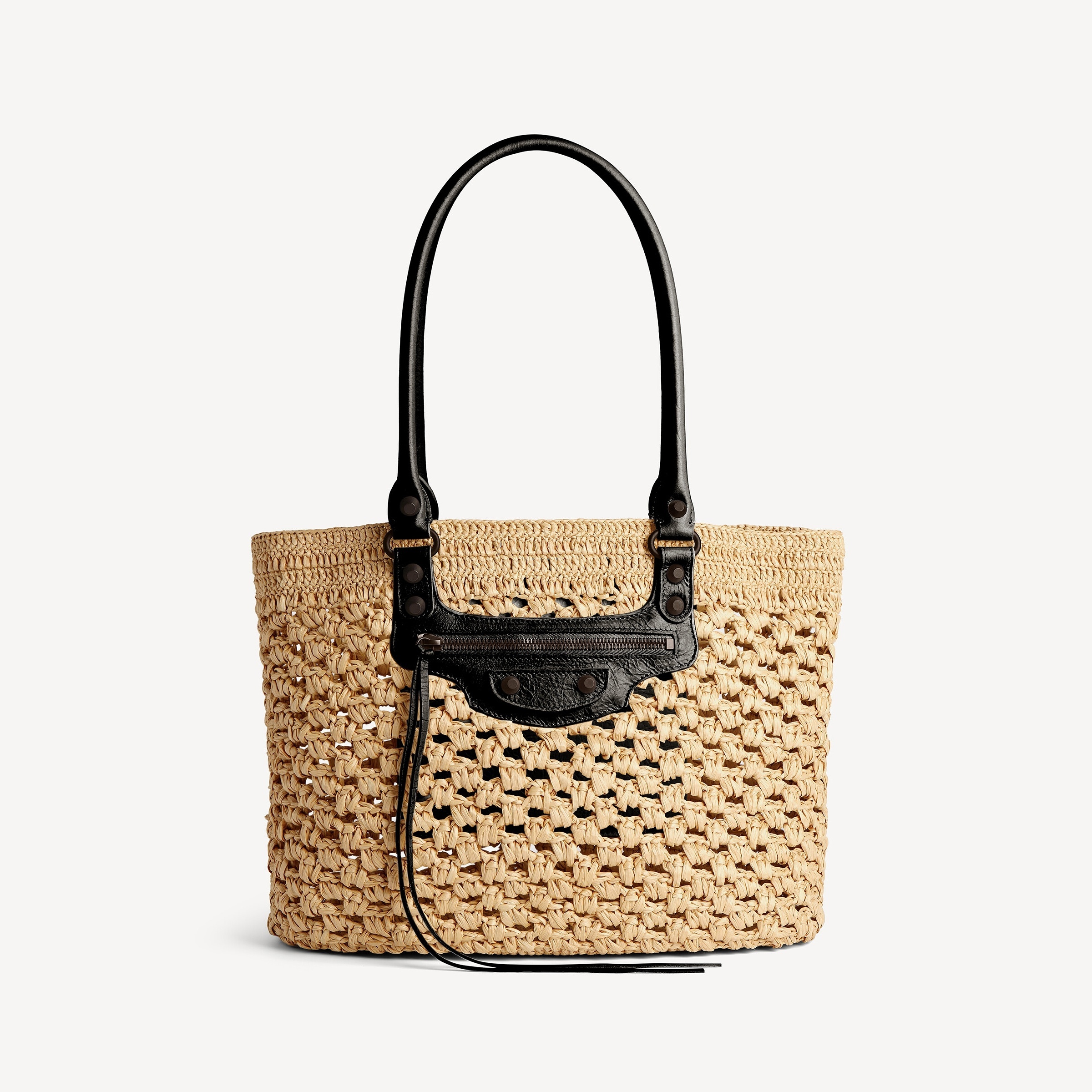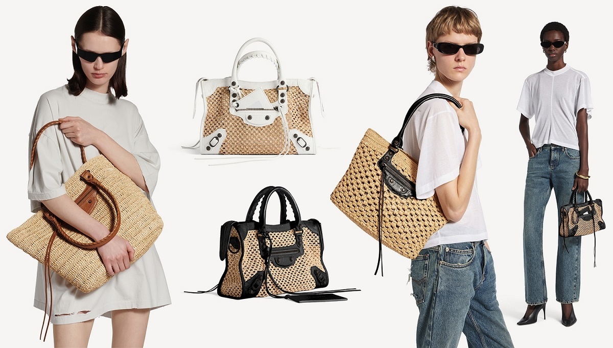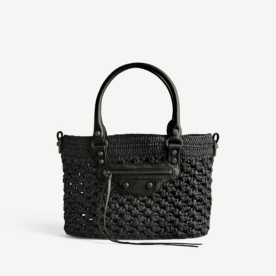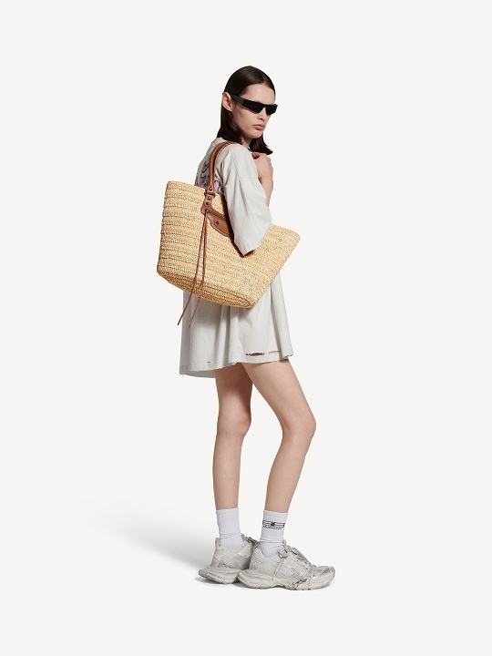 Le City Basket 提篮包推出中号和小号两种尺寸,焦糖色款式采用较为密实的编织手法,敞口式设计富有田园气息。其它款式均采用镂空编织技法,中号长手柄可手拎或者肩背。小号推出自然色草编包身搭配黑色或白色皮革饰边款,以及 all black 全黑色款式,配有可拆卸的长肩带,可解放双手斜挎上身,不管是海滨度假还是城市漫步,都散发着一种把自由和海风装在包里的轻盈感。