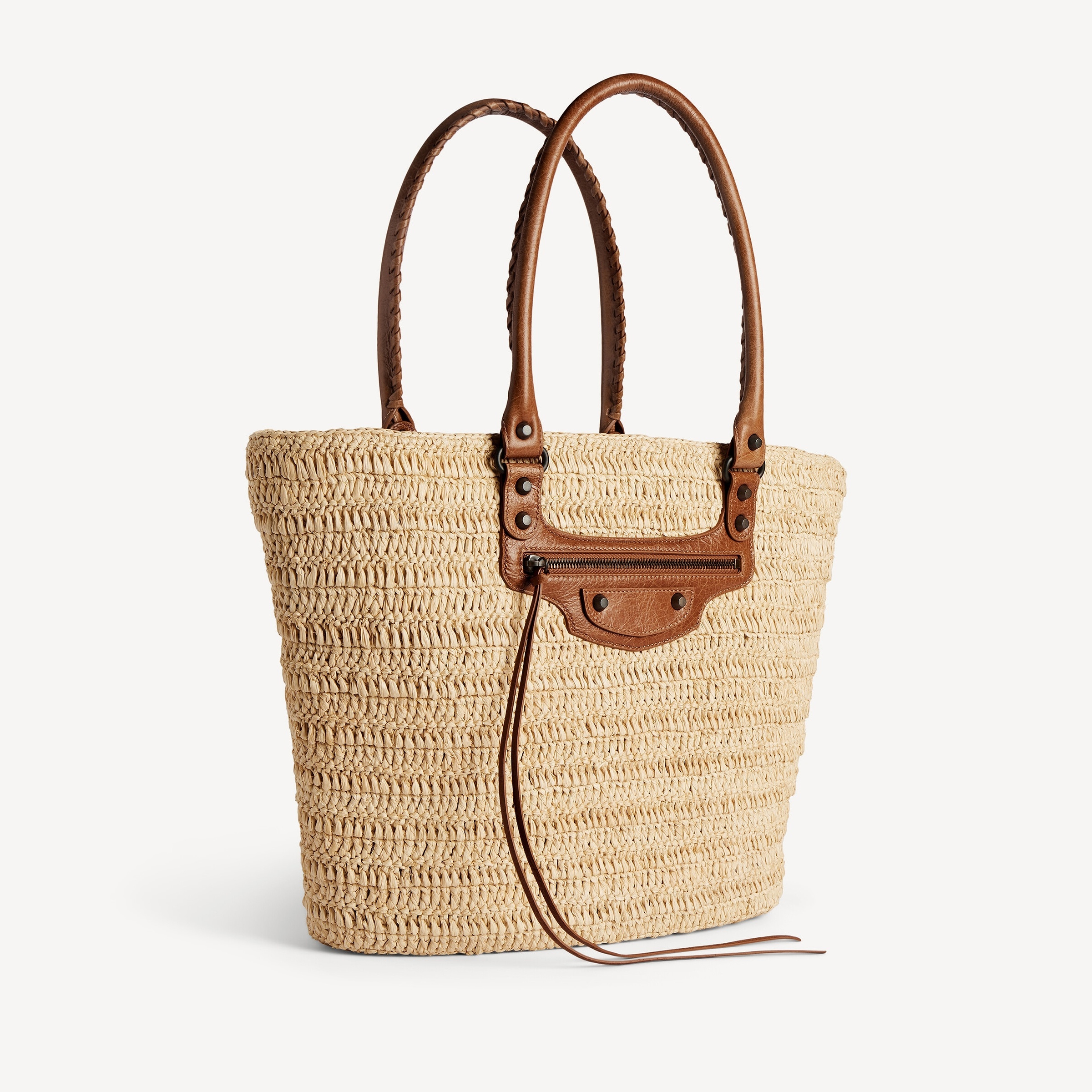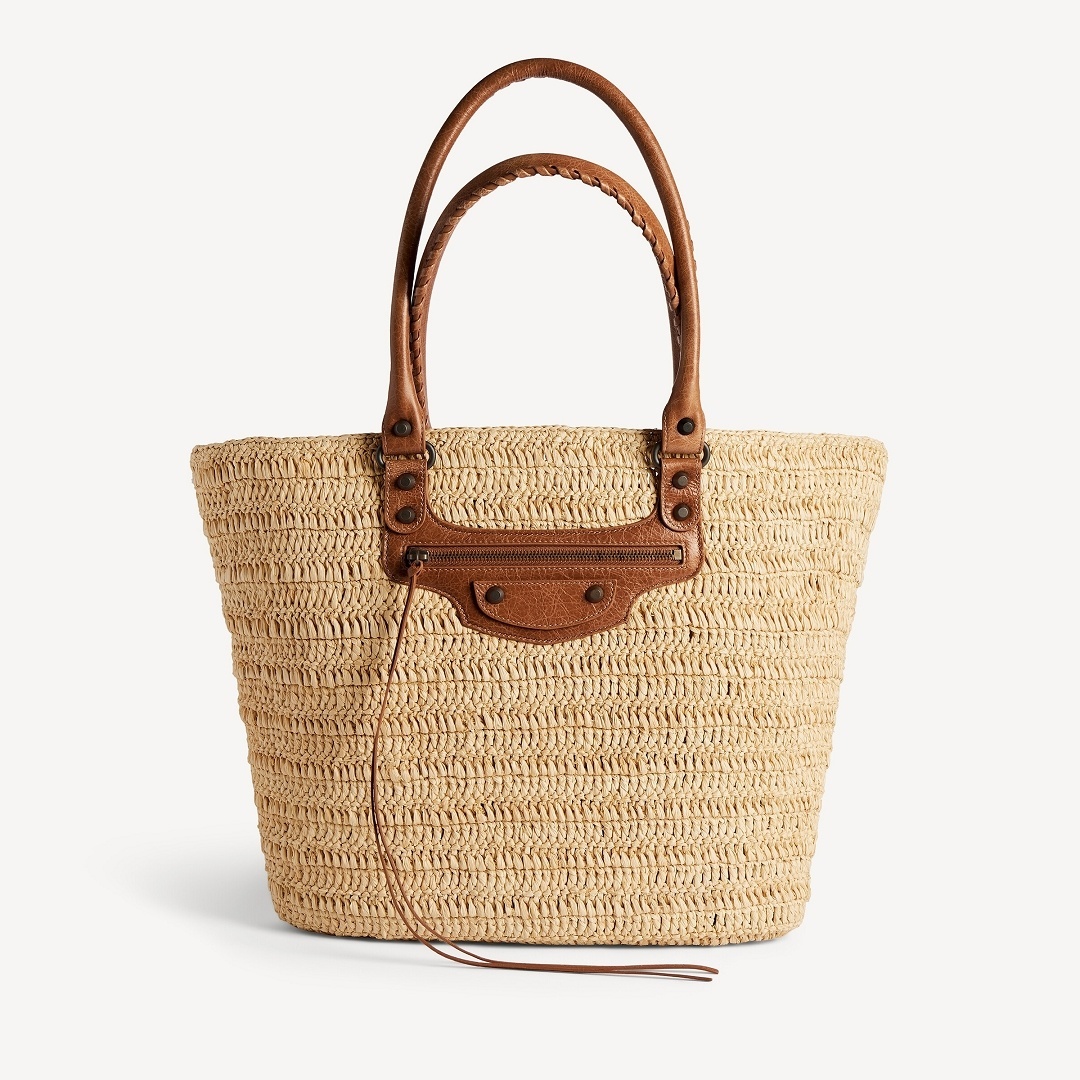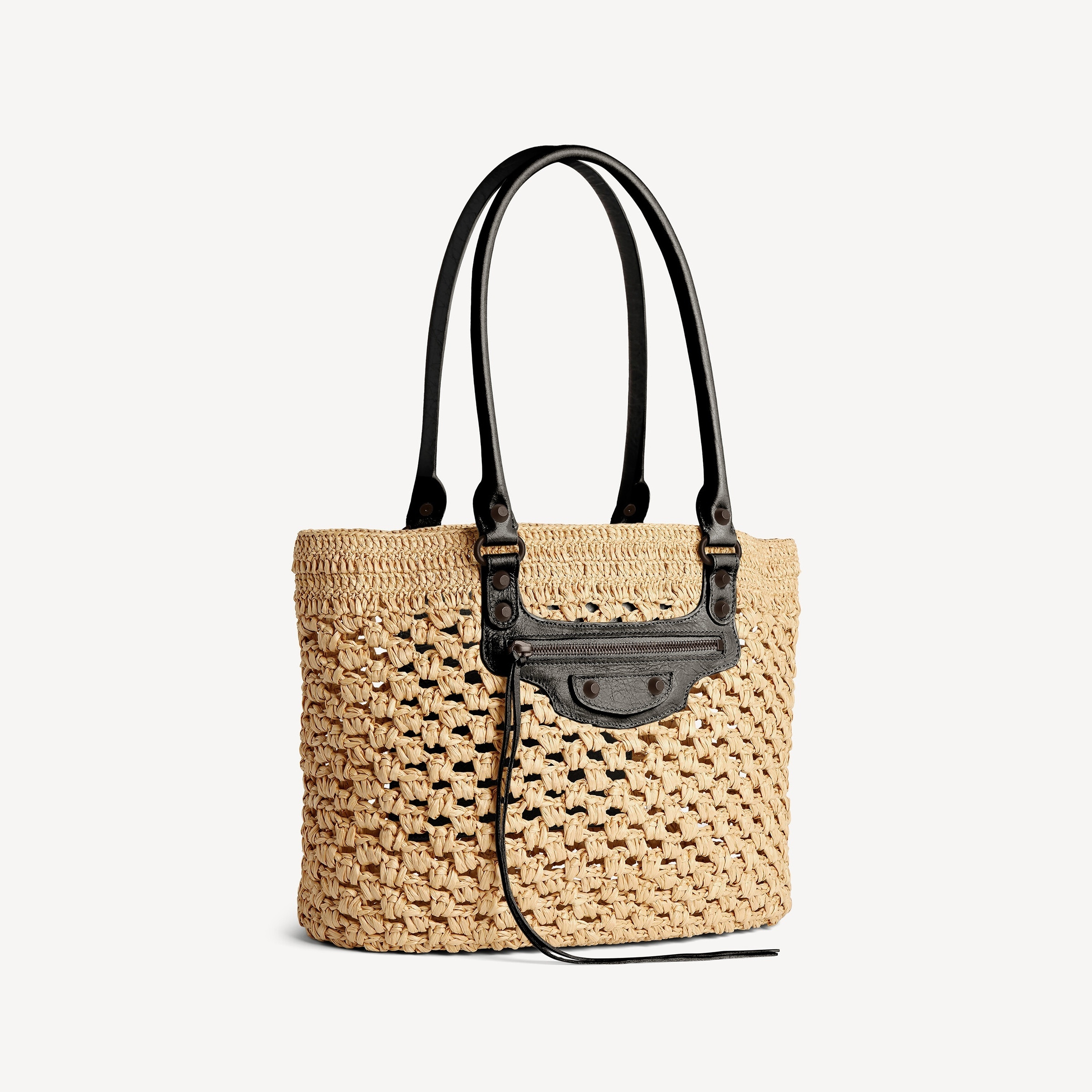 Le City Basket 提篮包推出中号和小号两种尺寸,焦糖色款式采用较为密实的编织手法,敞口式设计富有田园气息。其它款式均采用镂空编织技法,中号长手柄可手拎或者肩背。小号推出自然色草编包身搭配黑色或白色皮革饰边款,以及 all black 全黑色款式,配有可拆卸的长肩带,可解放双手斜挎上身,不管是海滨度假还是城市漫步,都散发着一种把自由和海风装在包里的轻盈感。
