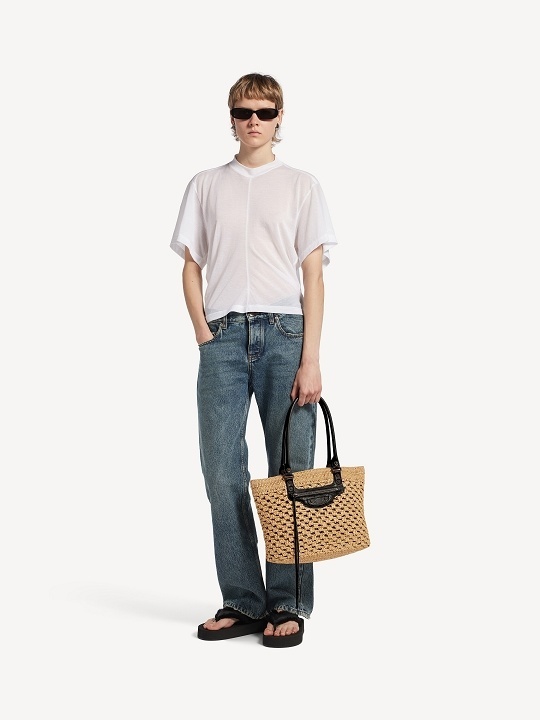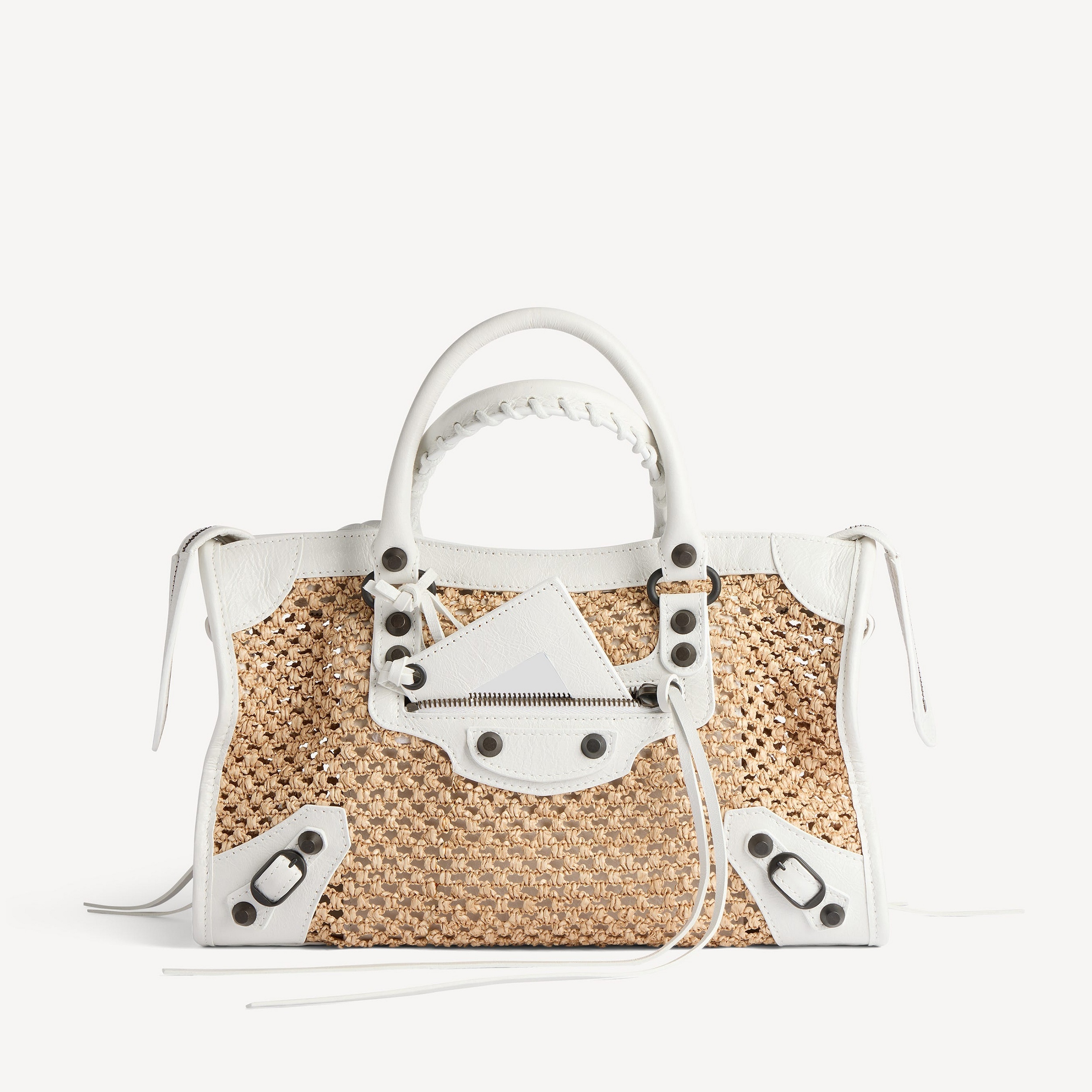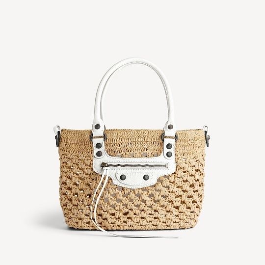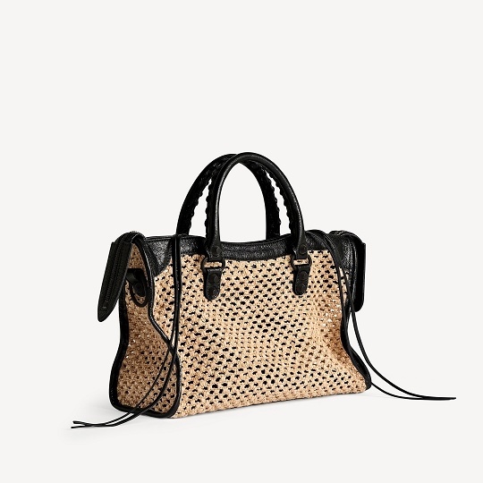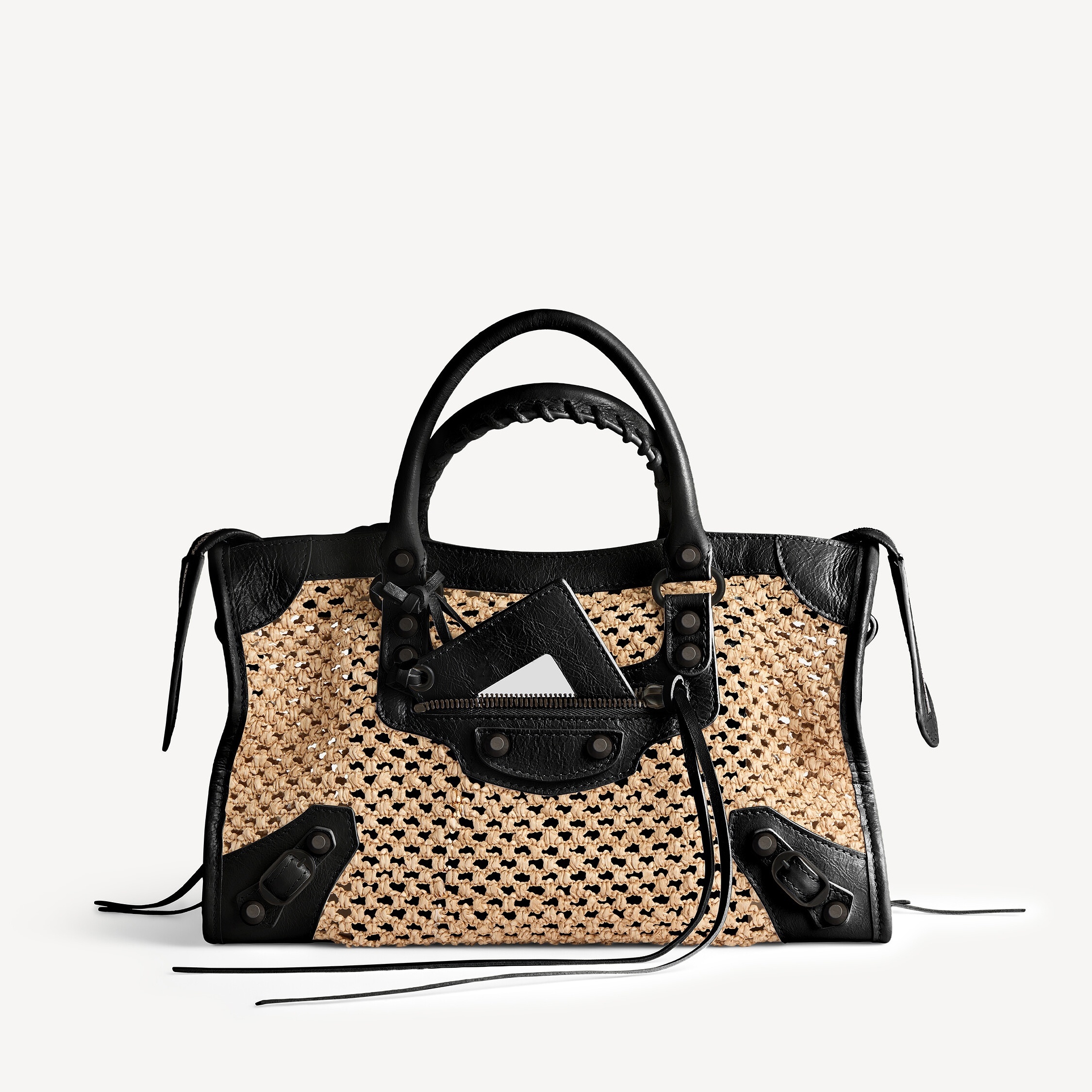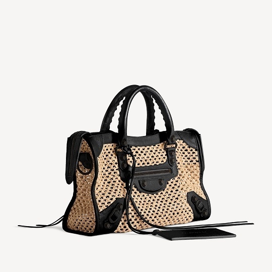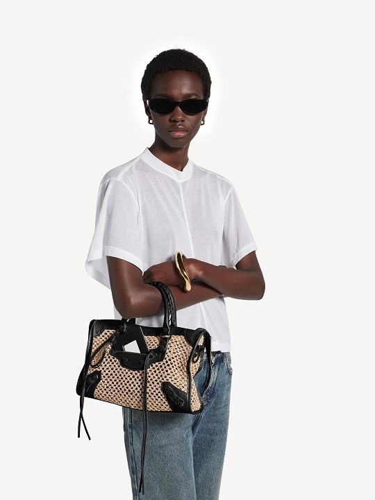 草编版 Le City 手袋有种既粗犷又慵懒的反差感,轻盈透气的编织包身搭配细纹羊皮革饰边、金属铆钉、编织提手、皮革拉链须、方形悬挂镜等机车包标志性元素,推出白色和黑色两种配色,颞部设有同色系拉链内袋和金属铭牌,在镂空纹理下若隐若现,自然系材质描摹闲适假日格调。
