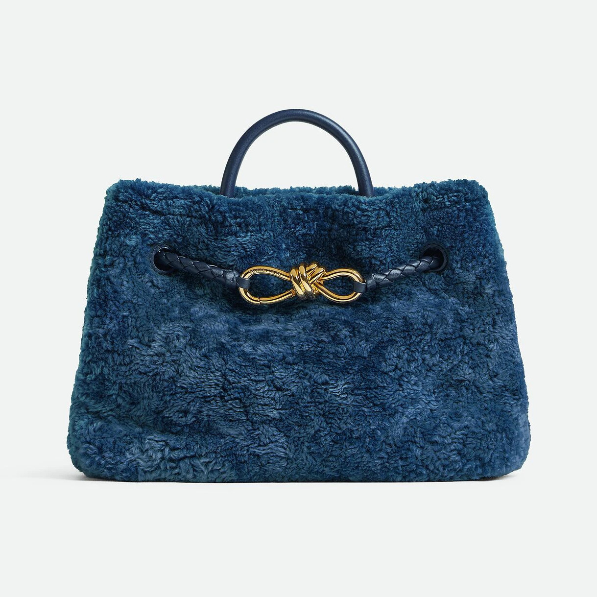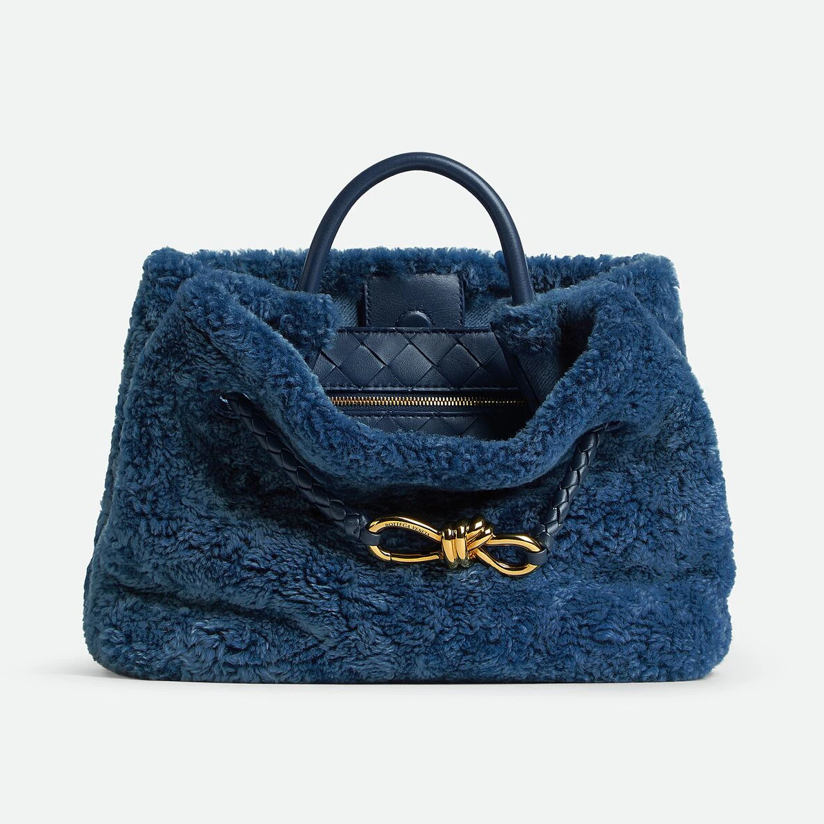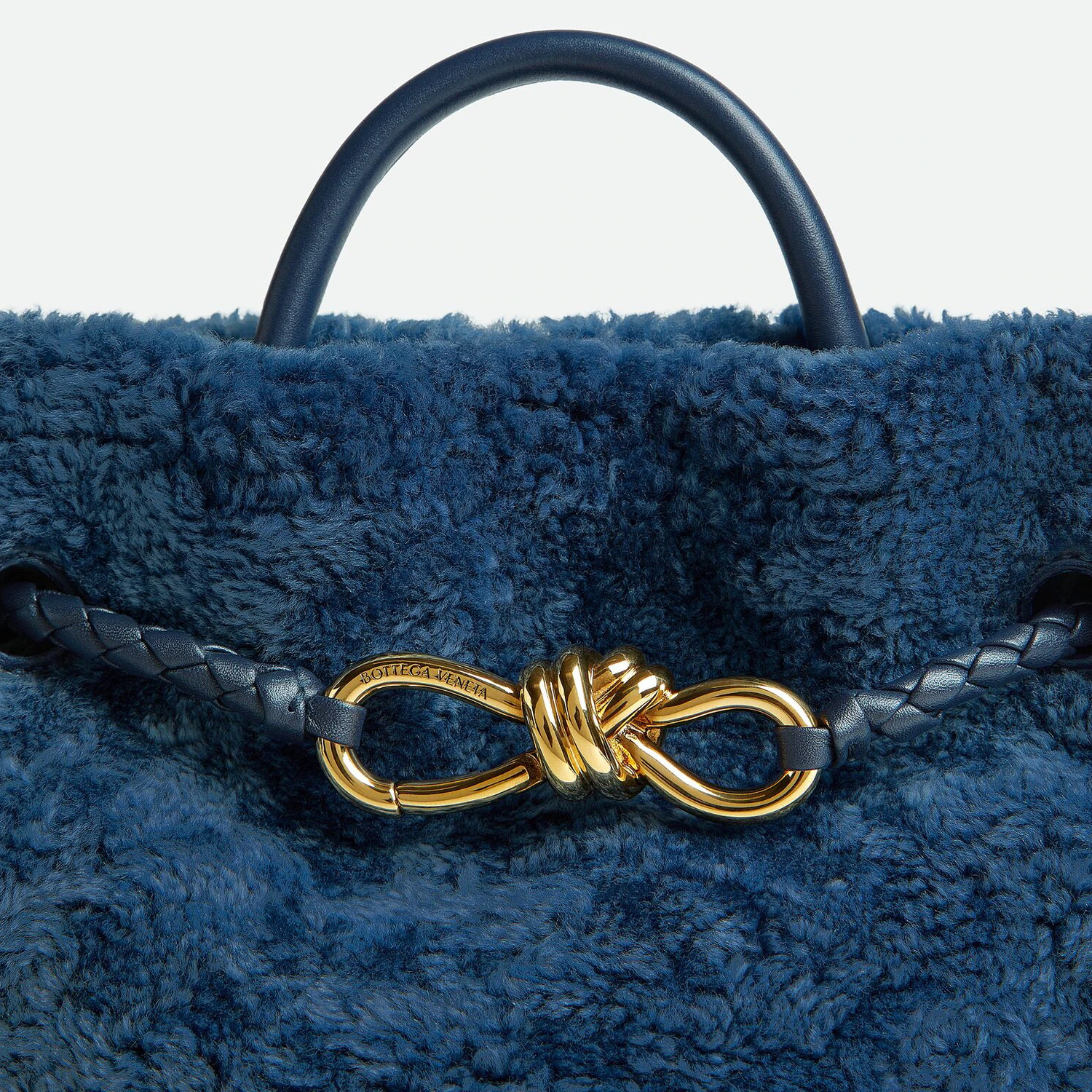 Andiamo 小号包包也换上海洋蓝色美利奴剪羊毛新衣,一枚金色绳结锁扣成为点睛,有如夜幕中的闪耀灯火。包包采用双层内置空间,包口自然垂耷时巧妙露出内部编织皮革细节。