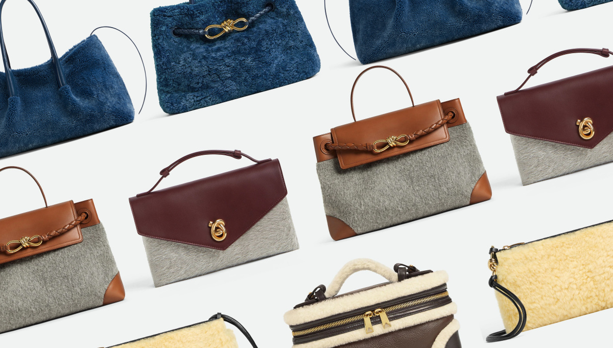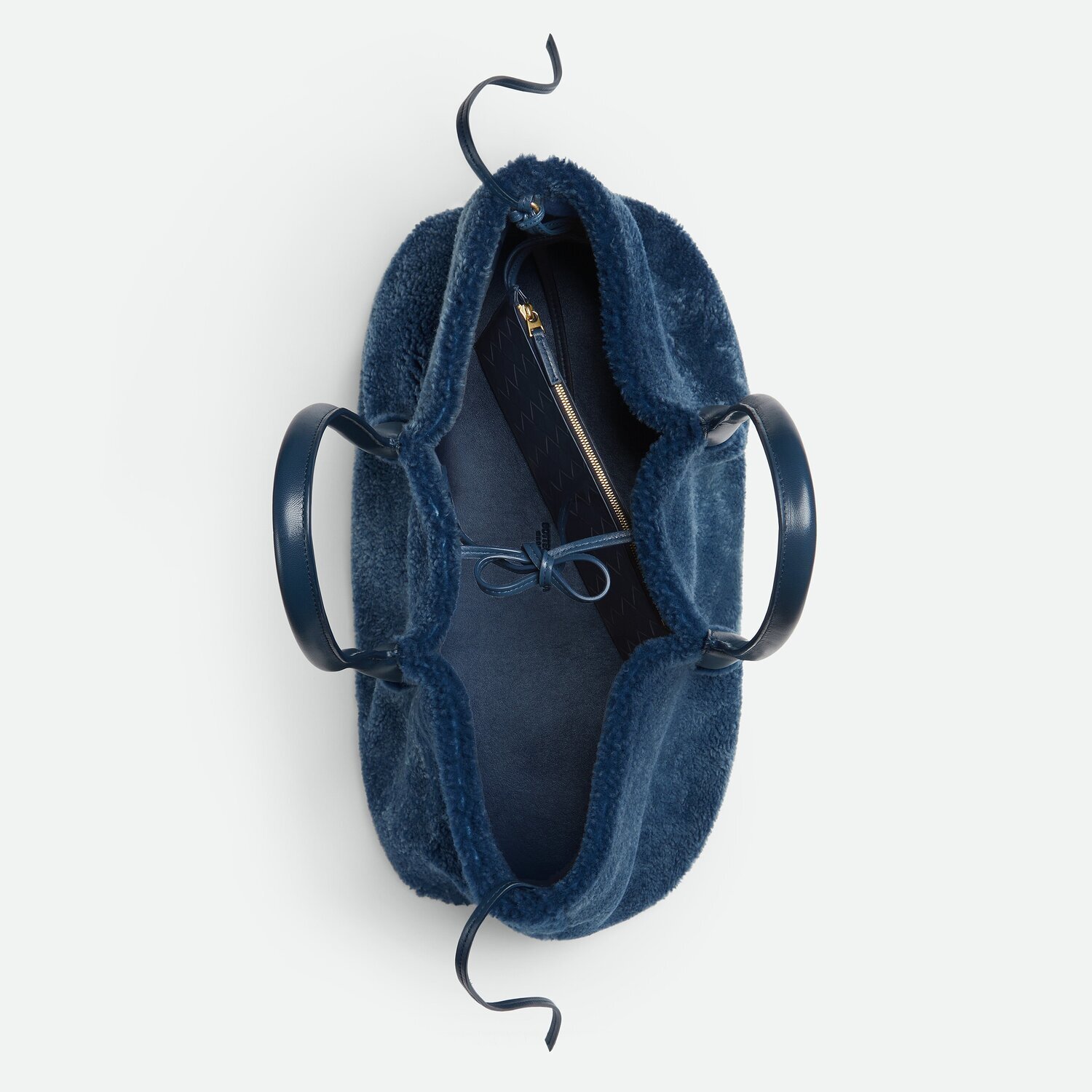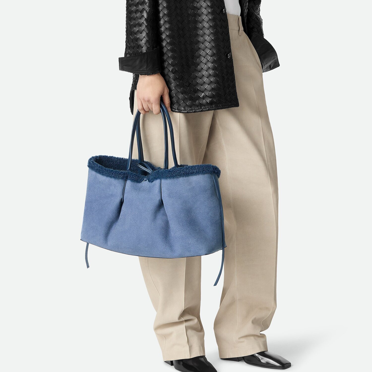 Andiamo 小号包包也换上海洋蓝色美利奴剪羊毛新衣,一枚金色绳结锁扣成为点睛,有如夜幕中的闪耀灯火。包包采用双层内置空间,包口自然垂耷时巧妙露出内部编织皮革细节。